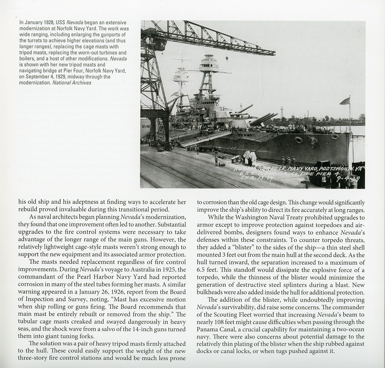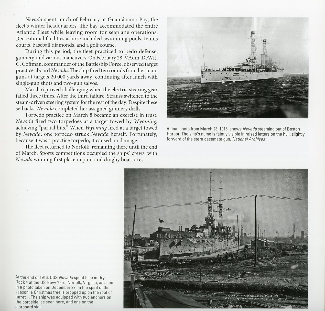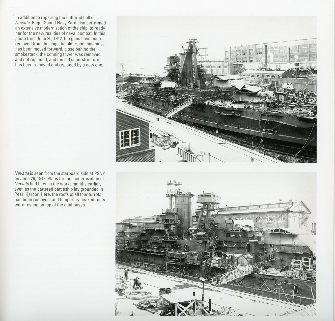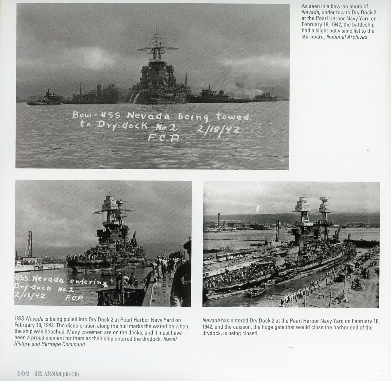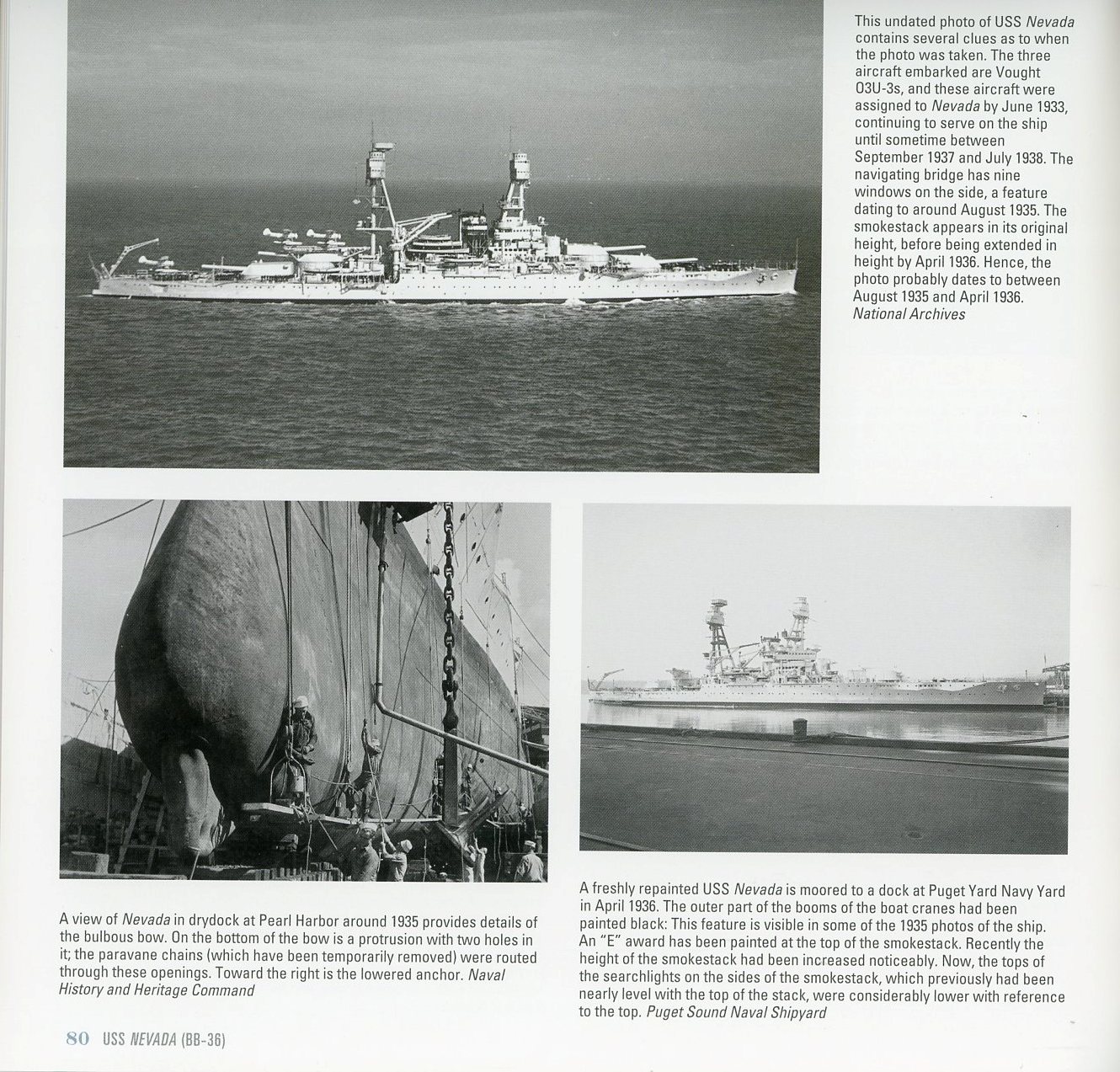 The first 30+ pages of the book deal with Nevada's origins - from design to construction, launching and trial. The next 30+ pages cover her pre-modernization career, in all her cage-masted glory. There are some really cool photos in this section of the book, especially close ups of the cage masts and spotting tops. The next two chapters cover her rebuild from cage masts to tripods, and her pre-Pearl Harbor service in the fleet. Nevada was extensively photographed during and after the Pearl Harbor Raid, and a large number of photos of her during the attack and it's aftermath, are included. There are two interesting photos included of her rebuild at Puget Sound in 1942, which I've never seen before. The rest of the book mostly deals with Nevada's service in World War II, after her repairs, documenting her exploits in both the Pacific and Atlantic. The last 20+ pages deal with her service as a target at the atomic bomb tests, and her subsequent sinking as a target in 1948. |