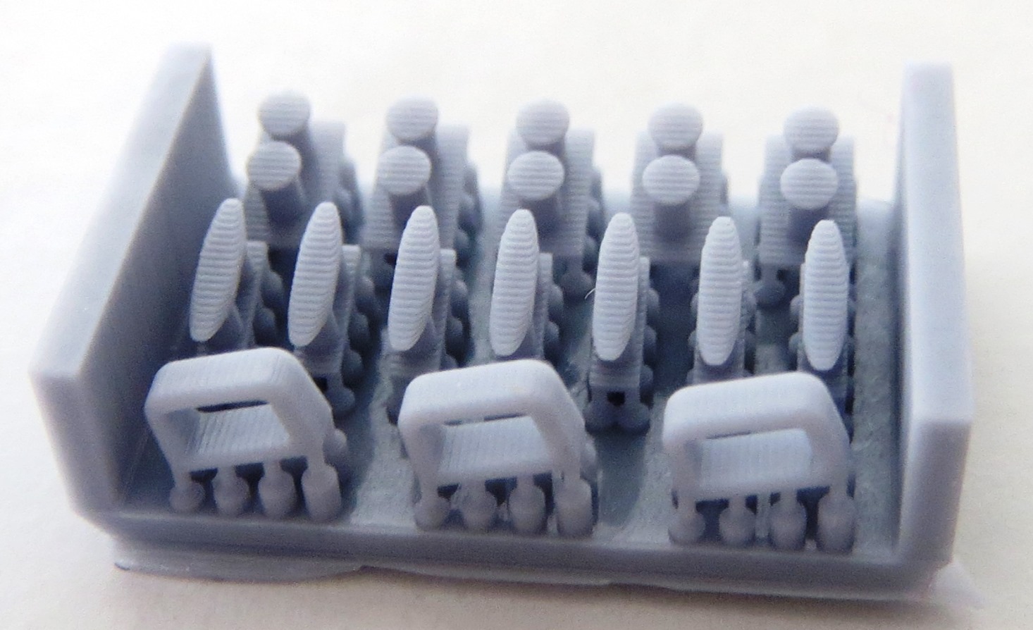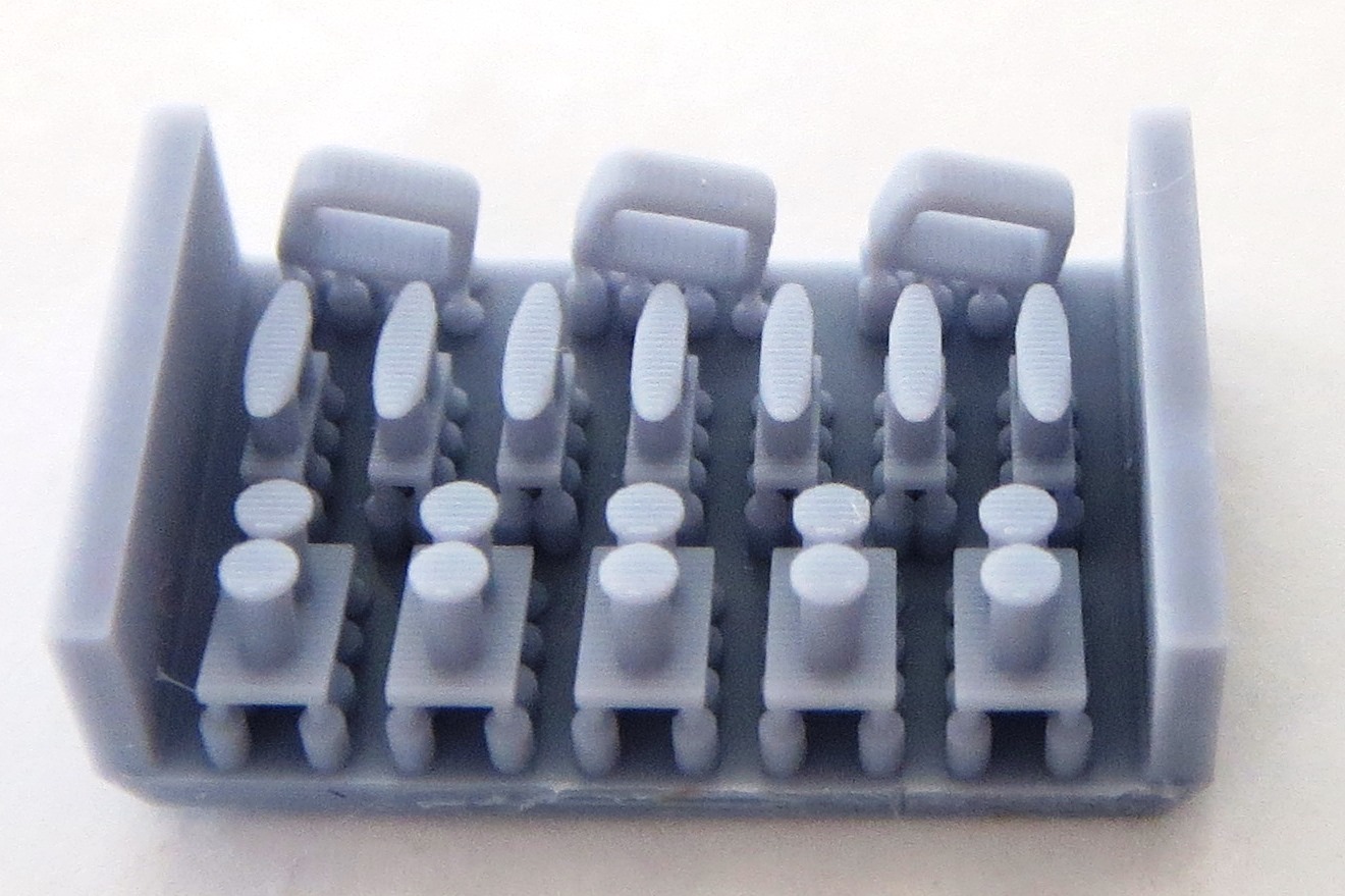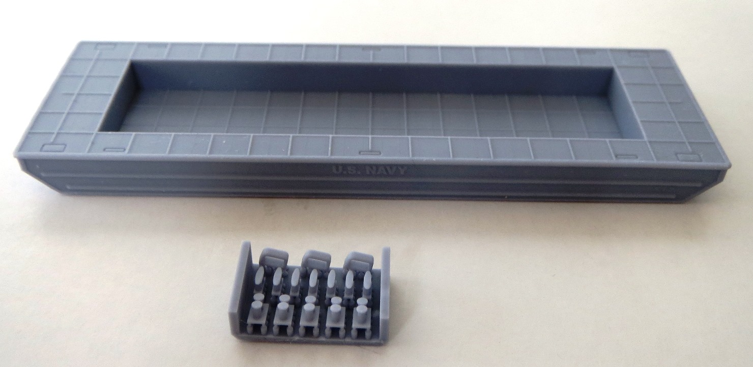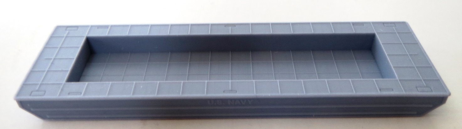 The barge is nicely done with side strakes, flat bottom and shallow outlined location markers for the various parts that are to be fitted. In 1:350 scale, the barge should measure 3.77 inches and the model barge approximately that. The scale width should be 1.10 inches but the model barge is a wee bit more at about 1.18 inches, but that is a minor discrepancy in my opinion. The small raft of 3D printed parts includes mooring bitts, cleats and chocks and are well done and have tiny attachment points for easy removal. Closeup in the photos you can see some print lines, but in actual size and painted, they will not be visible. One extra of each part is provided in case of loss or damage. |