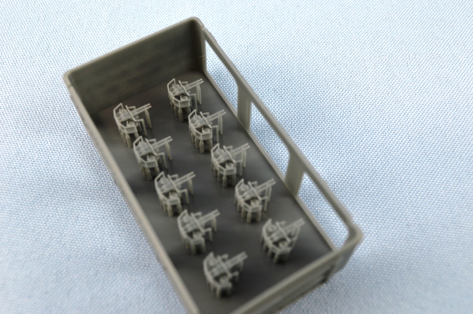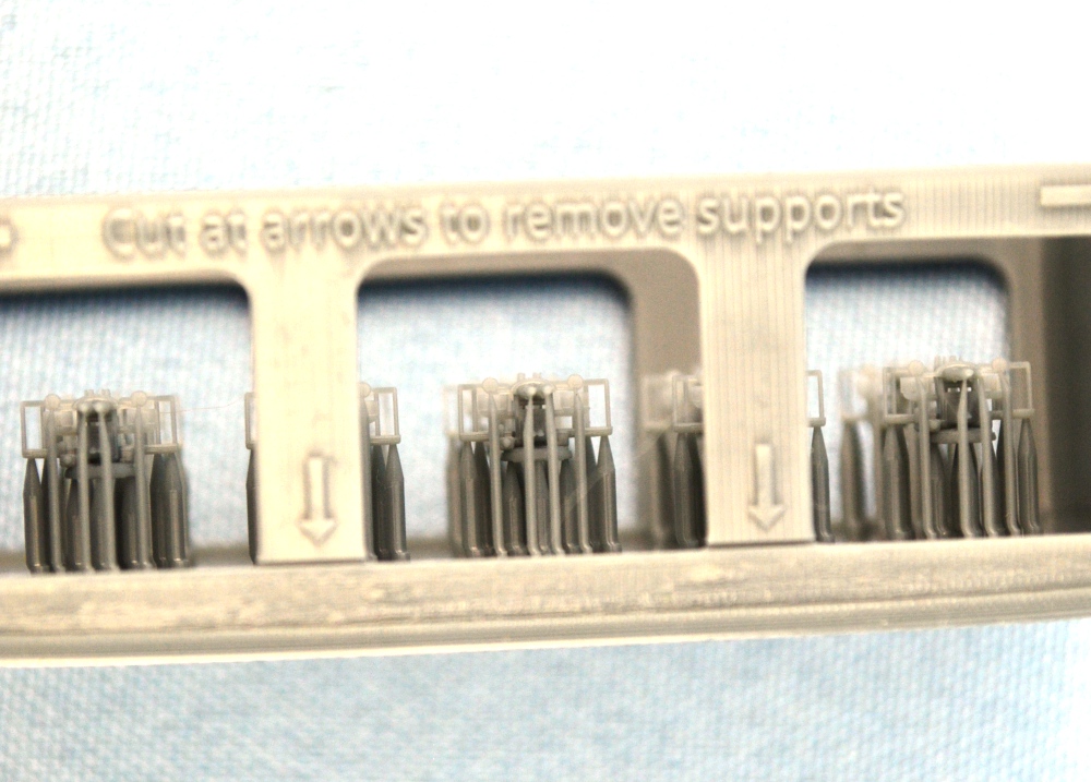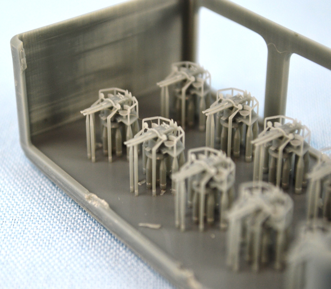 These twin 40mm mounts have good details, with seats, sights, recoils springs and railings. When I removed one side of the print raft to help facilitate photography, I found the resin break very easily and perhaps even be a little brittle. However, when I (carefully) removed one of the mounts from the print raft as a test, using my Squadron Sprue Cutters, I found that I was able to remove it with no issue. |