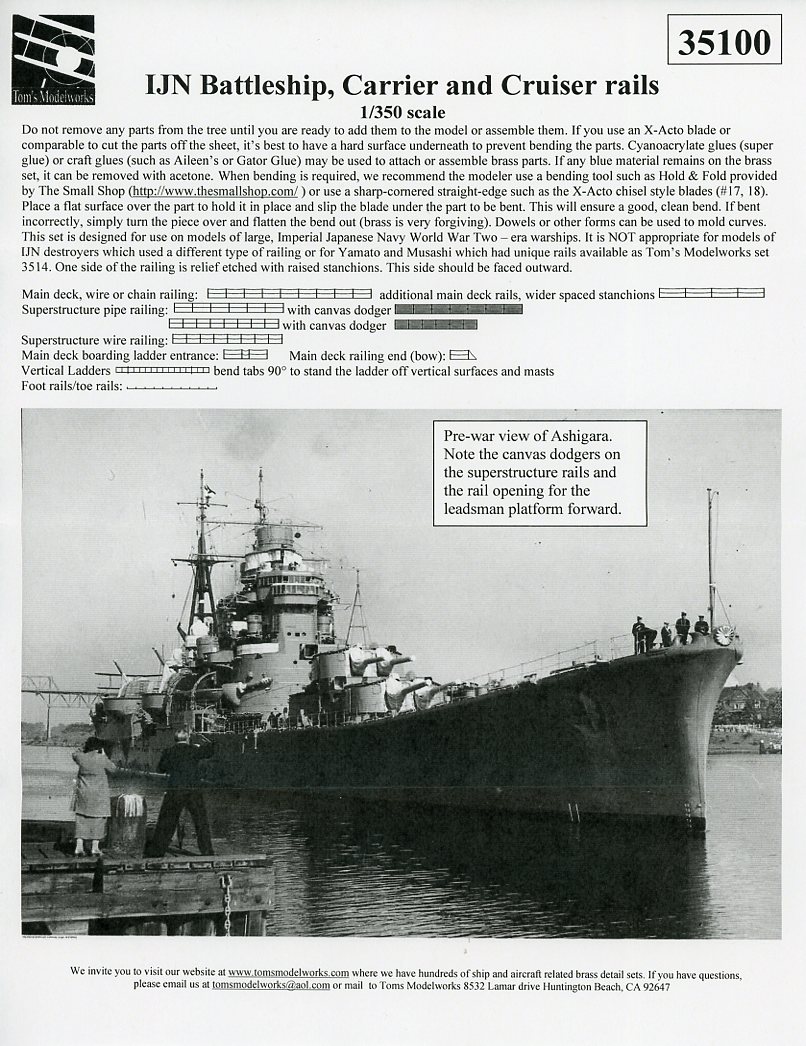 This is set 35100 1/350 IJN Battleship Carrier Cruiser rails. It is available directly from Tom's Modelworks, whom I'd like to thank for this review sample, and retails for $20.00 USD. |