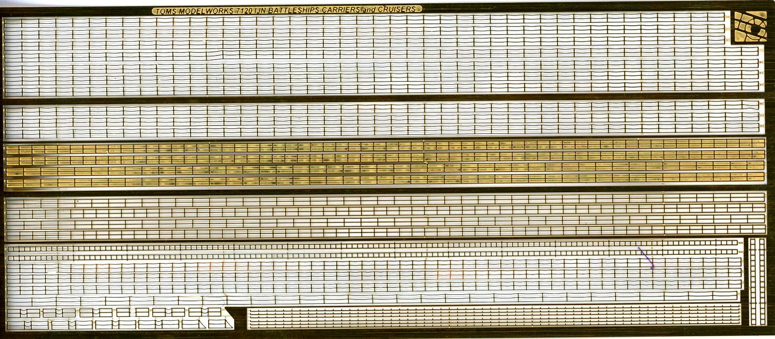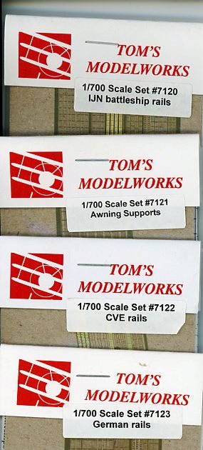 | There is one small fret included. As per Tom's website: 1/700 scale rails specifically designed for Imperial Japanese Navy battleships, carriers and cruisers. These rails are shorter than typical Western navy rails and the main deck stanchions are spaced differently. There are 7 styles of railing included in the set to fit virtually any large warship in the IJN in World War 2. The wire rails are relief-etched on one side with the stanchions thicker than the wire. Not for use on destroyers or Yamato and Musashi. Also includes special rail sections for the main deck entryways and the bow. Footrails are included as well as vertical ladders. | |||||||||