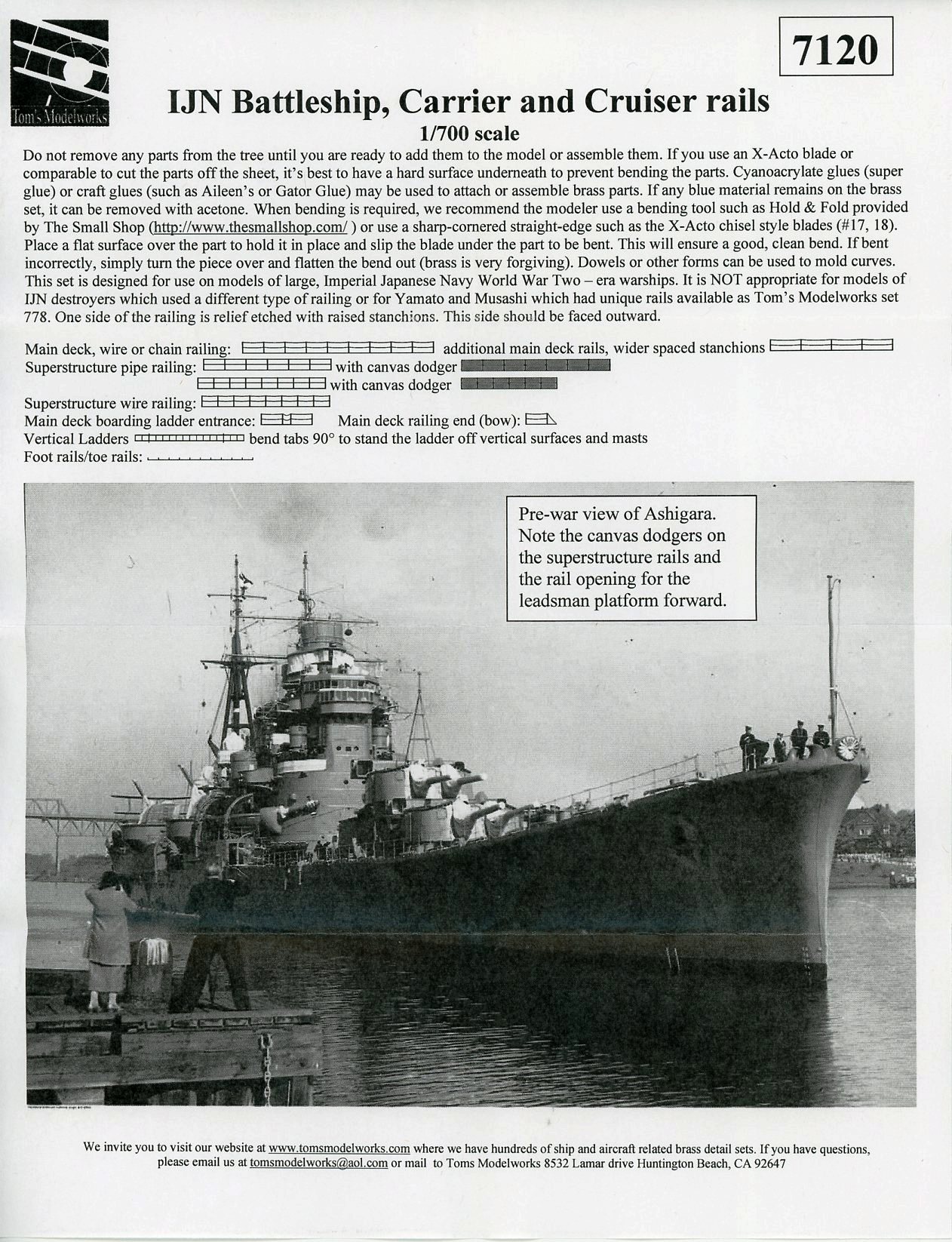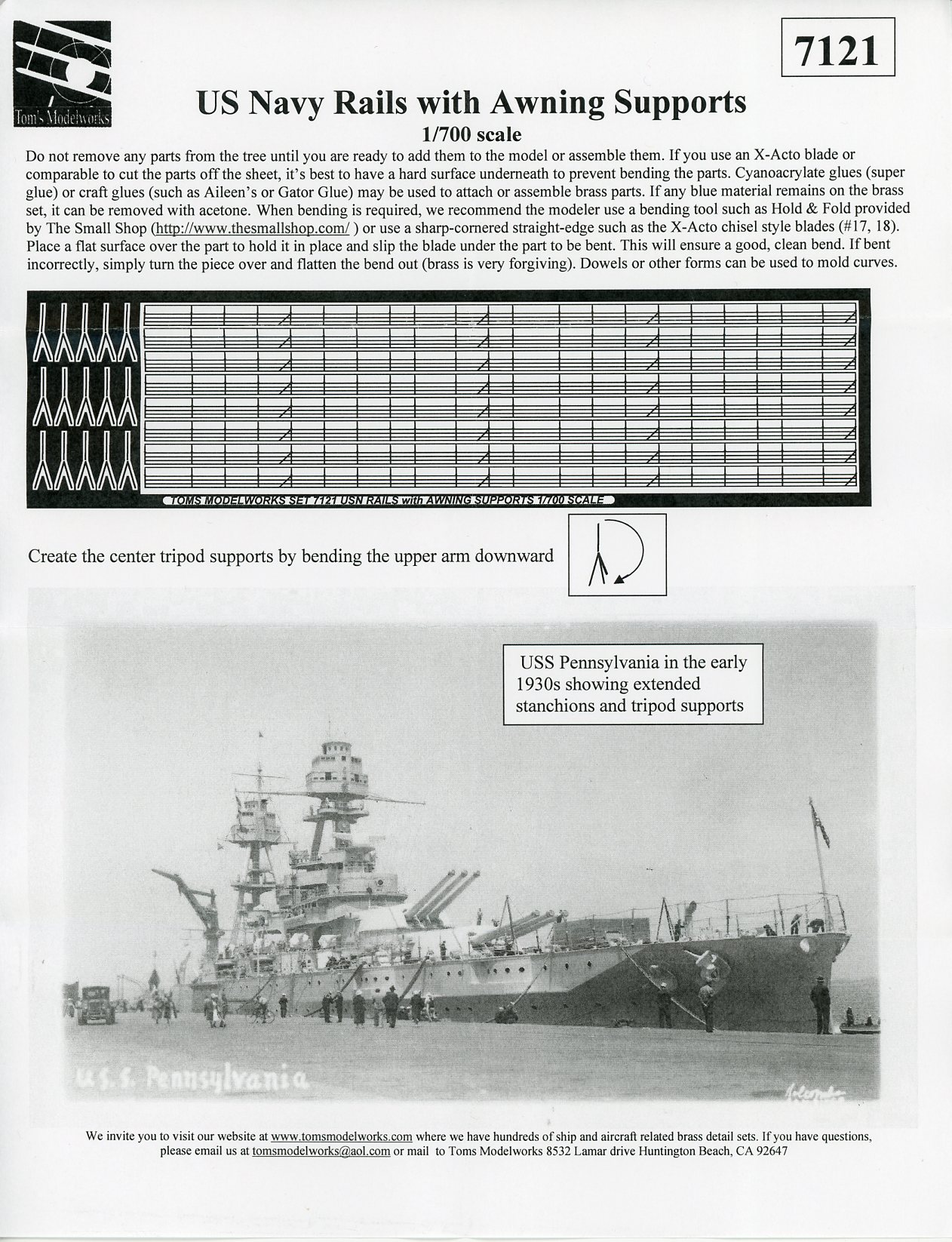 | There is one small fret included. As per Tom's website: 1/700 scale three-wire railing with extended stanchions for awning support as used by the USN on cruisers and battleships in the interwar period. All the battleships at Pearl Harbor would have used railing like this fore and aft of the main battery turrets. The same was true of cruisers assigned to the Pacific Fleet. This set also includes the tripod centerline supports often used to support large awnings. | |||||||||