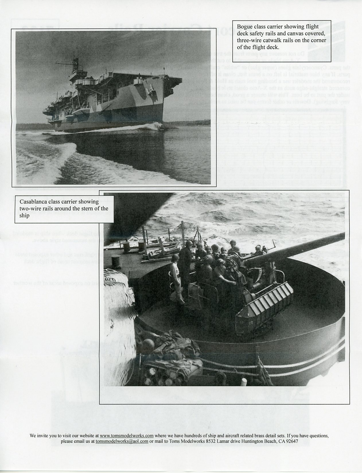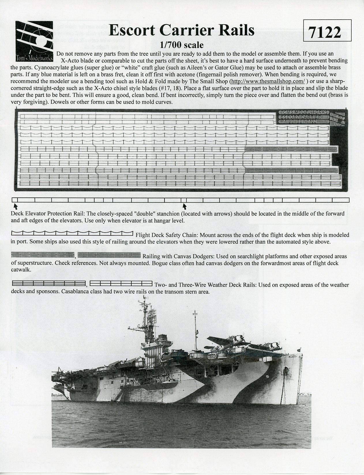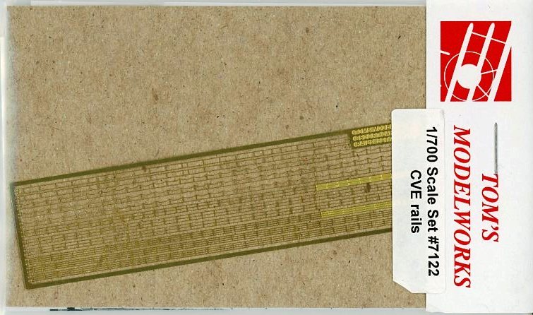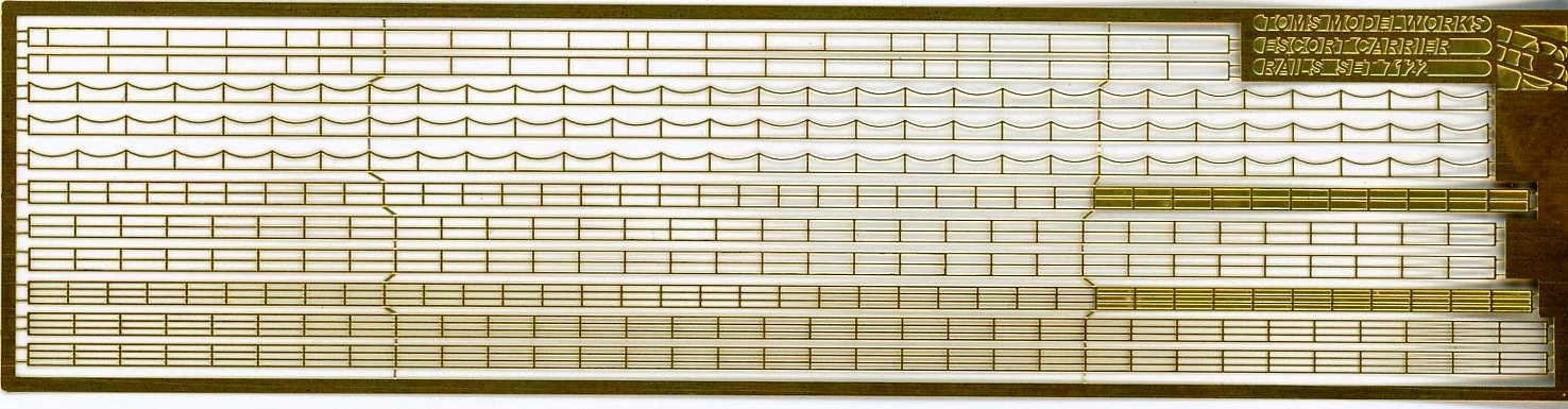 | There is one small fret included. As per Tom's website: Various railings specifically for use on US-built escort carriers of World War 2 including two types of safety rails around the elevators, flight deck end safety rails and standard two and three wire rails, both canvas covered and open. | |||||||||
