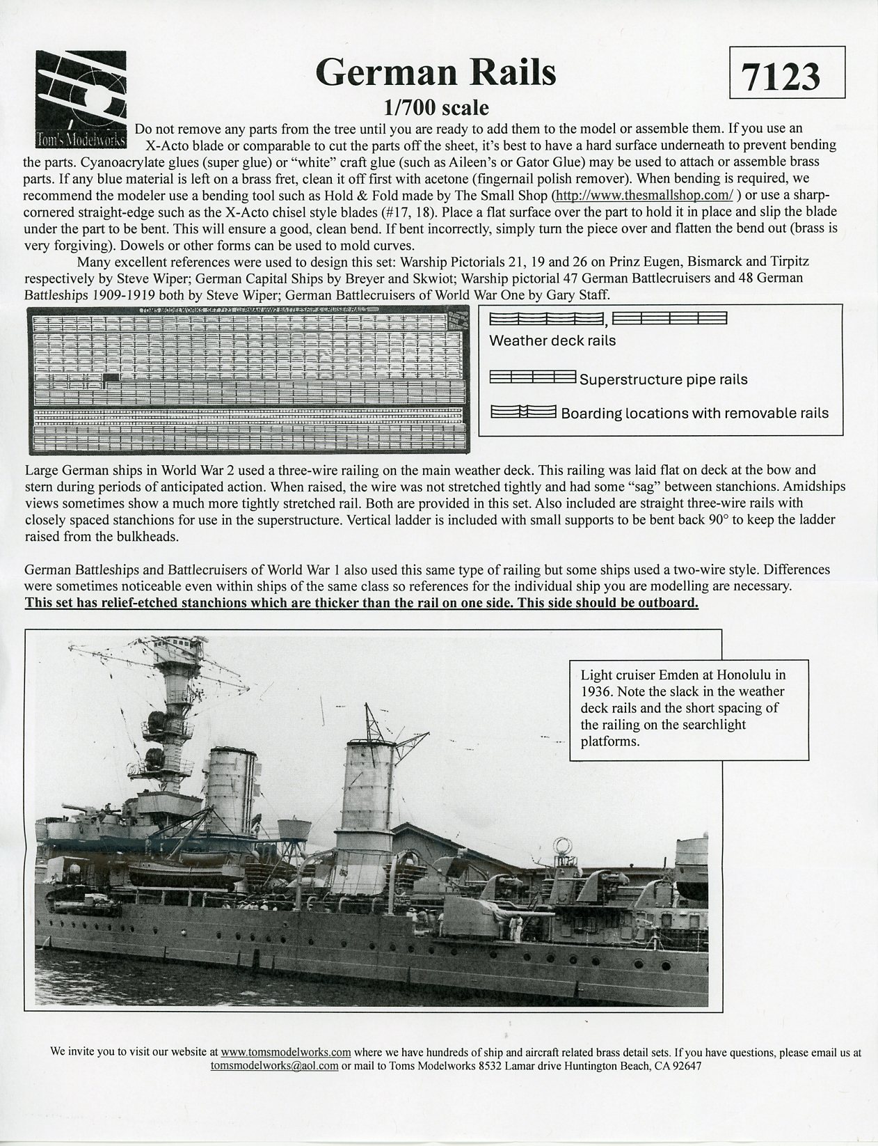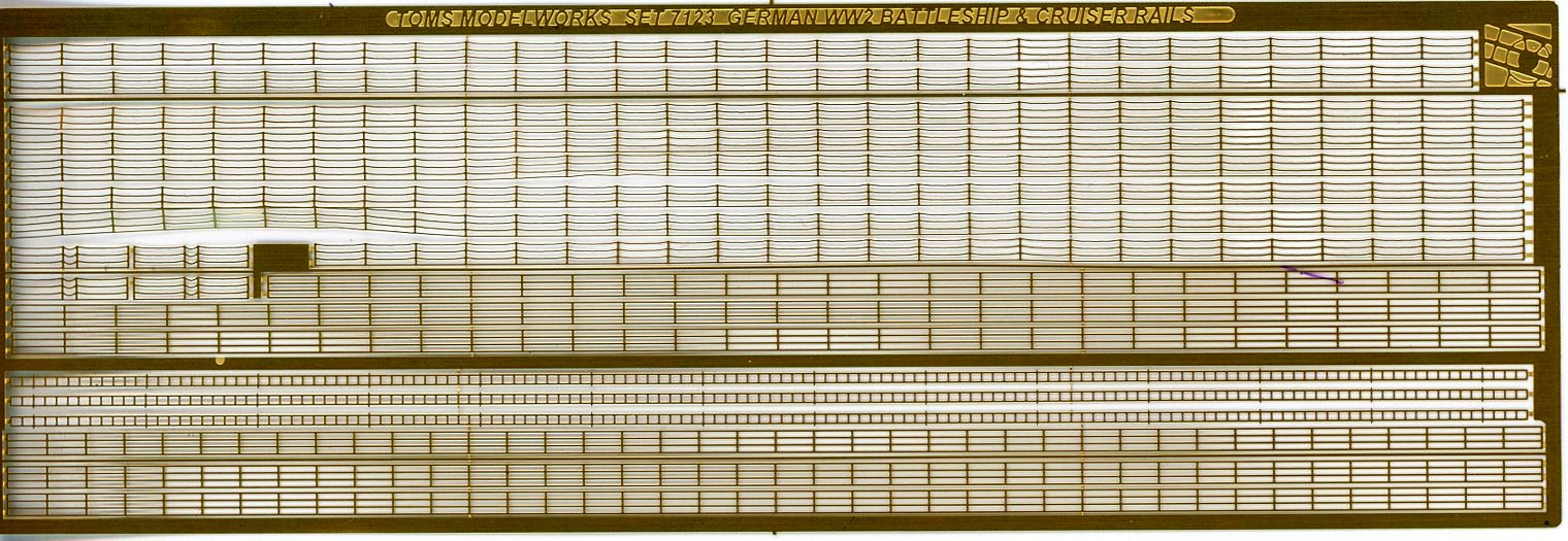 | There is one small fret included. As per Tom's website: Relief-etched, three-wire rails for German WW1 and WW2 battleships, battlecruisers and cruisers. Suitable for all WW2 German battleships and cruisers except Graf Spee, Scheer and Lutzow. Also suitable for some German WW1 battleships and battlecruisers but not all. Some had two-wire rails. | |||||||||