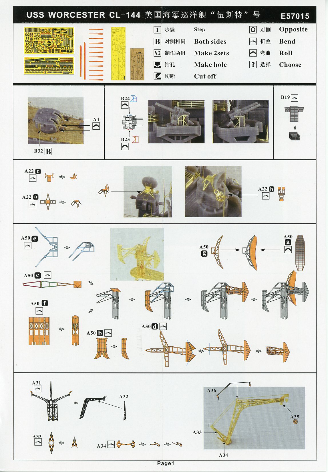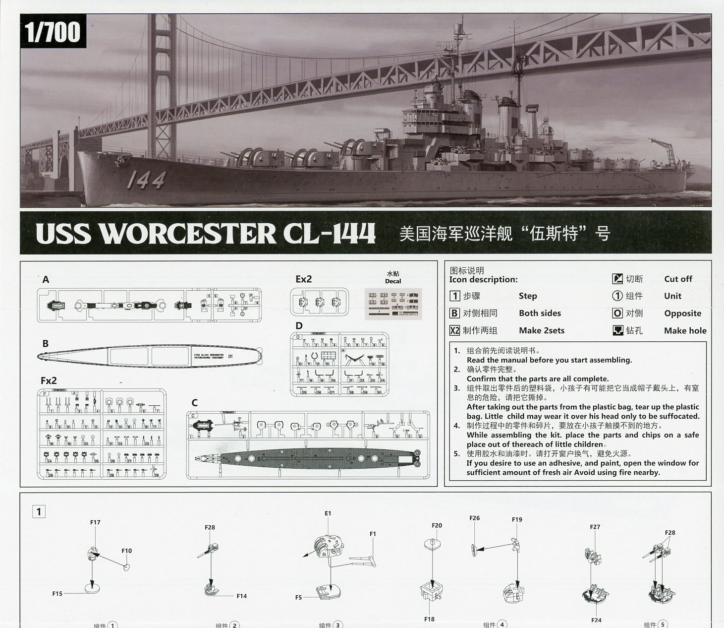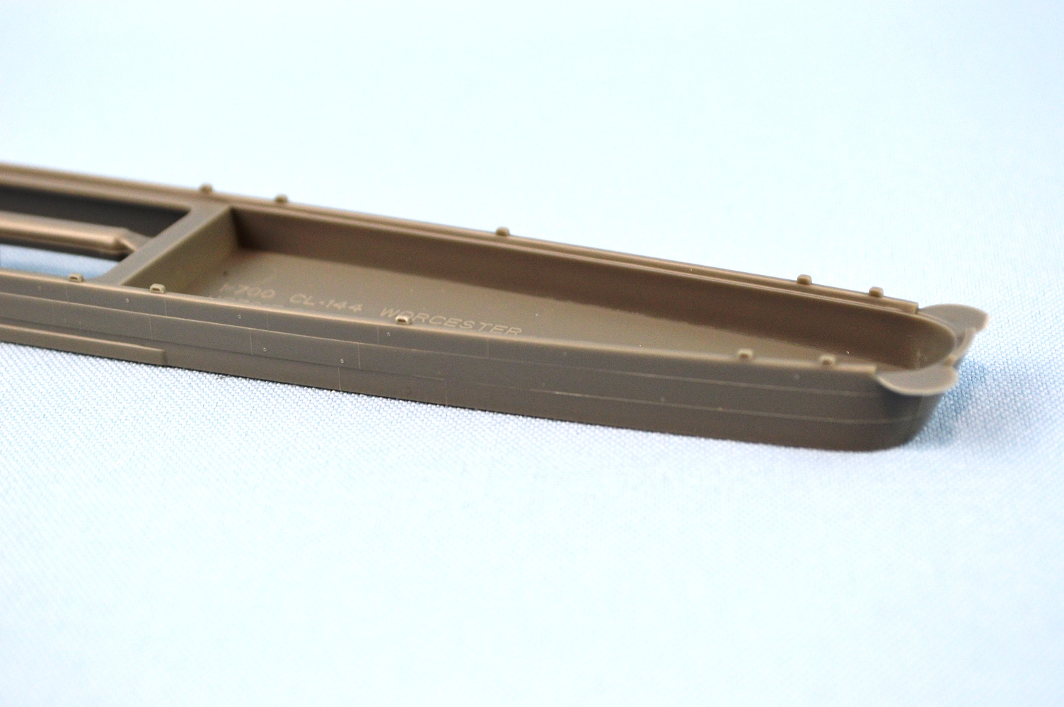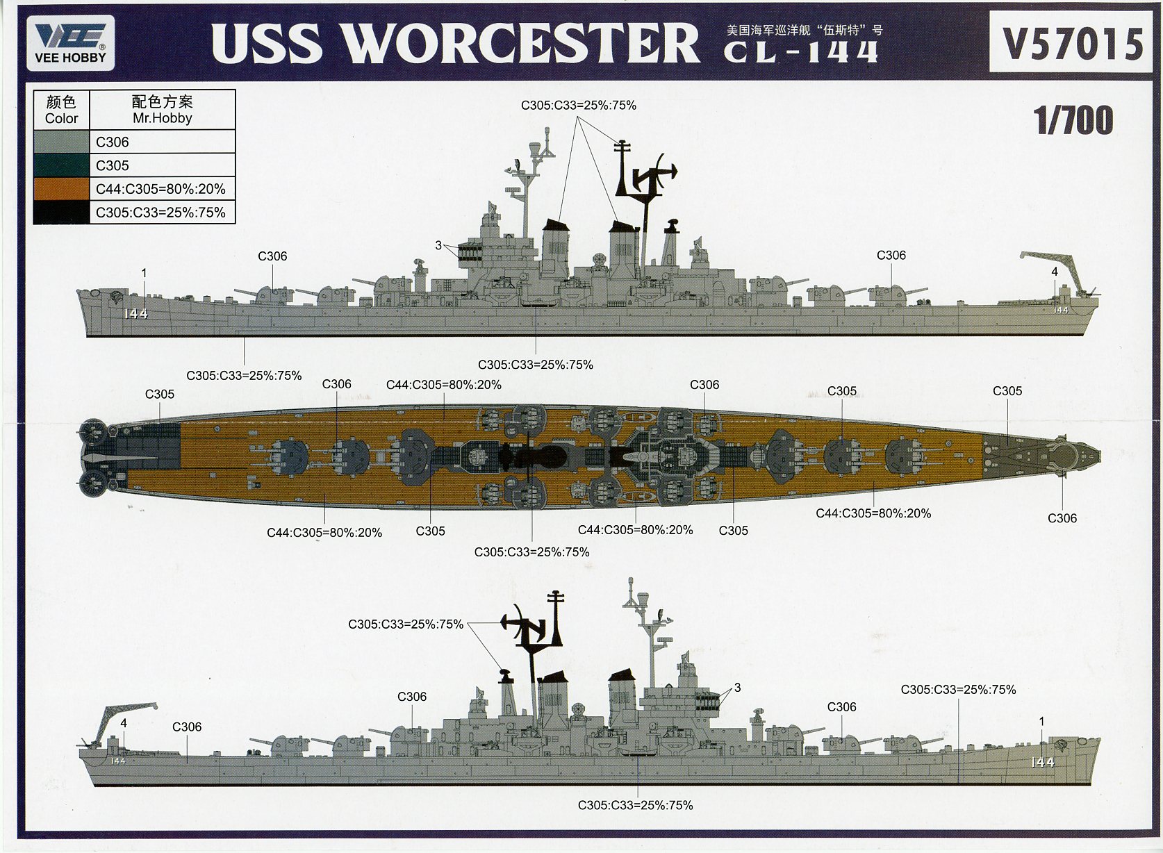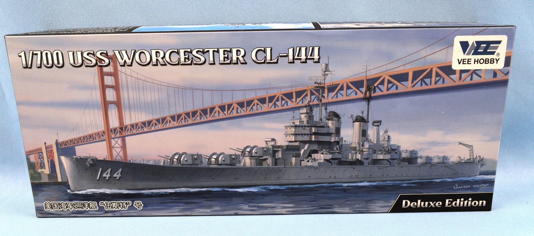 This is Vee Hobby 1/700 USS Worcester (CL-144), Deluxe Edition, kit number E57015. It's available on eBay. Prices vary, and seem to depend on if you are ordering the standard or deluxe version, so check carefully before adding to your cart. Thanks to Russ Varga for lending me the model for the review. |
