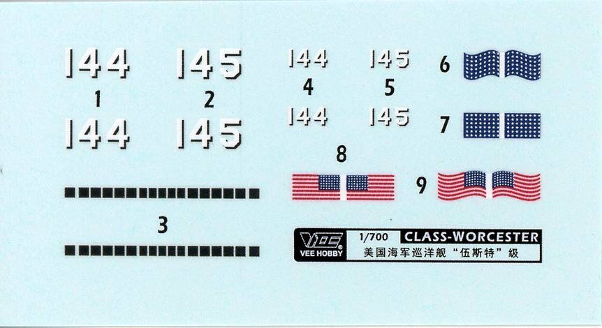 | There is one small decal sheet, with hull numbers for both Worcester and Roanoke, as well as a naval ensign and US flag. There are also what appear to be decals for the bridge windows (Hey, Vee Hobby, Fujimi called - they want their 1970's bridge window decals back). | |||||||||||||