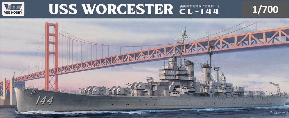 Vee Hobby continues to release new and interesting US navy cruiser kits. One of the latest is the post-World War II anti-aircraft cruiser USS Worcester. This is the deluxe version of the kit. It contains eight plastic sprues, deck masks, a wood deck, turned brass parts, anchor chain and photo-etch. |