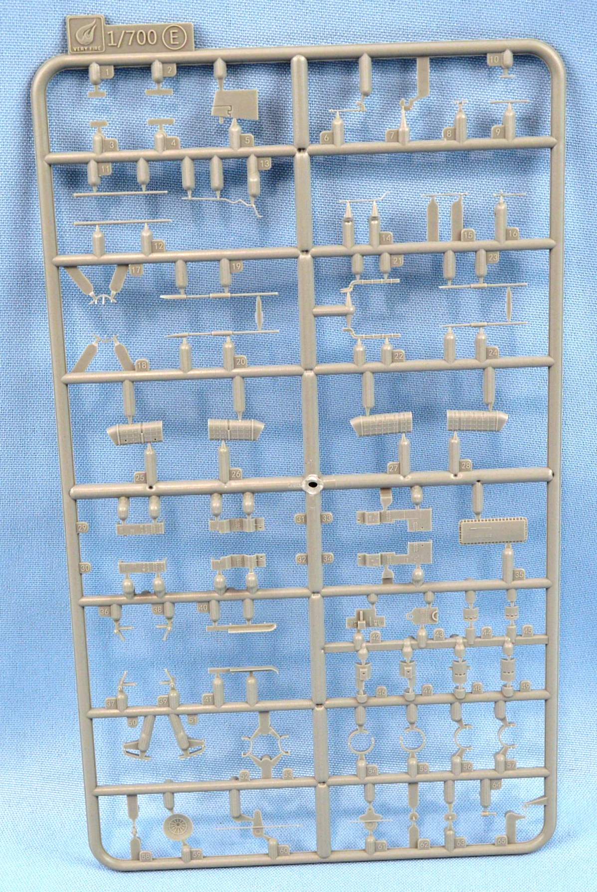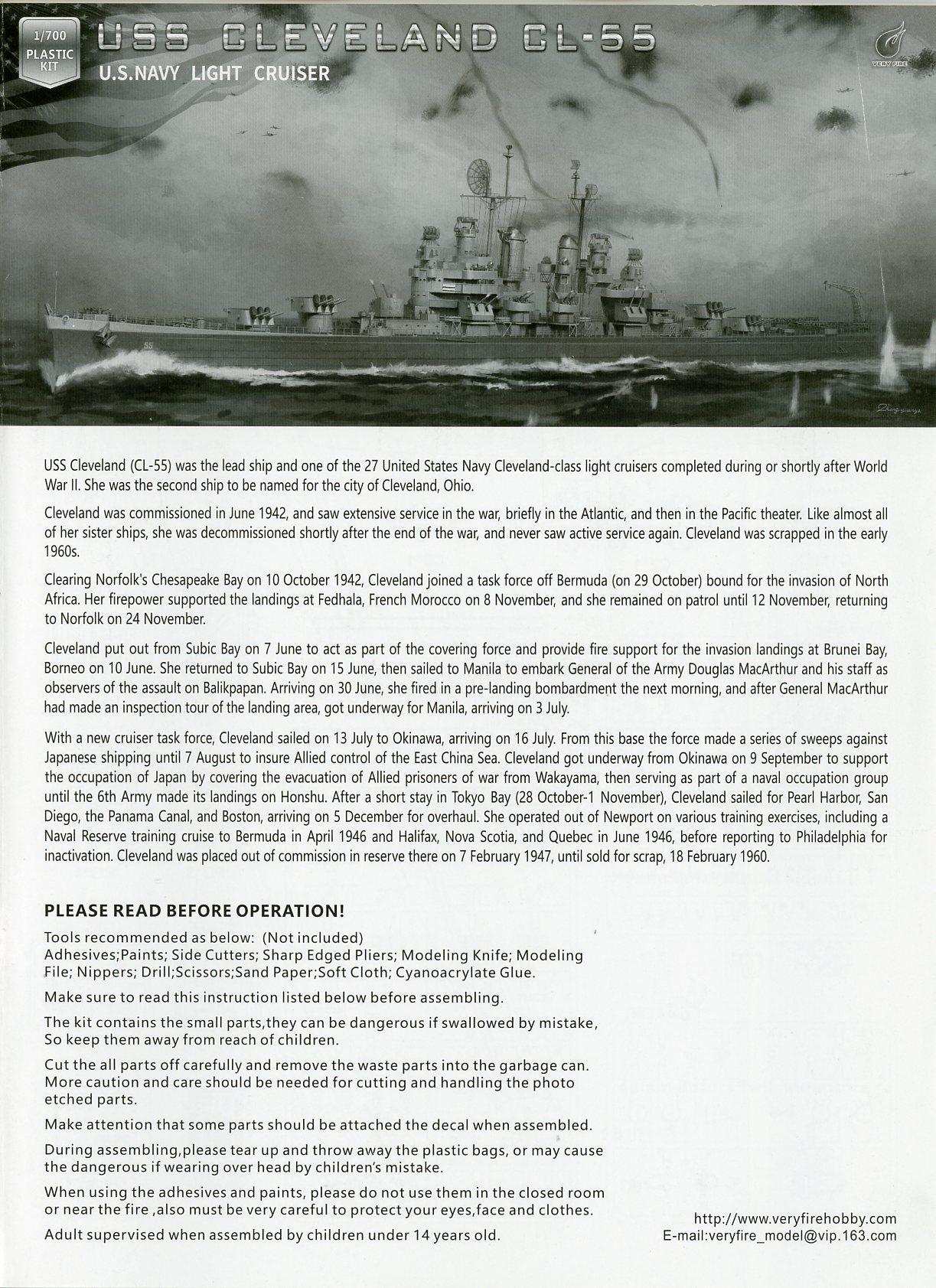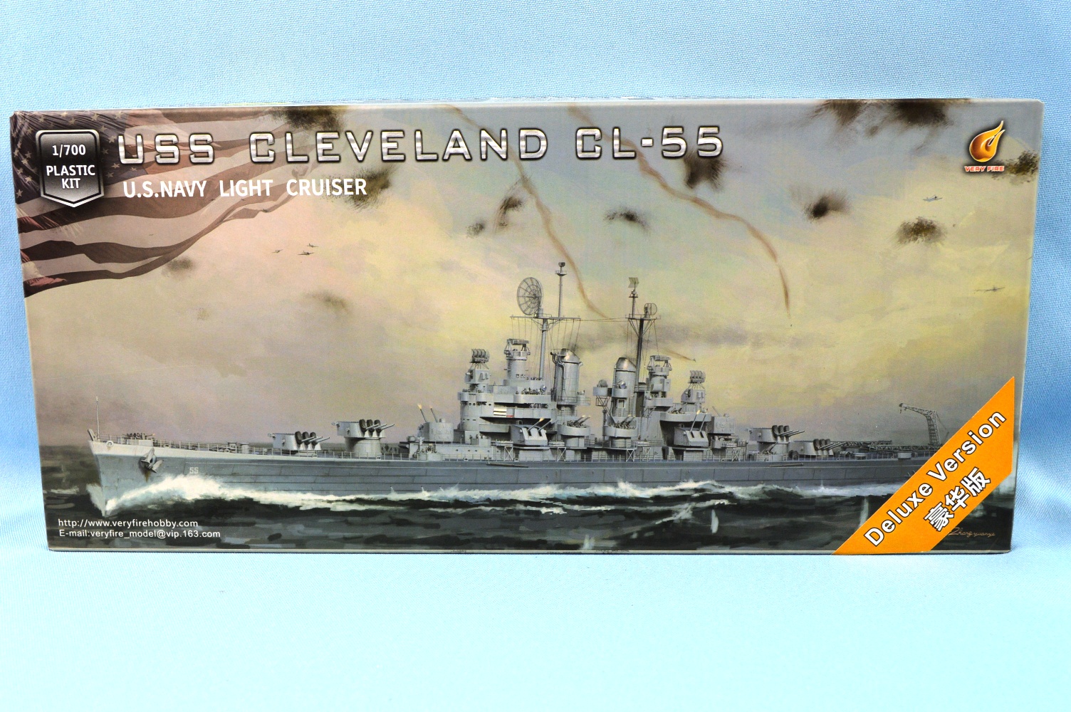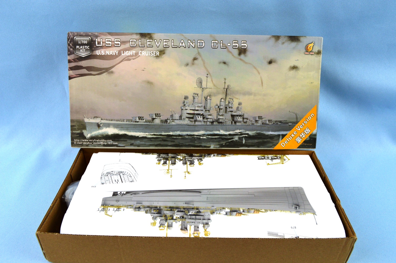 Very Fire has released several US navy cruiser in 1/700. One of the latest is the World War II light cruiser USS Cleveland. This is the deluxe version of the kit. It contains over twenty plastic sprues, turned brass parts, anchor chain and photo-etch. |