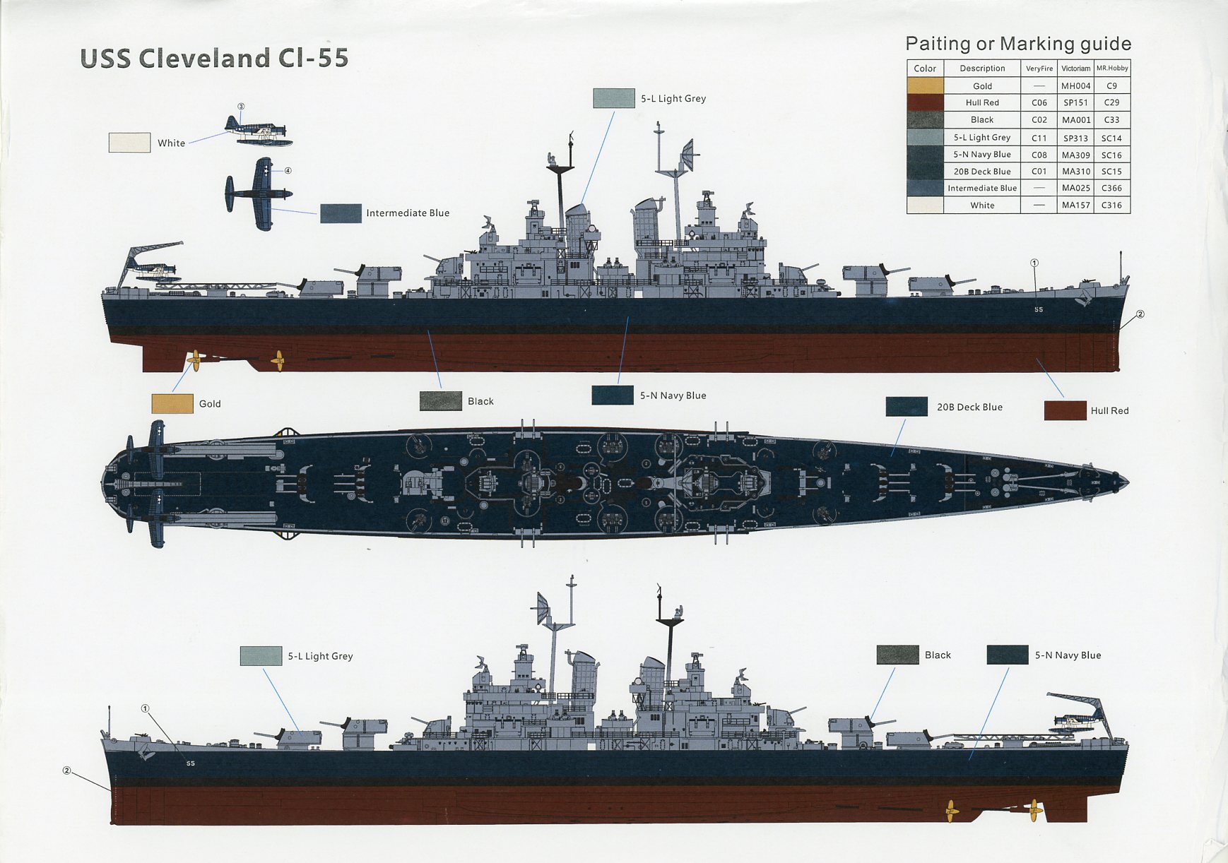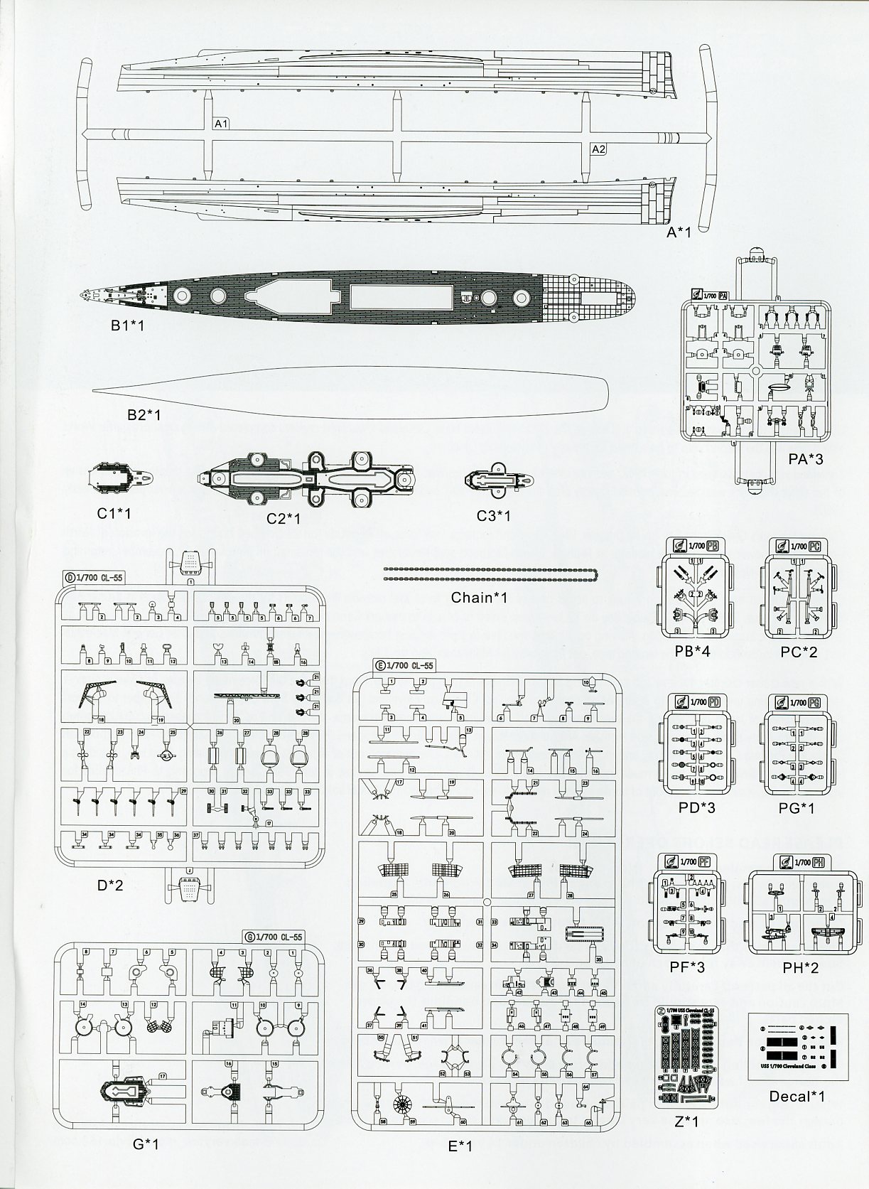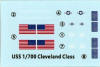 | There is one small decal sheet, with hull numbers for both Cleveland and Birmingham, decals for the float planes, draft markings, as well as a naval ensign and US flag. | |||||||||||||||||||