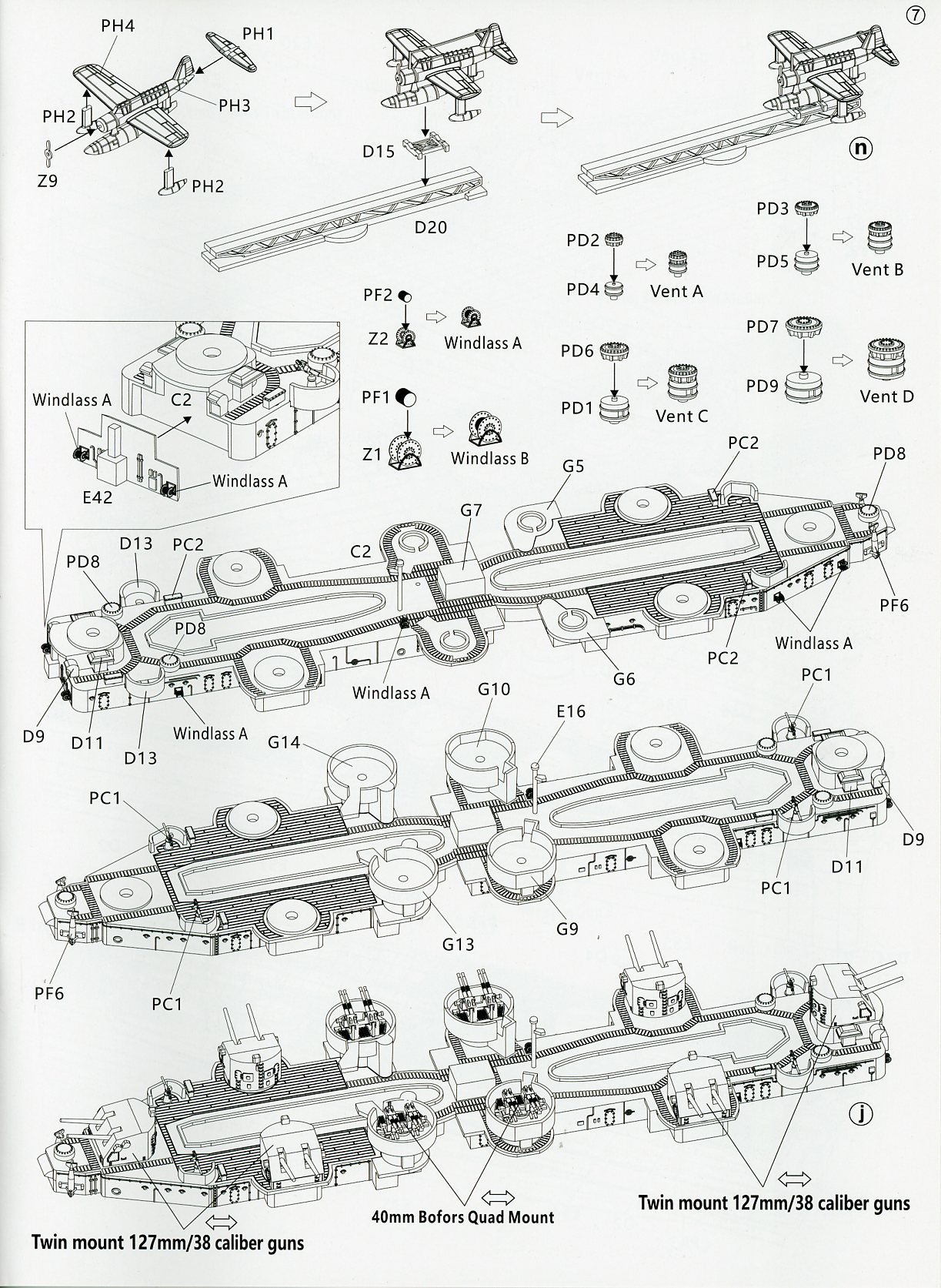 PA (X3) - 5 in gun turrets, Mk37 director, boats, bridge equipment PB (X4) - 40mm guns (sans shields) PC (X2) - 20mm guns (sans shields) and ready ammo boxes PD (X3) - Capstan parts, other anchor handling equipment PF (X3) - Winches, paravanes PG (X1) - Searchlights, signal lamps, lookout postions PH (X2) - Seaplanes |