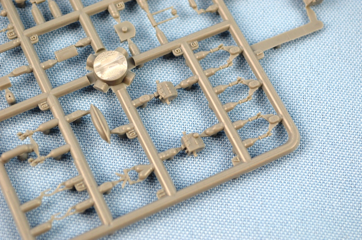 sprues (rafts), turned brass parts, 3D printed parts, and two photo-etch