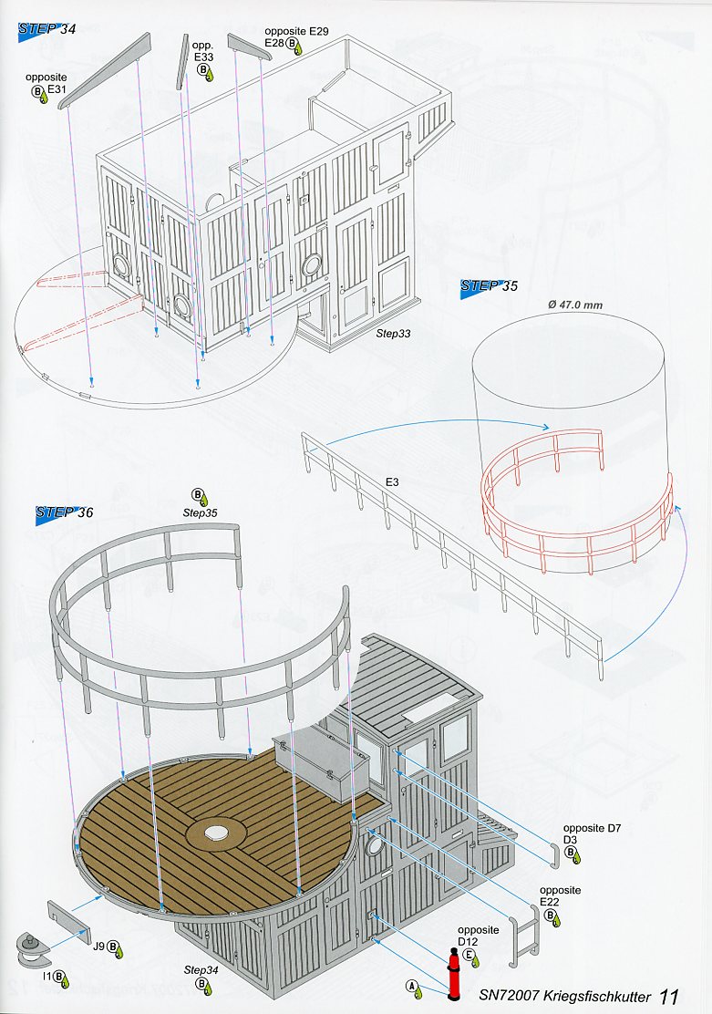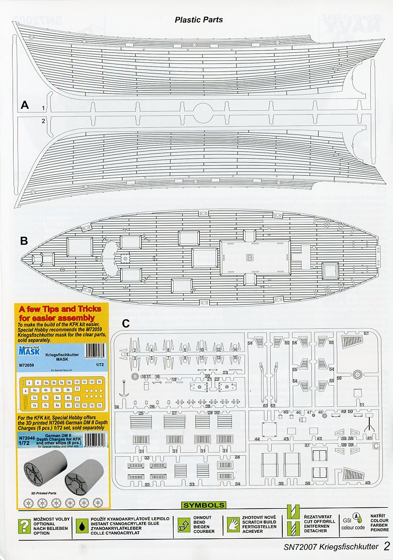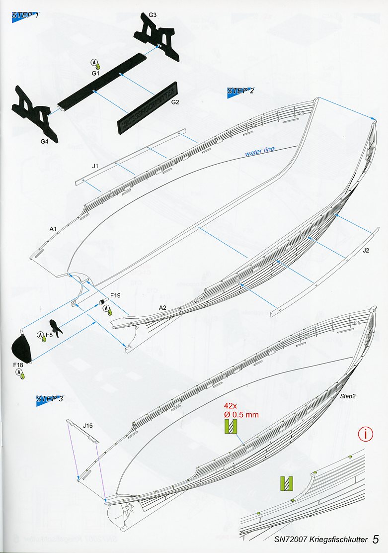 | The instructions are a large, 20 page color booklet, printed on glossy stock. Along with a history of the Kriegsfischkutter, included are a parts manifest and exploded view diagrams spanning seventy-eight (yes, 78) steps. The last page has a small color painting diagram. You'll have to pay attention as you go along in regards to painting - those are called out in the instructions as a letter next to a small paint drop. | ||||||