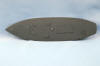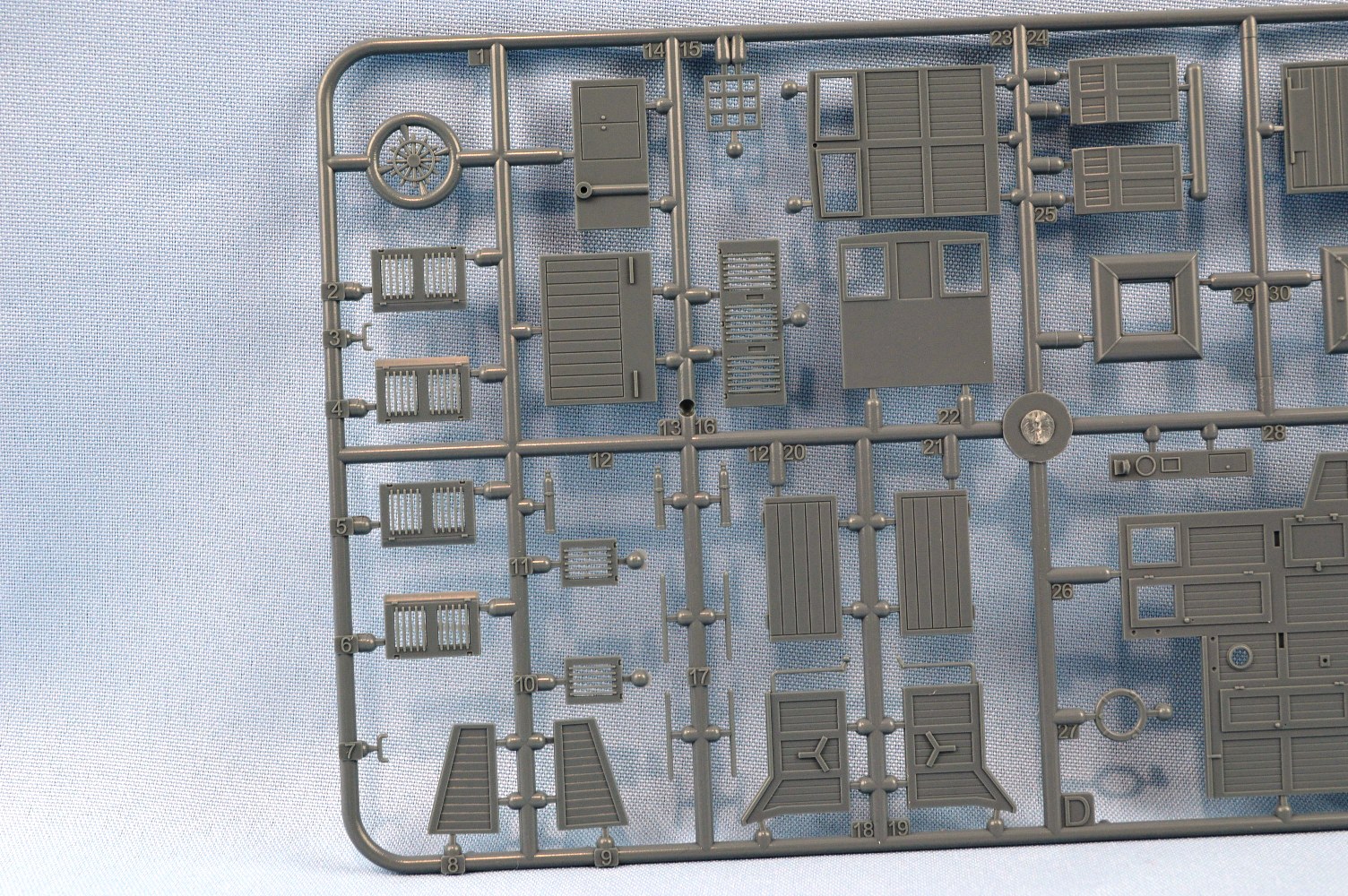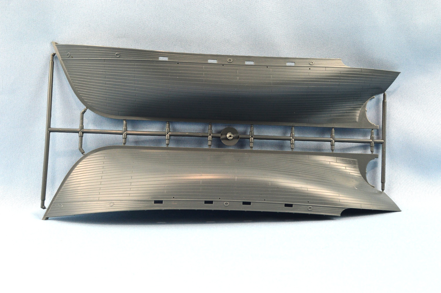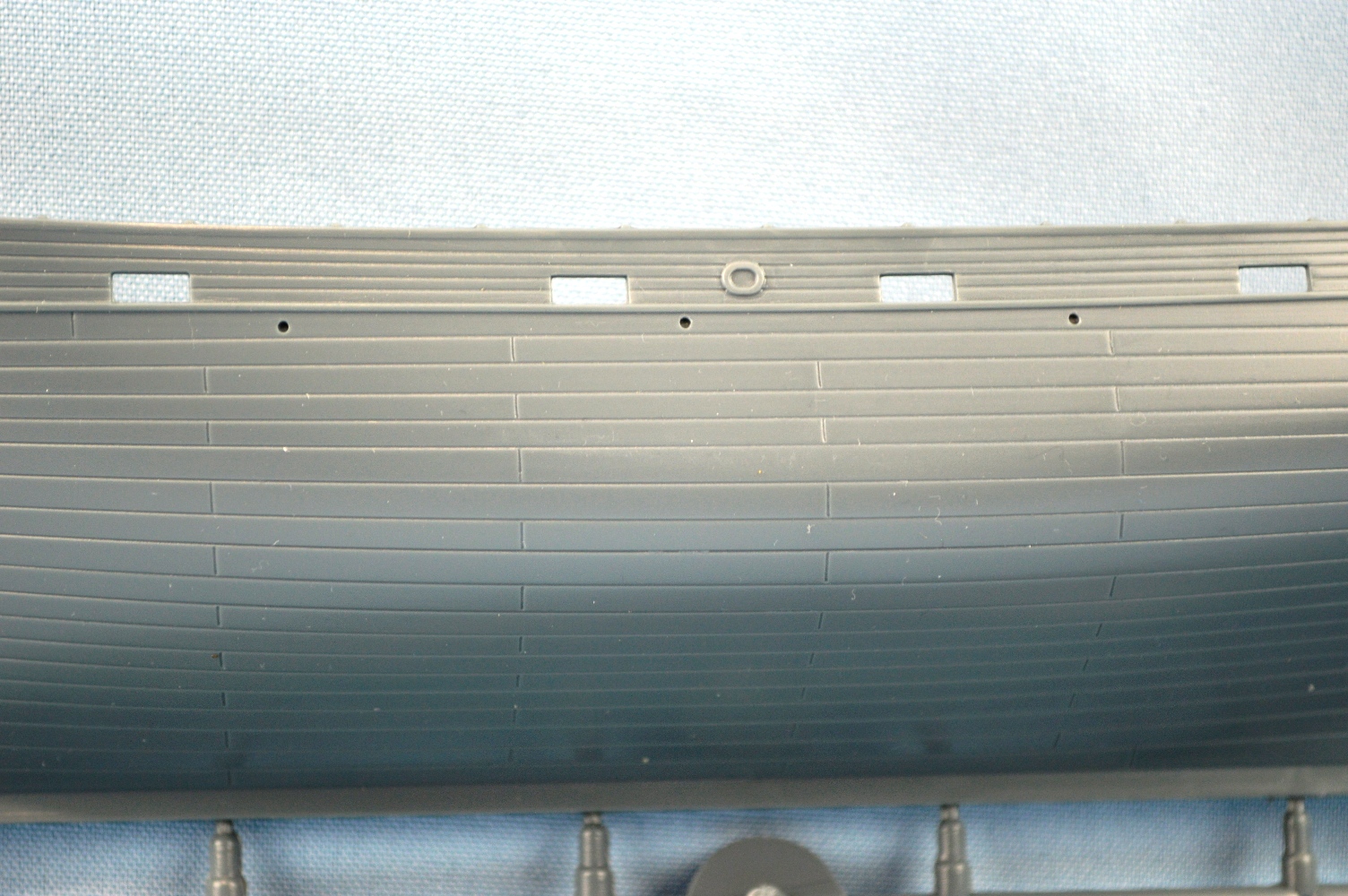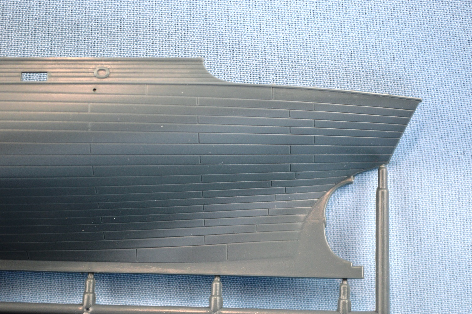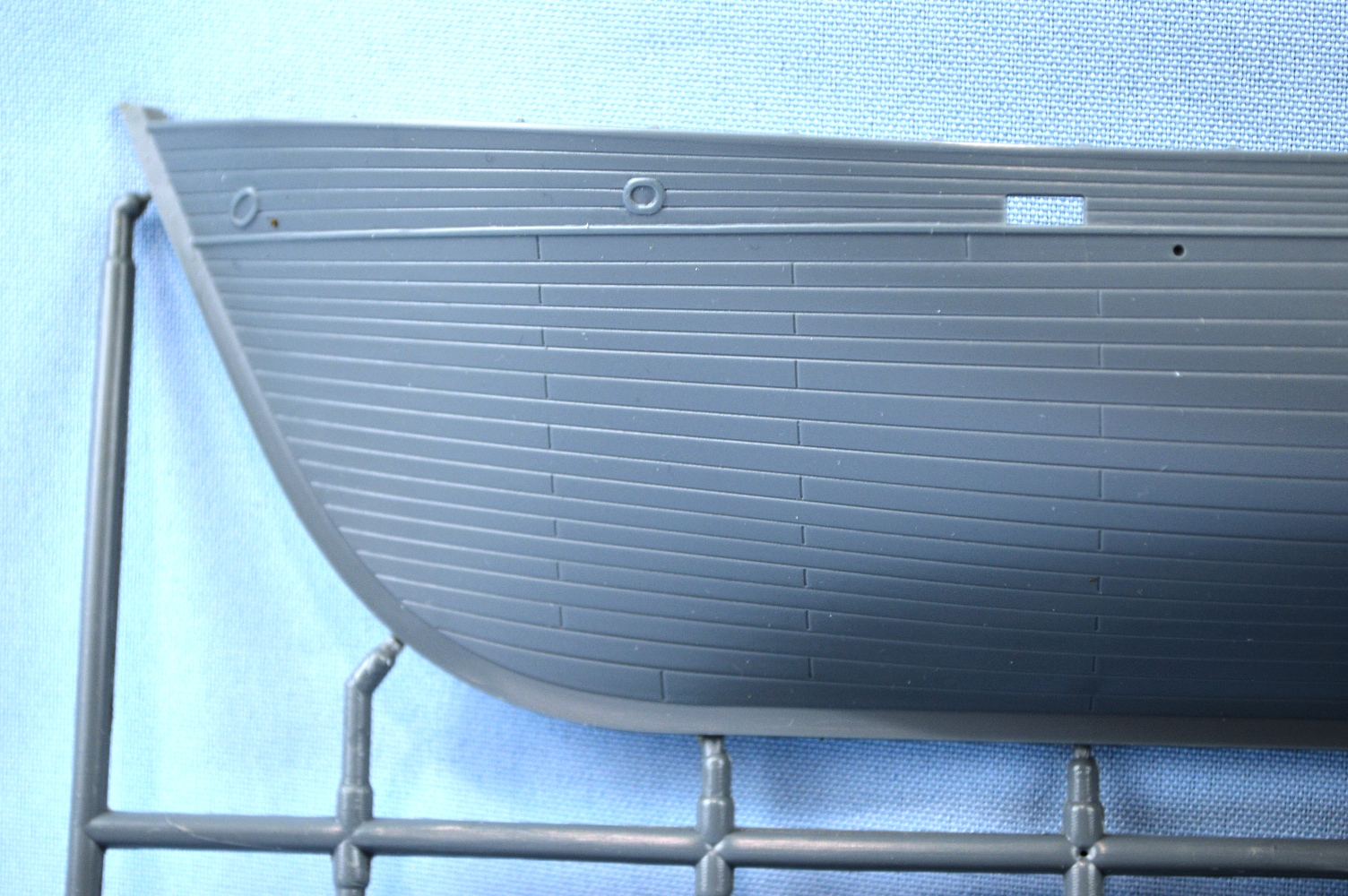 | This sprue contains the two sides of the hull. The hull seems to scale out spot on in both length and beam. These were wooden boats, and the outside of the hull reflects that, with engraved planking detail. The planking above the level of the main deck, on both the outside and inside of the hull, is of a different pattern. These same bulkheads have open scuppers, while the hawseholes are curiously molded closed. There is also a recessed line on the inside of the hull, for those who may wish to waterline their model. | ||||||