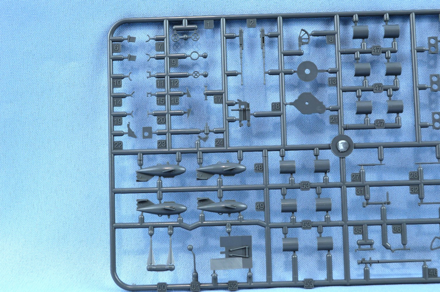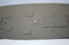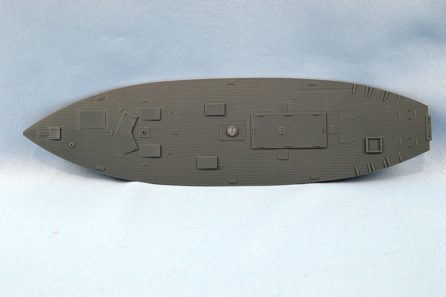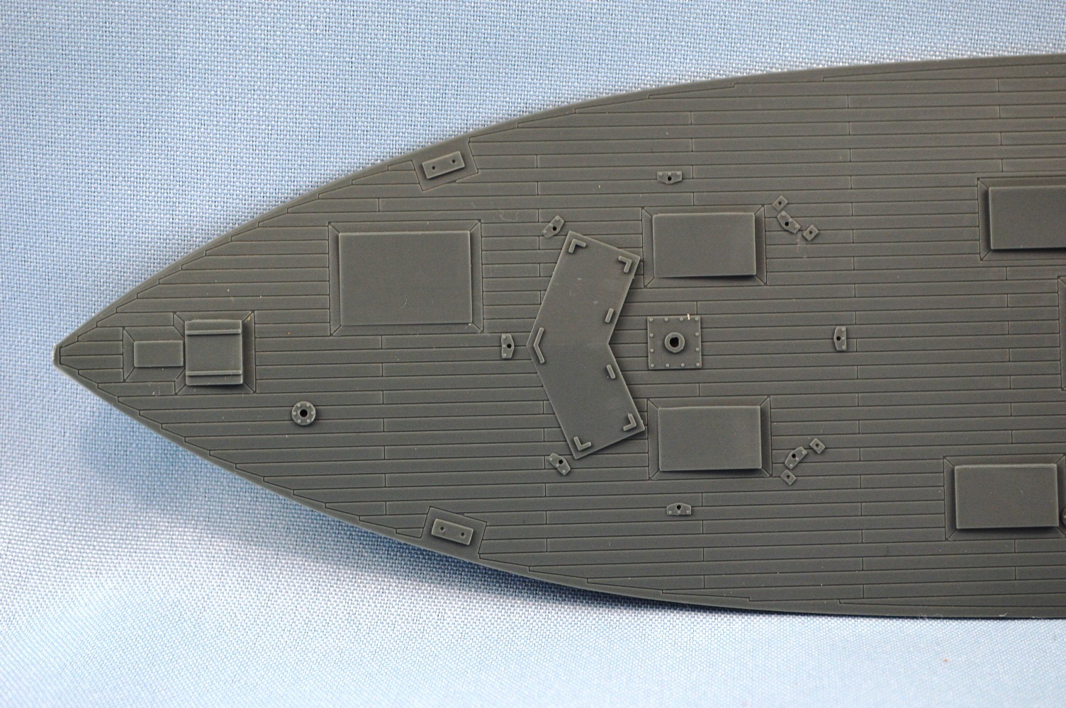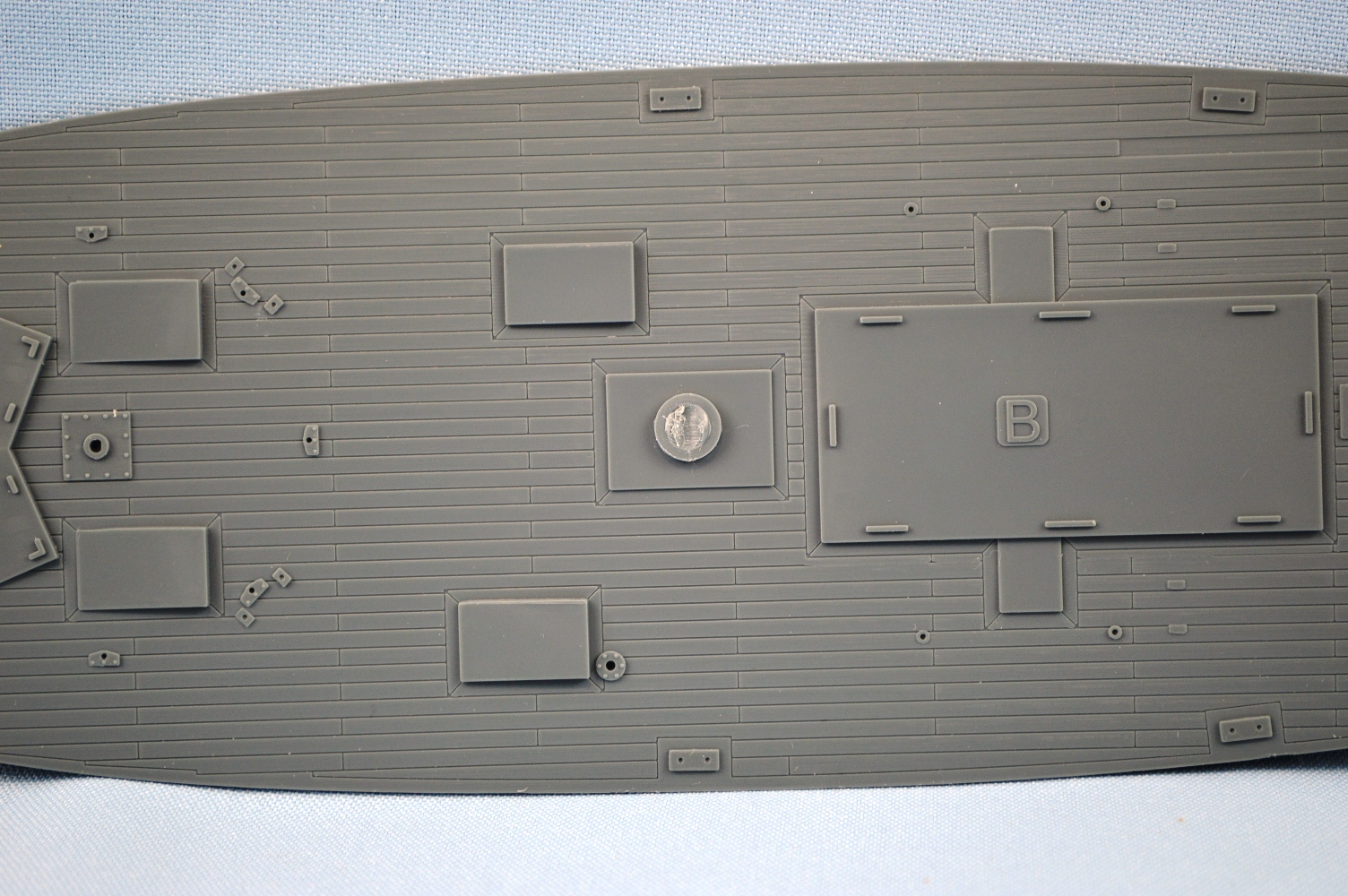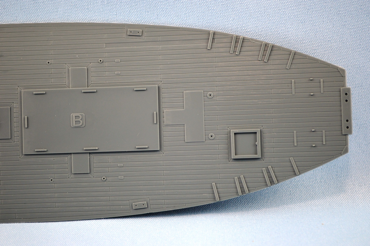| This sprue is the one piece main deck. It has individual planking detail, which has a wood grain like pattern on the deck. There is raised details include, to facilitate the placement of the deckhouse, hatches, depth charges on other equipment. | ||||||