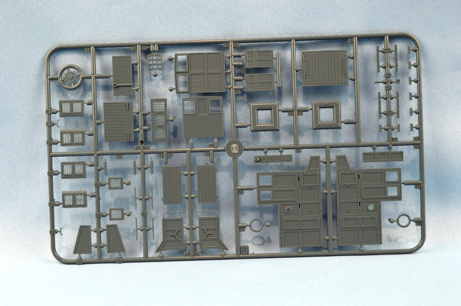 | Here we find the larger pilothouse parts, more hatch covers, a square raft and ships wheel. | ||||||