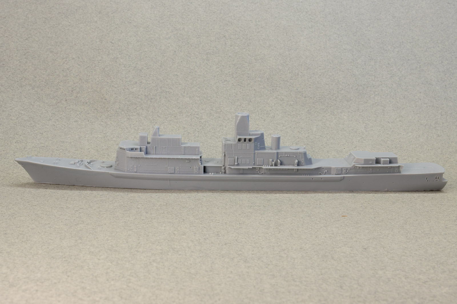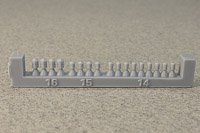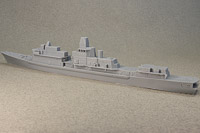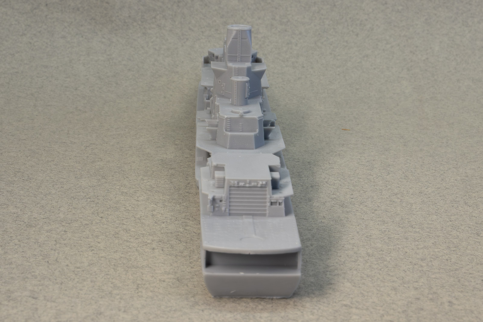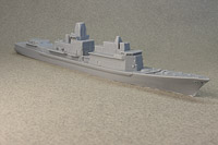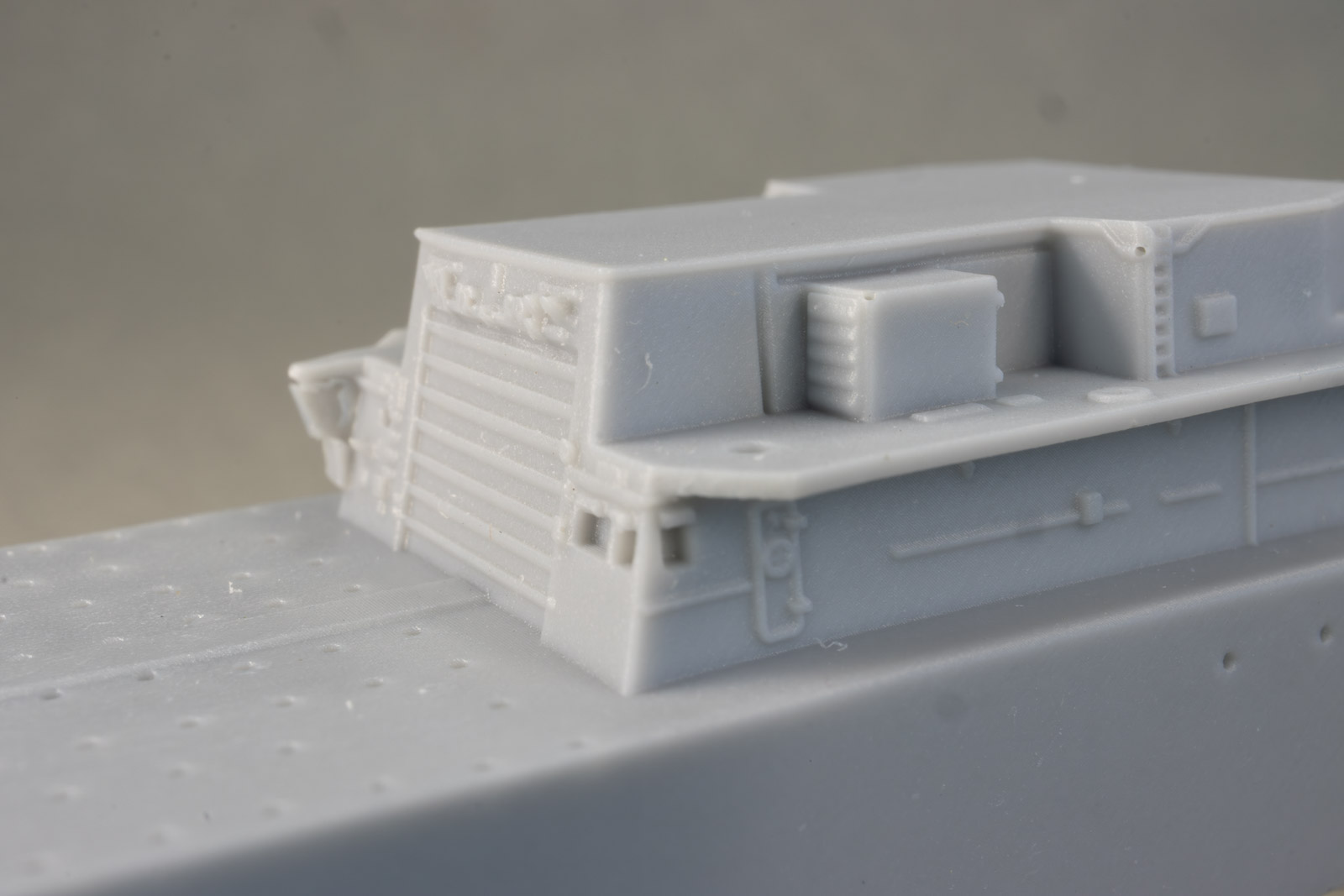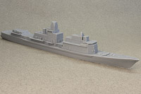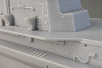 Overall detail is extremely sharp, some of the best I've ever seen in a cast resin hull. As it's from a printed master, under magnification, you can make out very faint layer lines here and there, but nothing that's really visible with the naked eye. My example does have a slight depression/gouge on the aft port quarter, but it's in a area that's devoid of detail and can be filled and sanded easily. Portholes on the hull are slightly filled-in from the casting process, but that's typical of cast resin hulls. These can be quickly remedied by a twist or two from a drill bit and pin vise. Other than the slight gouge previously mentioned, the only real issue I see with the hull are the tie-downs on the helo deck; they're way too prominent to my eye, but an extra coat of primer in that area should knock them back nicely. Multiple sources state the full-sized ships as 456' in length. Overall length of the model's hull comes in at just over 7.8", which is spot-on for 1/700th scale. Note: the close-up shots in this review were taken with a macro lens, so any small defects you might see aren't at all visible to the naked eye. |