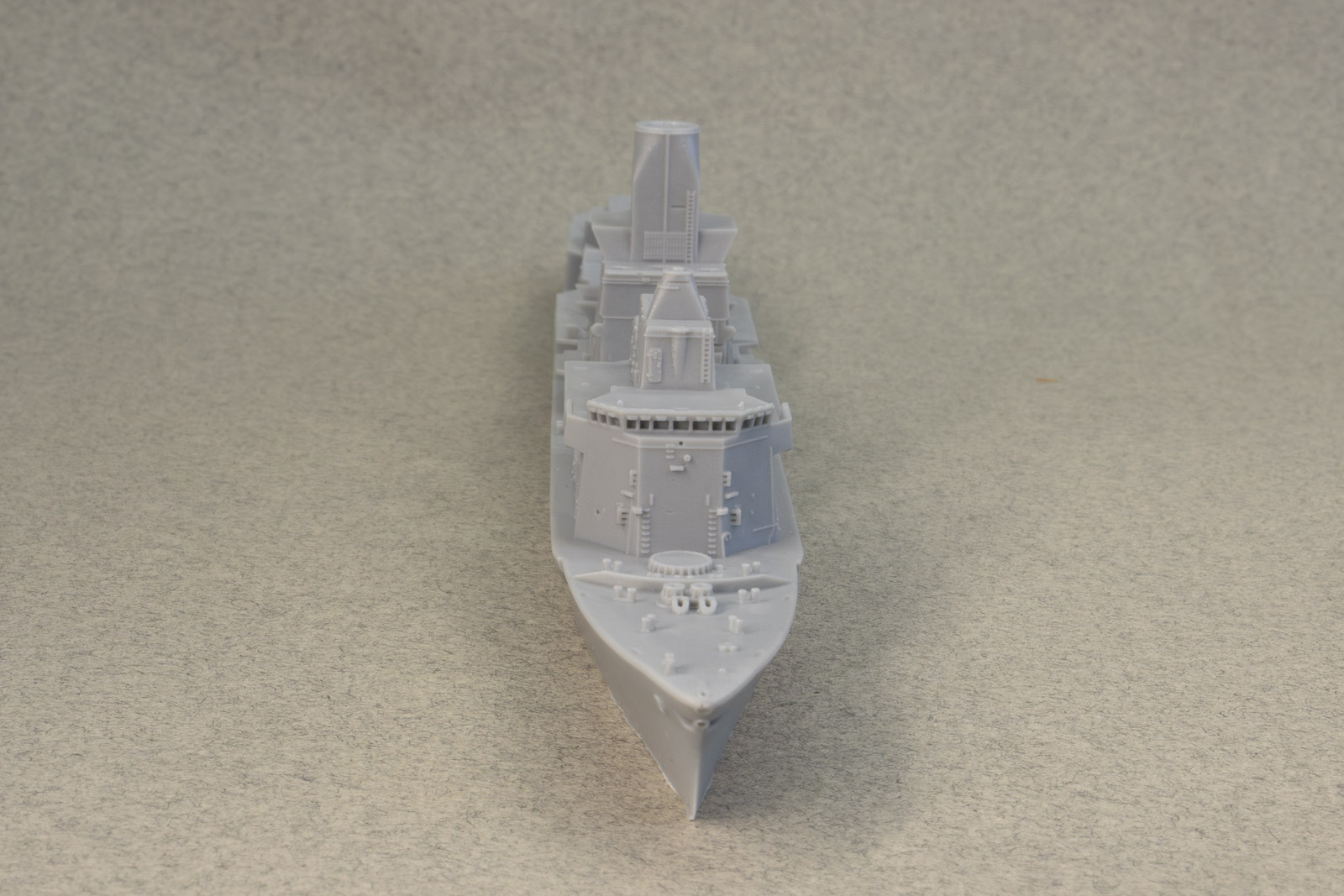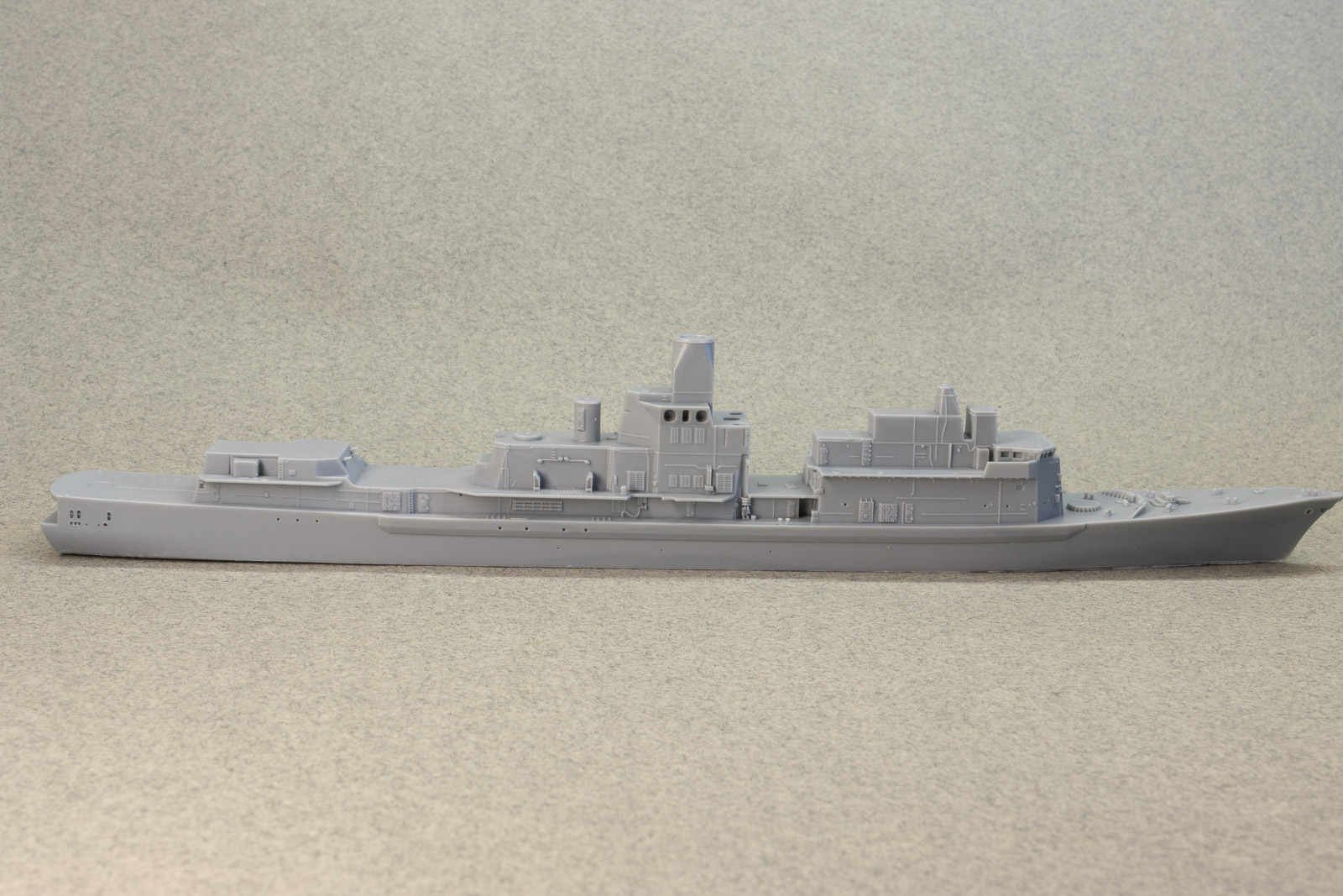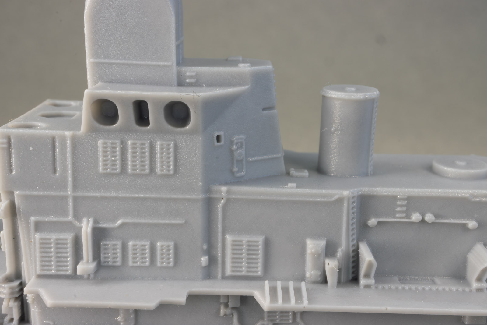 Overall detail is extremely sharp, some of the best I've ever seen in a cast resin hull. As it's from a printed master, under magnification, you can make out very faint layer lines here and there, but nothing that's really visible with the naked eye. My example does have a slight depression/gouge on the aft port quarter, but it's in a area that's devoid of detail and can be filled and sanded easily. Portholes on the hull are slightly filled-in from the casting process, but that's typical of cast resin hulls. These can be quickly remedied by a twist or two from a drill bit and pin vise. Other than the slight gouge previously mentioned, the only real issue I see with the hull are the tie-downs on the helo deck; they're way too prominent to my eye, but an extra coat of primer in that area should knock them back nicely. Multiple sources state the full-sized ships as 456' in length. Overall length of the model's hull comes in at just over 7.8", which is spot-on for 1/700th scale. Note: the close-up shots in this review were taken with a macro lens, so any small defects you might see aren't at all visible to the naked eye. |