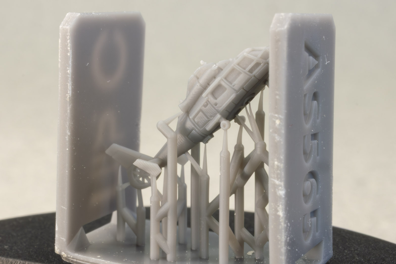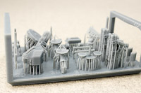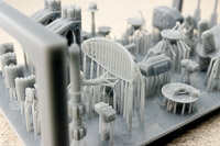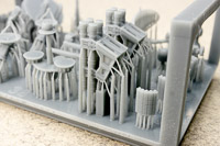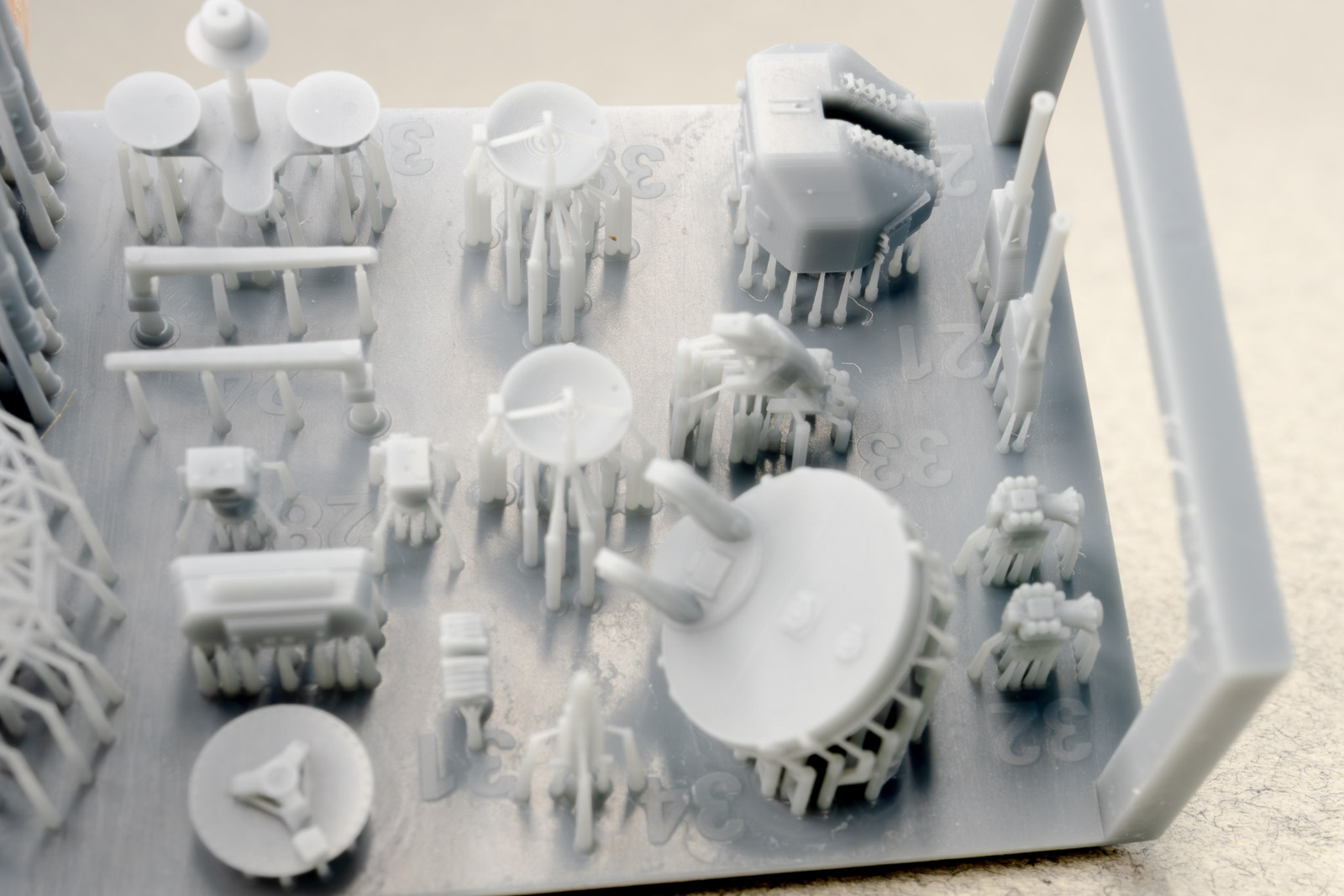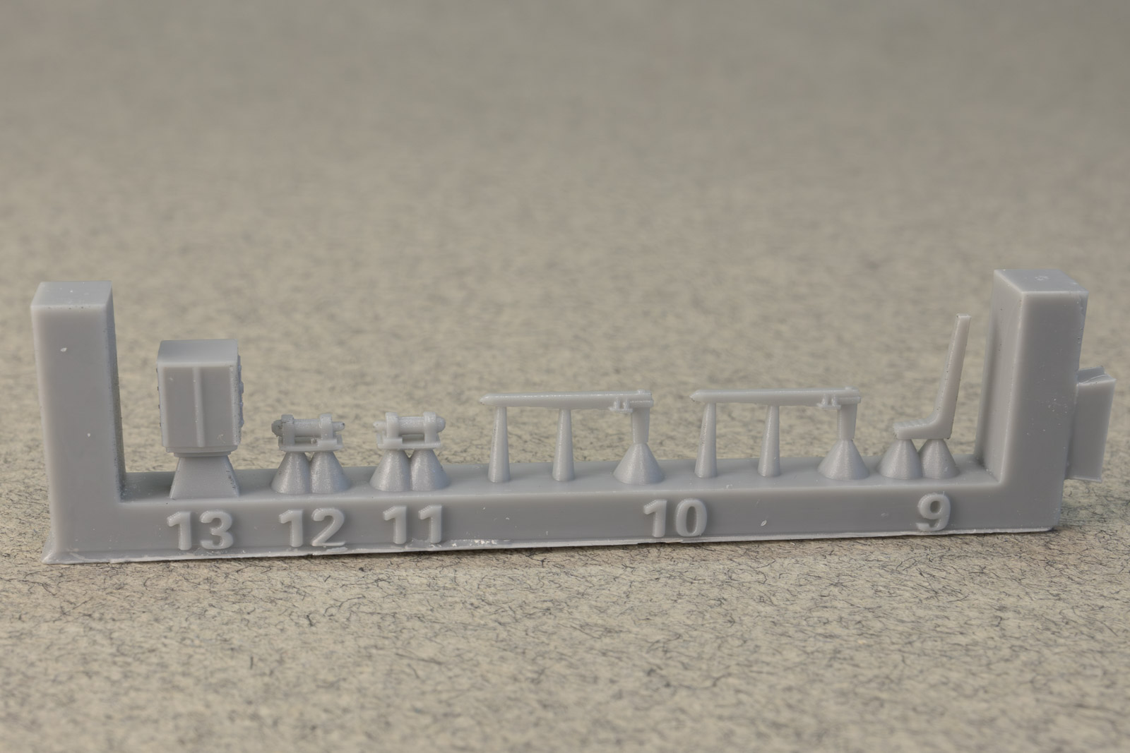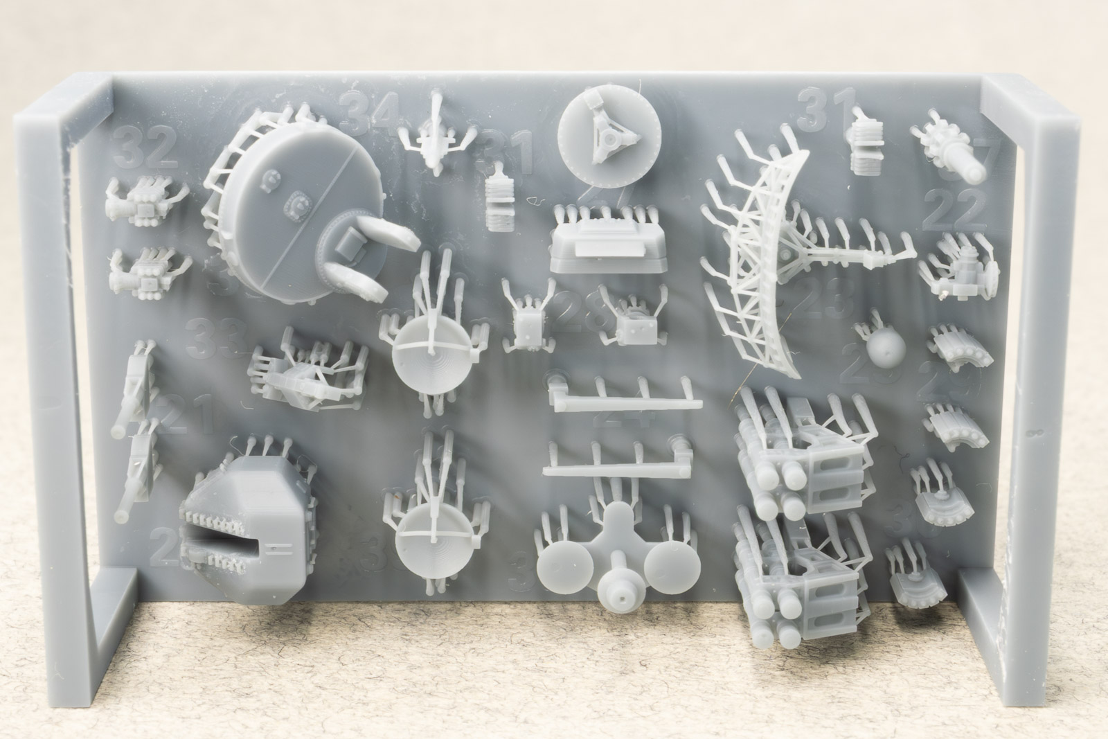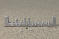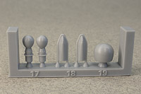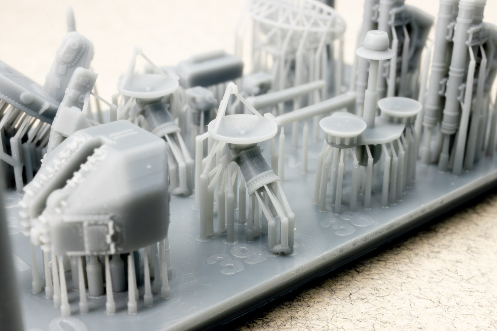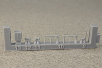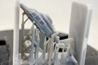 The rest of the printed parts are on a single raft, and include the gun mount, missile launcher base, Harpoon canisters, the SPG 51 missile illuminator, and a mesh search radar, plus other pieces. The fidelity of these parts is amazing. I've seen 1/350th scale printed mesh radar screens before that looked like they'd had one too many grilled cheese sandwiches and ended up on the thick side; still nice, but not as fine as one would like. This mesh radar in 1/700 scale looks in-scale and impressively delicate. Even the supports holding the pieces are thinner than any I've seen before, so I have no doubt these will remove easily with no breakage to the parts. |