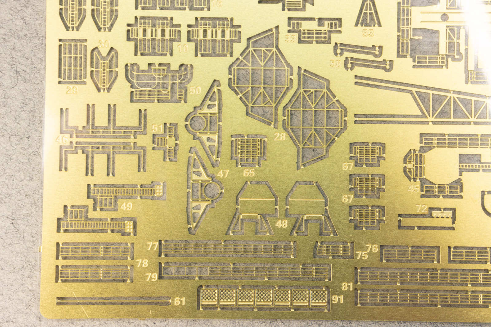 There's one plastic bag that I initially thought empty, only to look closer and see a turned brass gun barrel for the main gun mount. Don't lose it! The rest of the brass is photoetched, with a small square one for the helicopter with both deployed and folded rotors, and other parts that you'll have to find references for, as the helo isn't shown at all in the instructions. Finally the main photoetch fret has all of the normal stuff you'd expect for a ship model: ladders, railings, flight deck safety nets, cages for the Harpoon canisters, and pieces to make up the main mast assembly. Pieces that need to be folded, such as that mast assembly, various platforms, what look to be flag bags, etc., have relief-etched lines to show exactly where to fold and to ease the process. |
