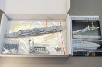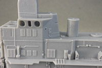 | Cast resin parts are in a plastic bag, with the bridge wings as one separate piece, and four casting blocks with the other items. As can be seen in one photo, four of the smaller pieces broke off of their block, but I found them all, intact, in the plastic bag. There's no parts map in the instructions, but items such as life raft canisters, RHIBs, communication and radar domes, etc. are easily identified. Like the hull, all parts exhibit sharp detail, with no flash, and no air bubbles. | ||