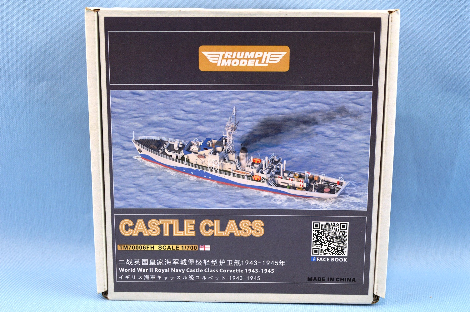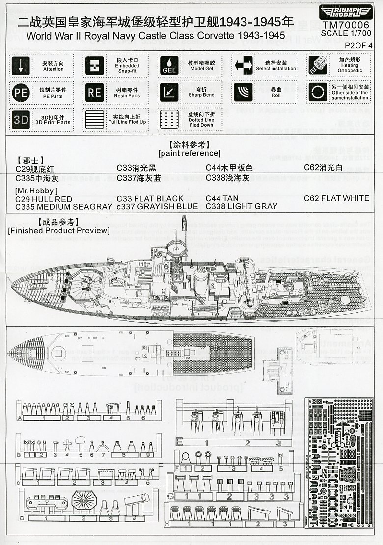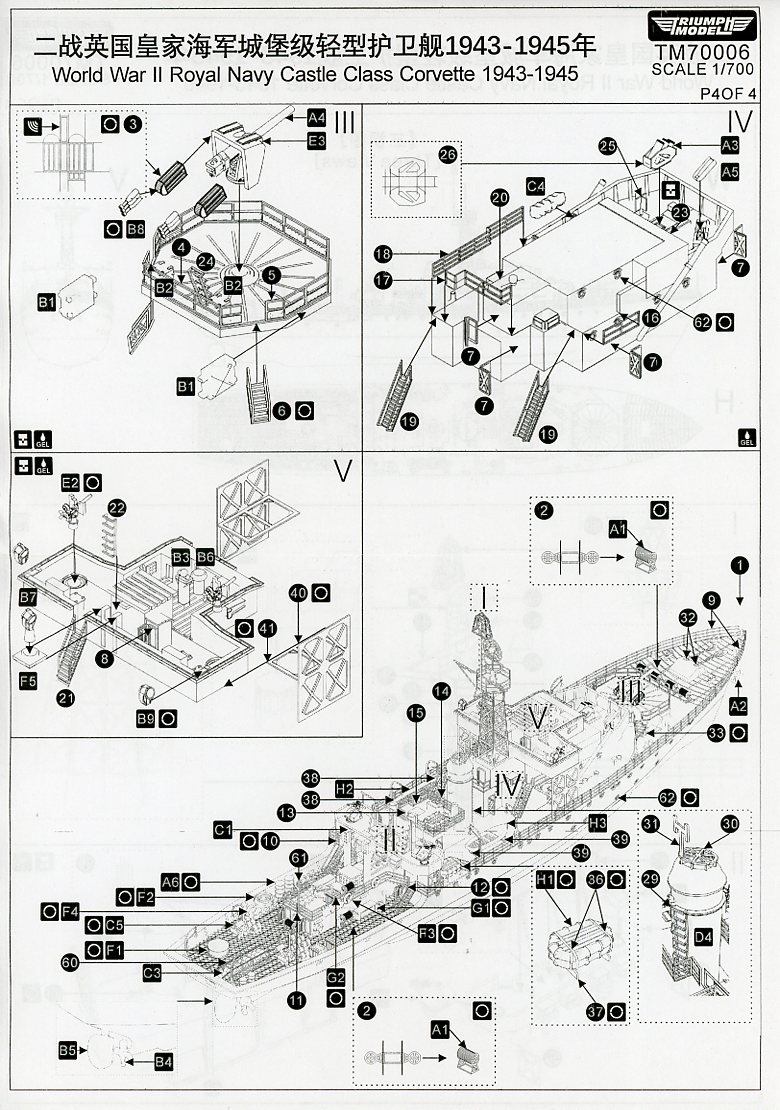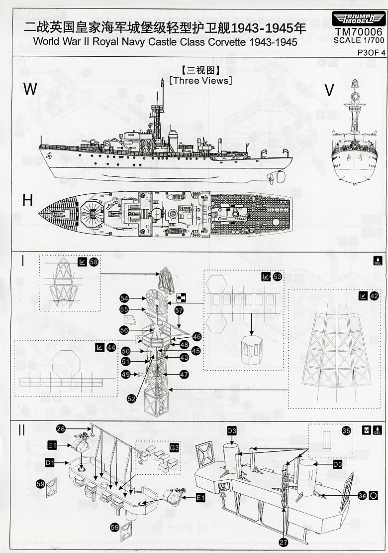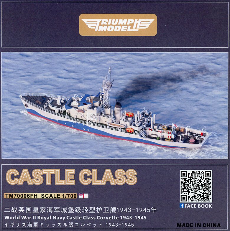 The Castle-class corvettes started appearing in service during late 1943. The Castle resembled later Flowers with an extended forecastle and mast behind the bridge, but was 135 tons heavier and 47 feet longer. The Admiralty Experiment Works at Haslar developed an improved hull form which, in combination with the increased length, made the Castle at least half a knot faster than the Flower despite using the same engine. The Castle also had a single-screw. A lattice mainmast was used instead of the pole version fitted to the Flowers. Construction used mainly traditional methods with as much welding as possible. Scantling was based on the Flower, but lightened in some areas. The wireless office, the radar office, and the lattice mast were installed as prefabricated units. The Castle was armed with a Squid anti-submarine mortar, directed by Type 145 and 147B ASDIC. The Flower used the older Hedgehog mortar and could not be fitted with Squid. The first operational Type 147 and Squid were installed aboard HMS Hadleigh Castle in September 1943. In place of the BL 4-inch Mk IX main gun, the Castles had the new QF 4-inch Mk XIX gun on a High-Angle/Low-Angle mounting which could be used against aircraft as well as surface targets such as submarines. For further information, check out the Wikipedia page (where this information came from) for her class here. |