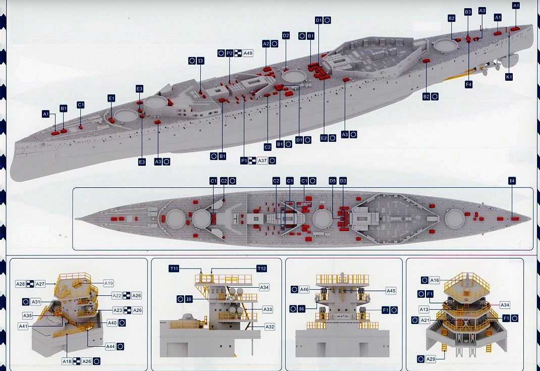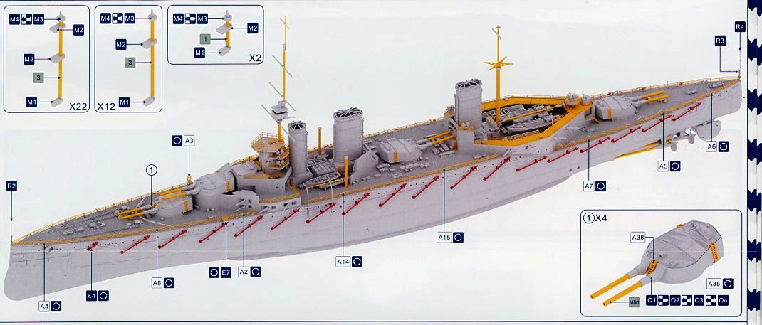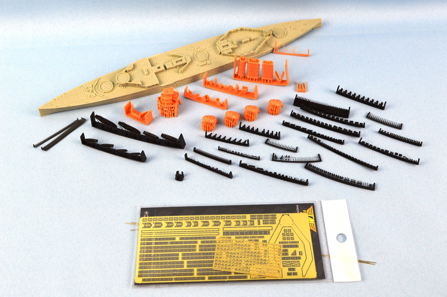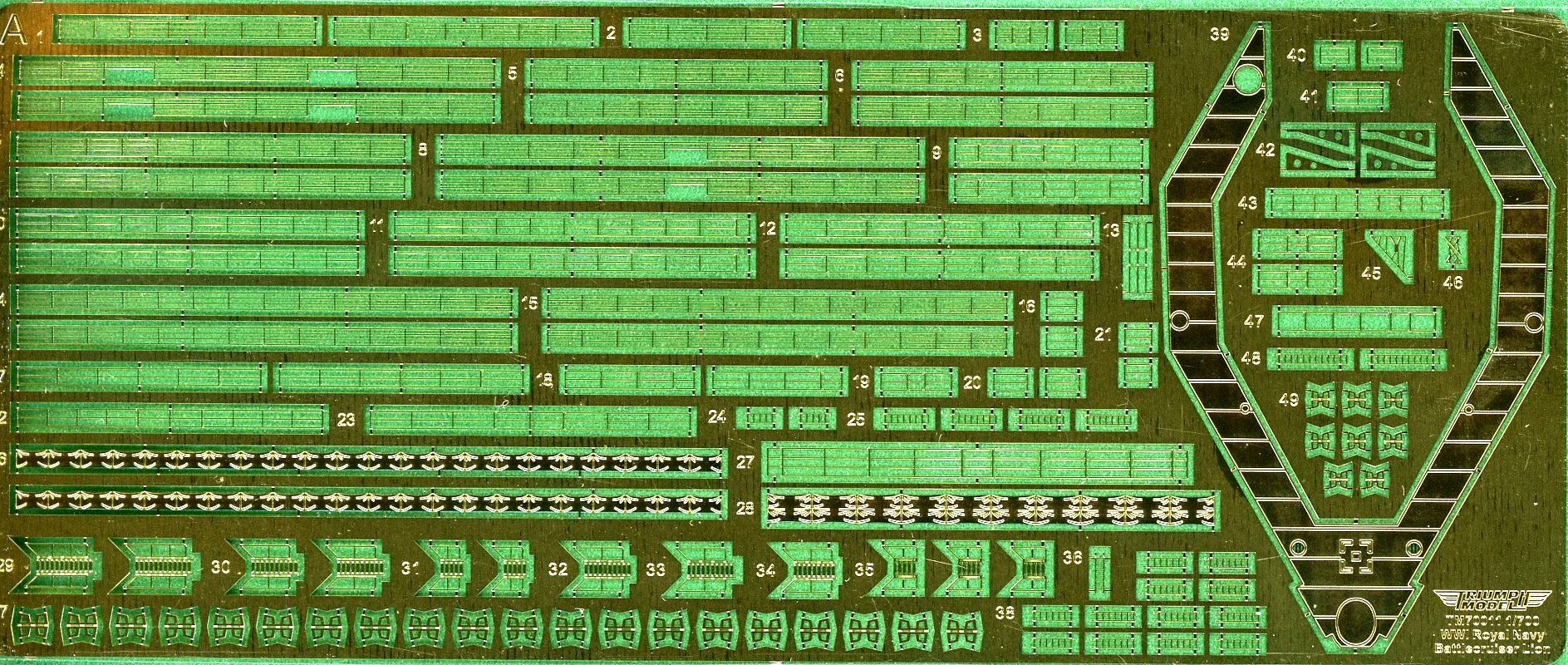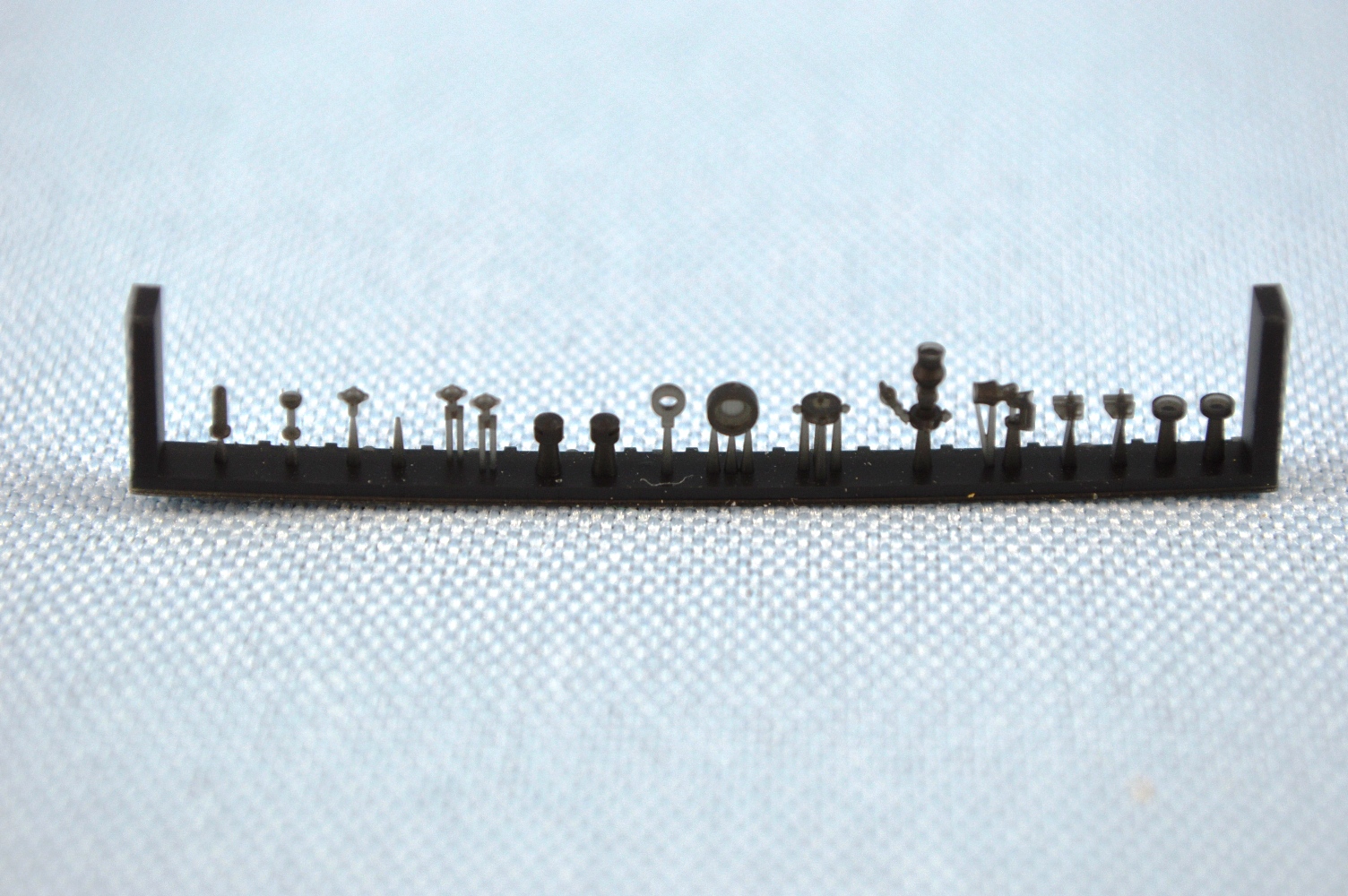 | Three photo-etch frets come with the model. Included on the largest fret are railings - with and without "canvas dodgers" - boat cradles, inclined ladders, vertical ladders, supports, and the deck for the aft casemate/ boat stowage area. The middle sized fret has what looks like portholes on it, while the smallest fret has two inclined ladders and small plaques with the ships name on it. | |||||||||||||||||||||||||||||||||||||