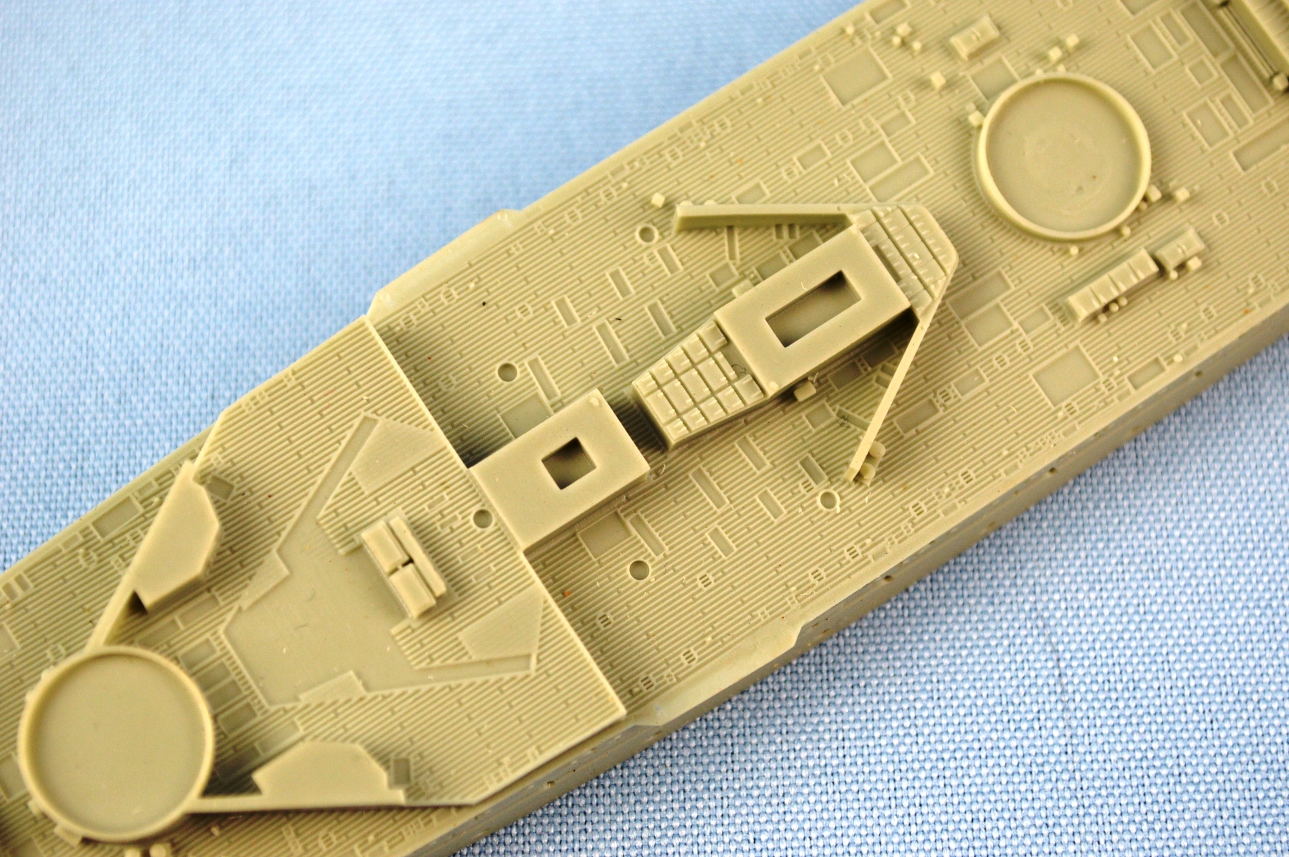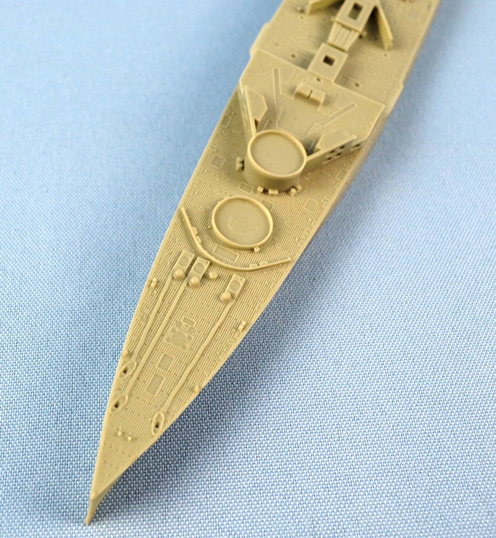 There are nice portholes with eyebrows on the hull, as well as clever openings in the sides of the hull, which are to accommodate the torpedo net davits, those being a combination of brass rod and 3D printed parts (the 3D printed parts will slot into the hull opening). The parts of the superstructure cast integral to the hull - like the aft casemate/ boat stowage area - have finely detail watertight doors and more of the same portholes found on the hull sides. |