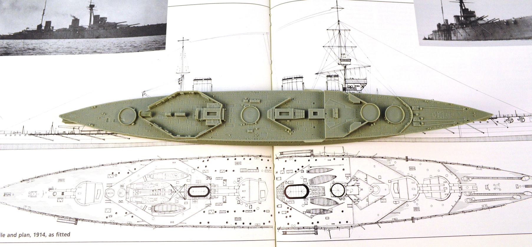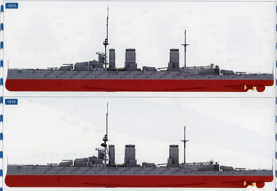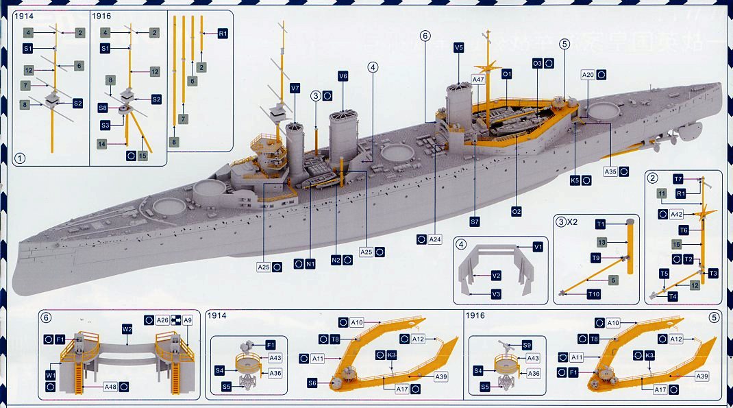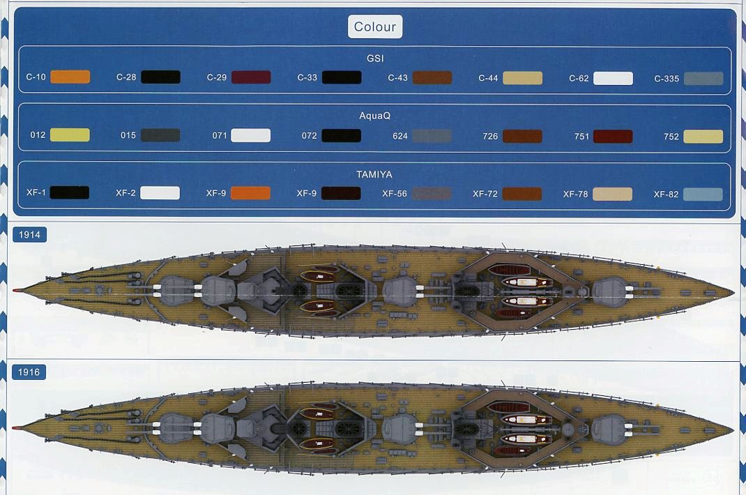 The bottom of the back side of the instructions has the color callouts, showing Lion in a dark grey. As far as I can tell from looking at my references, and online, Lion was wearing light gray by the latter stages of 1914. At one point she was painted overall light gray, with a dark gray band on the hull, and possibly bands on her funnels, like Tiger. She was definitely painted overall light gray by time Jutland rolled around. As always, check your references. |