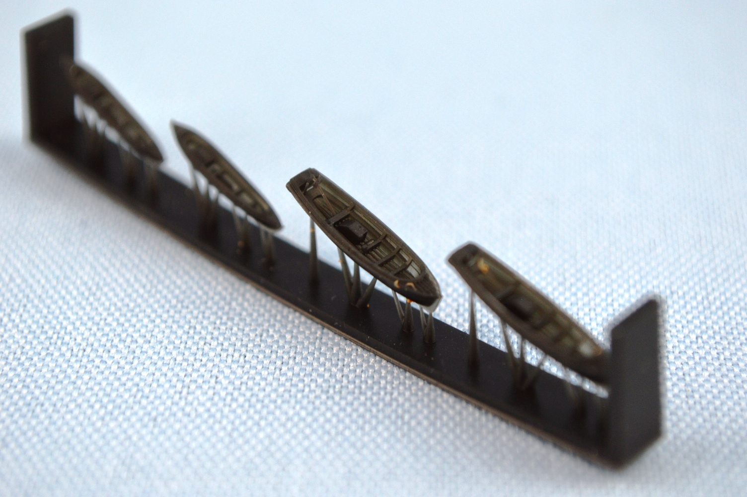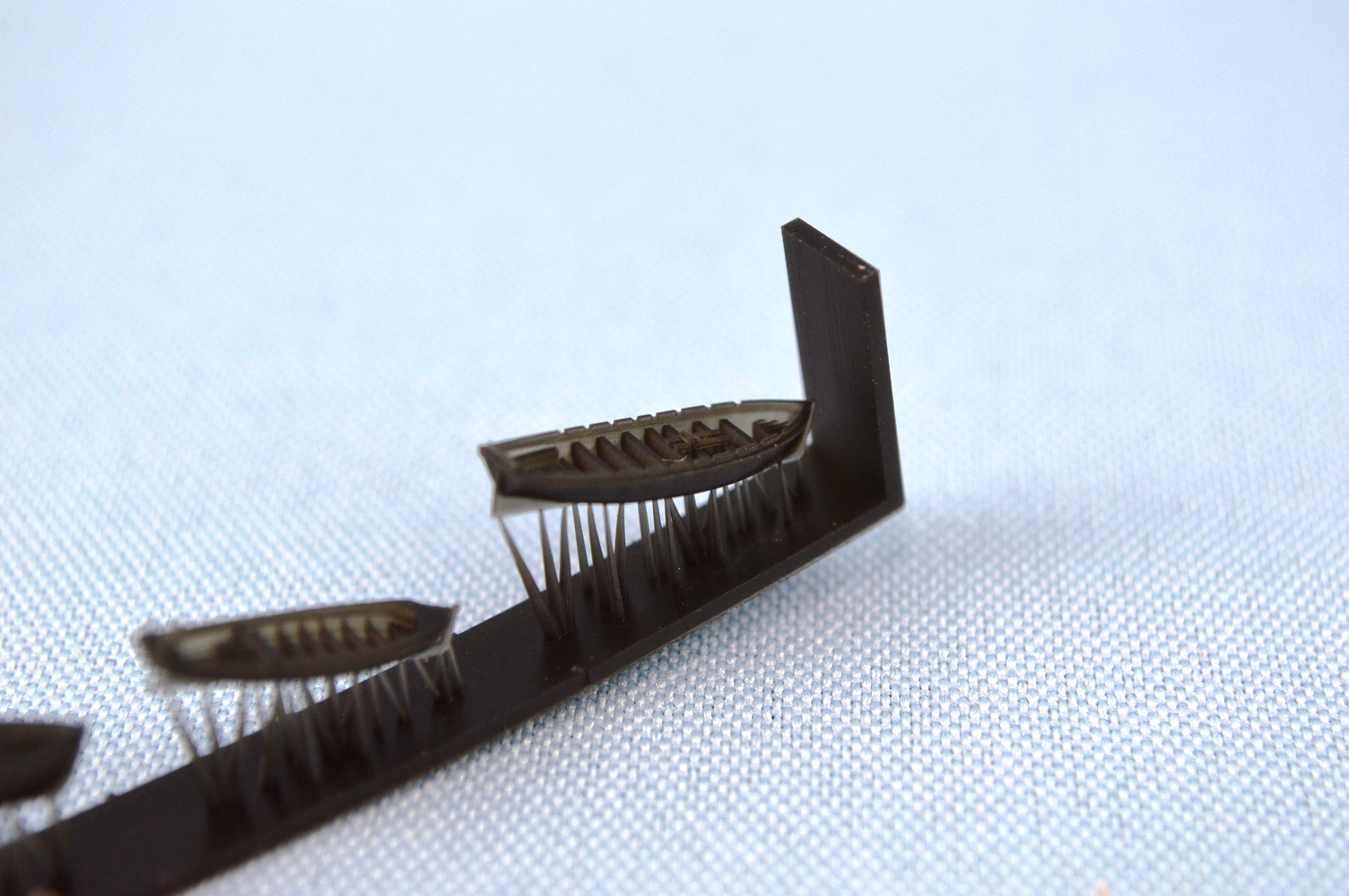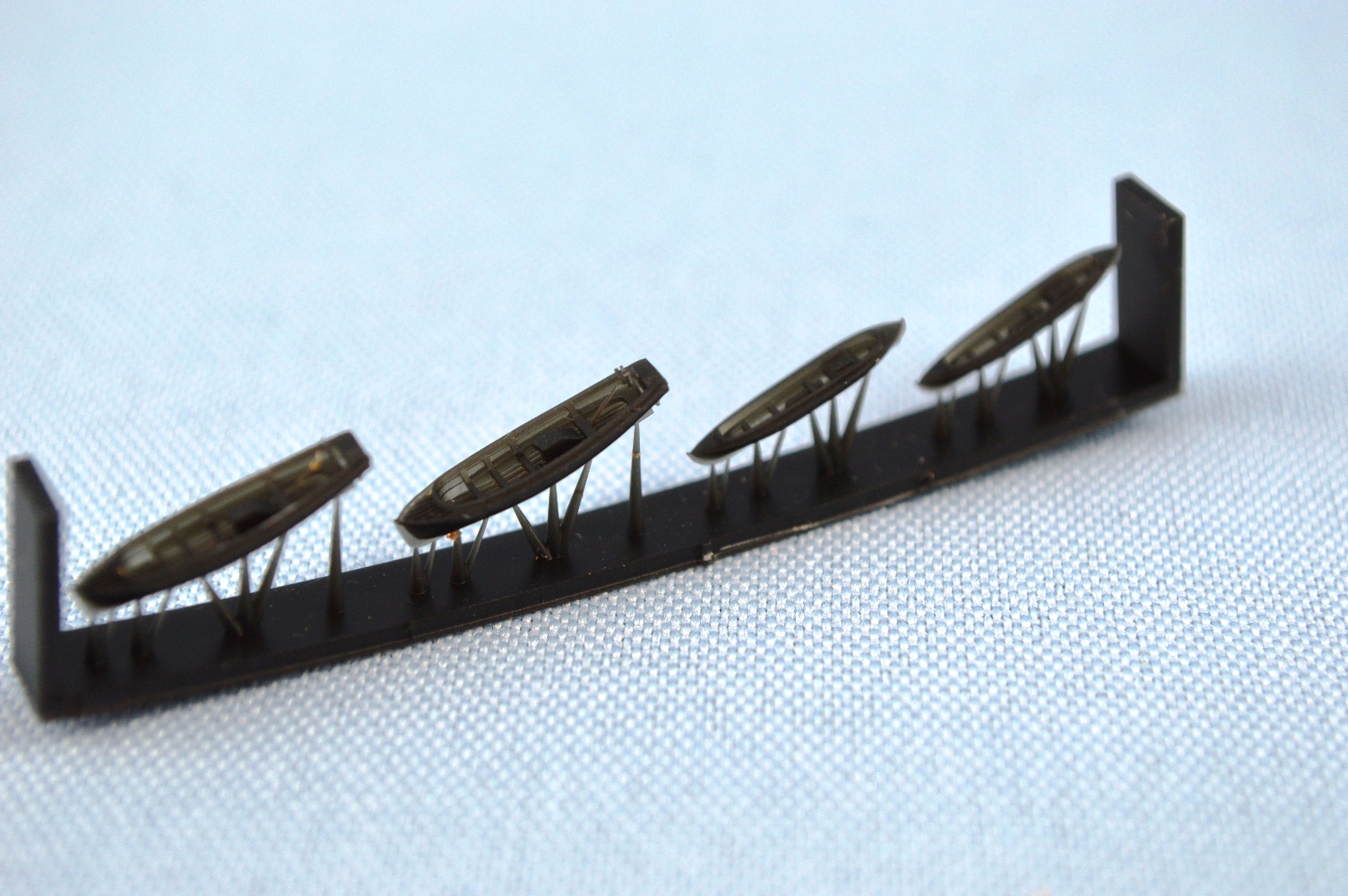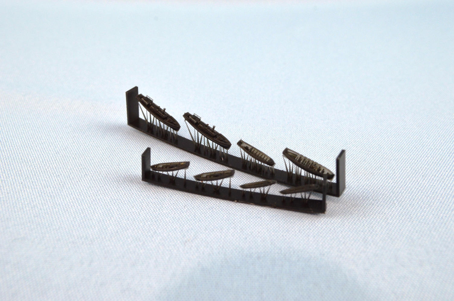 | There are two print rafts, each holding four ships boats. Details are nicely done, with fine rails on the tops of the cabins of the powered boats, and decking detail on the decks of some of the other boats. Some of these are printed some finely that the sides of some the hulls are translucent. | |||||||||||||||||||||||||||||||||||||