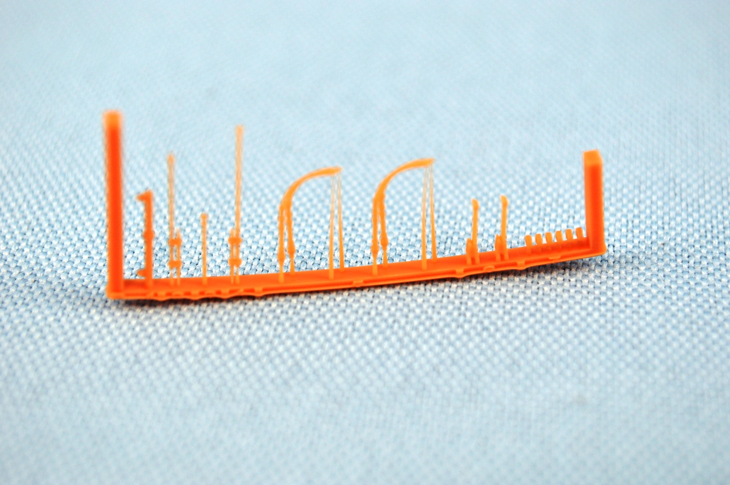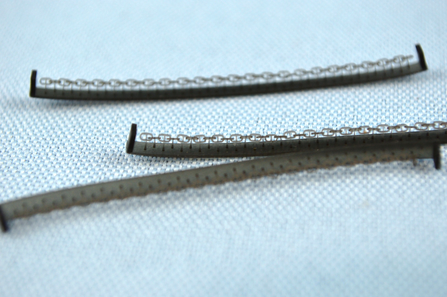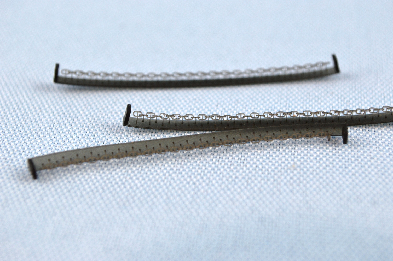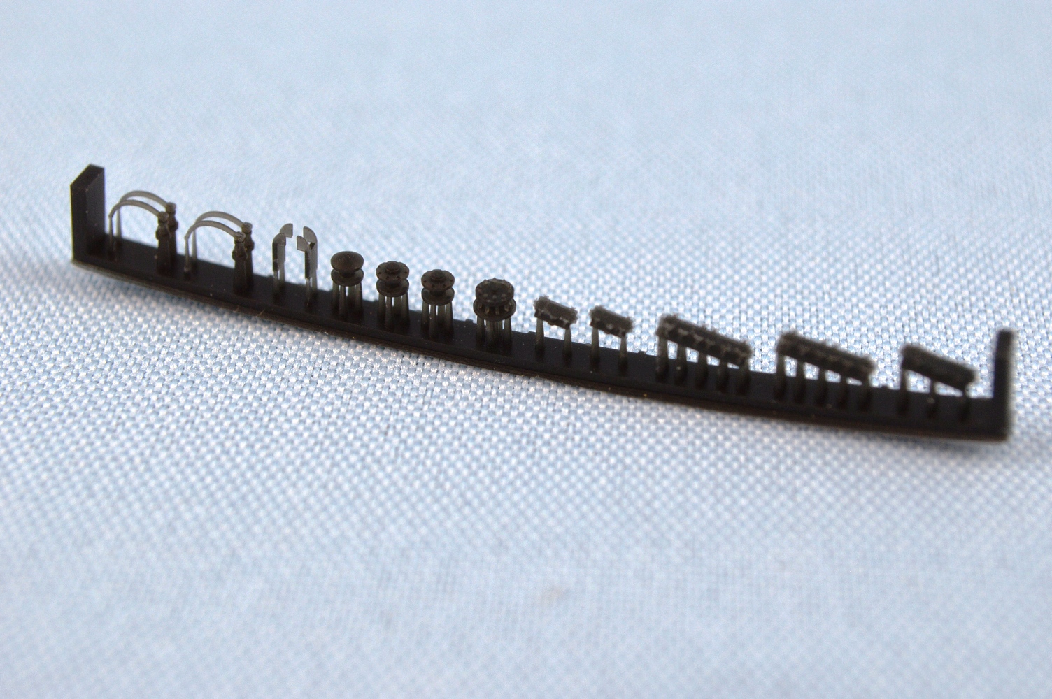 | The rest of the 3D print runners contain a variety of items, Detail is generally very thin and finely done. The only parts I question are the anchors, as the shape at the tops of the flukes looks a bit too squared off to me. Among the parts on the rest of these rafts are: boat cradles, cable reels, davits, vents, bridge equipment, the aforementioned parts for the torpedo net davits, as well as lots and lots and lots of (what I assume are) deck hatches in various shapes and sizes. There is also a print raft that contains nothing but small davits for the torpedo nets. These are very small and very finely printed. They'd also be a nice item to be packaged and sold separately to use on other manufactures World War I battleships and battlecruisers. Finally, there are three print rafts containing anchor chain. These are incredibly delicate looking. It amazes me that these can even be printed. | |||||||||||||||||||||||||||||||||||||