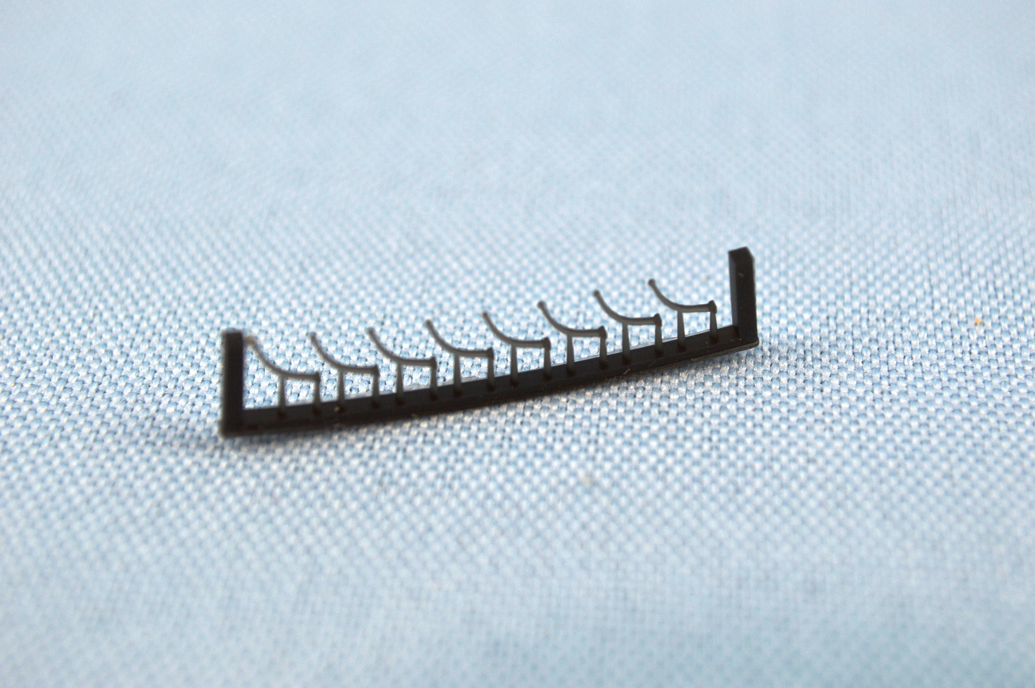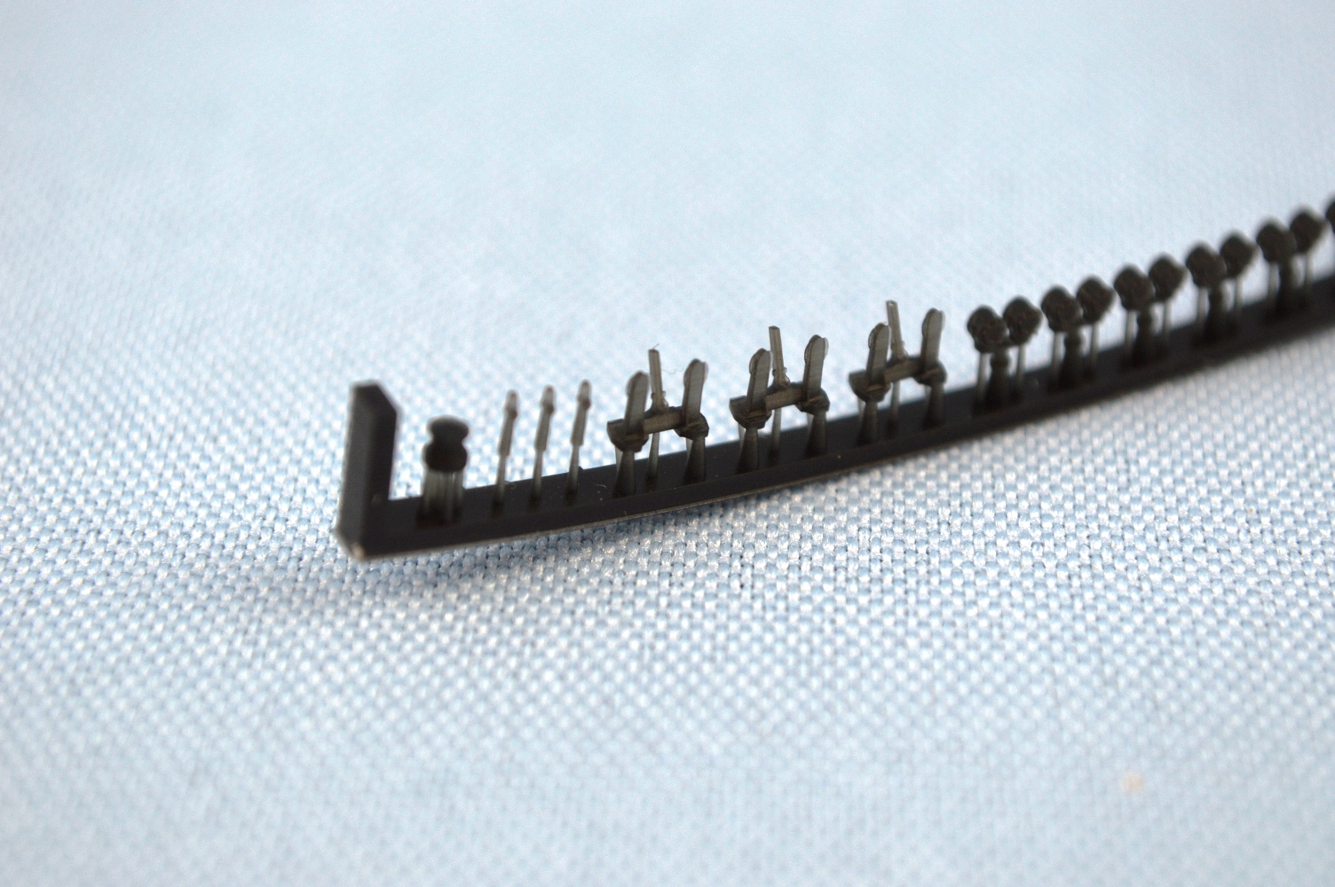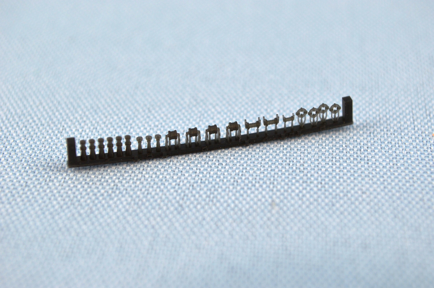 | The rest of the 3D print runners contain a variety of items, Detail is generally very thin and finely done. The only parts I question are the anchors, as the shape at the tops of the flukes looks a bit too squared off to me. Among the parts on the rest of these rafts are: boat cradles, cable reels, davits, vents, bridge equipment, the aforementioned parts for the torpedo net davits, as well as lots and lots and lots of (what I assume are) deck hatches in various shapes and sizes. There is also a print raft that contains nothing but small davits for the torpedo nets. These are very small and very finely printed. They'd also be a nice item to be packaged and sold separately to use on other manufactures World War I battleships and battlecruisers. Finally, there are three print rafts containing anchor chain. These are incredibly delicate looking. It amazes me that these can even be printed. | |||||||||||||||||||||||||||||||||||||