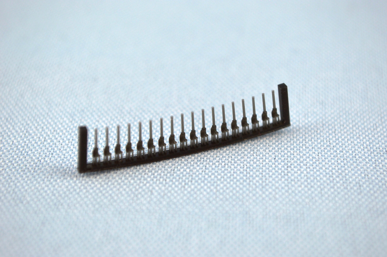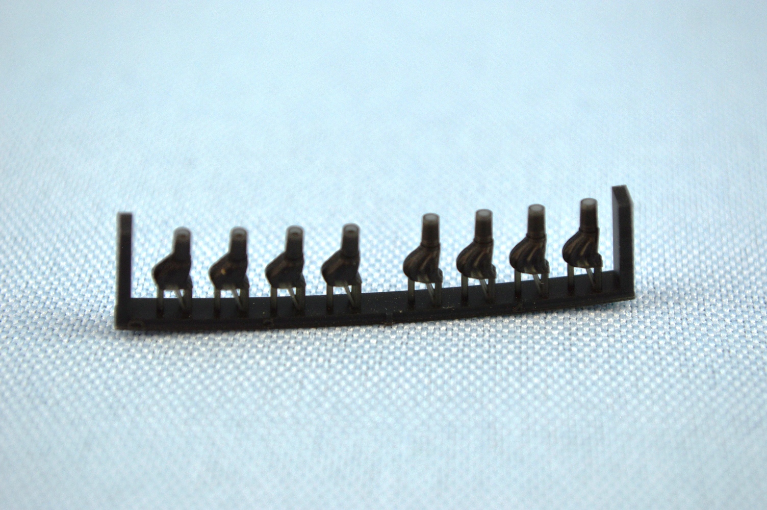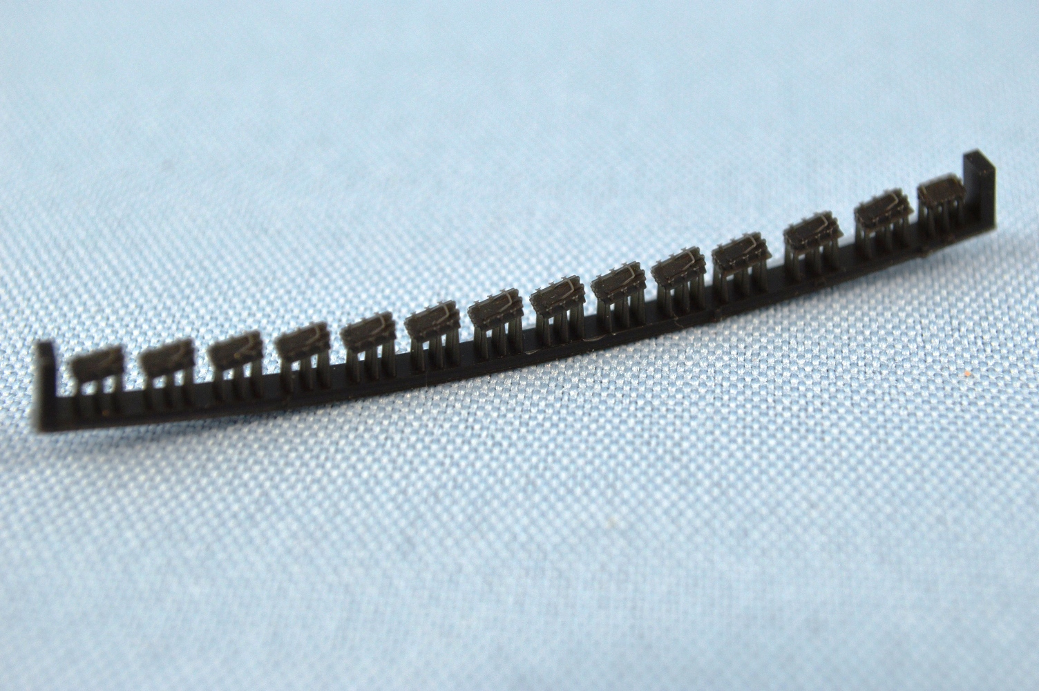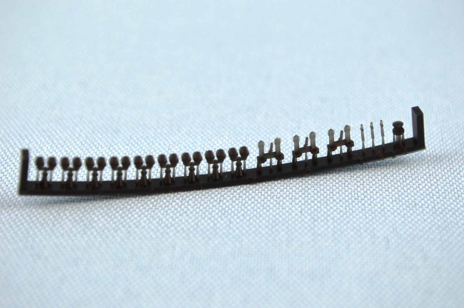 | The rest of the 3D print runners contain a variety of items, Detail is generally very thin and finely done. The only parts I question are the anchors, as the shape at the tops of the flukes looks a bit too squared off to me. Among the parts on the rest of these rafts are: boat cradles, cable reels, davits, vents, bridge equipment, the aforementioned parts for the torpedo net davits, as well as lots and lots and lots of (what I assume are) deck hatches in various shapes and sizes. There is also a print raft that contains nothing but small davits for the torpedo nets. These are very small and very finely printed. They'd also be a nice item to be packaged and sold separately to use on other manufactures World War I battleships and battlecruisers. Finally, there are three print rafts containing anchor chain. These are incredibly delicate looking. It amazes me that these can even be printed. | |||||||||||||||||||||||||||||||||||||