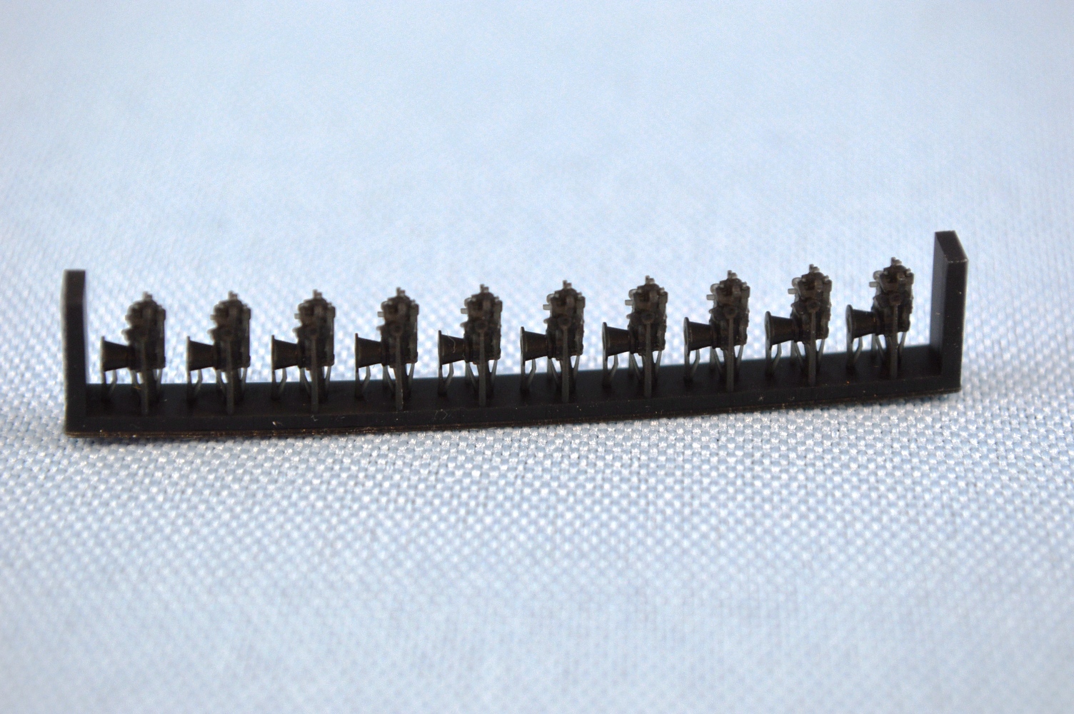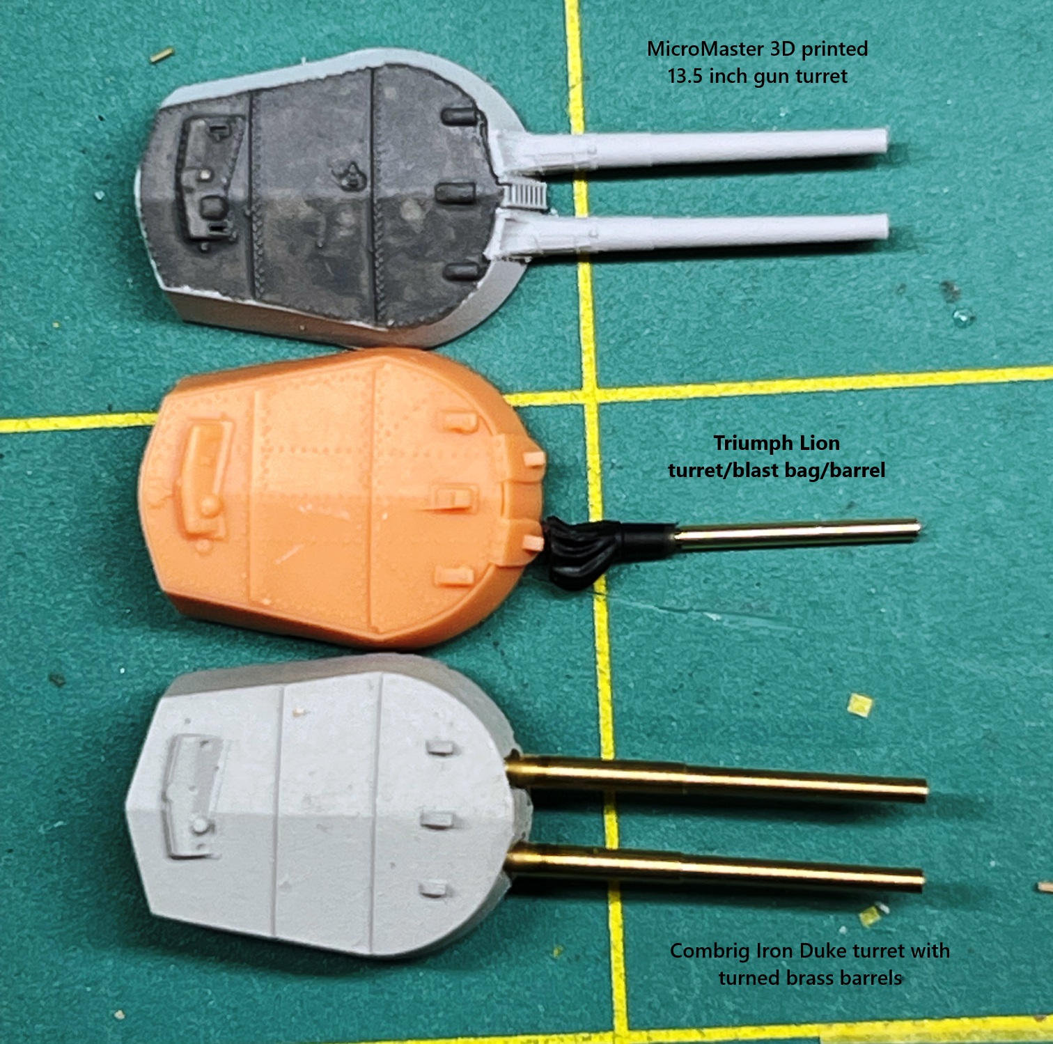 | There are eight print rafts dedicated to the main and secondary weapons. Four of these are the main battery turrets, which have nice details. Although had to see with the Mk1 eyeball, there is rivet detail on the turret roofs, and the sighting hoods are open at the front. The other weapons rafts consist of blast bags - there are two different sets, each with a different orientation, so you can adjust the elevation of the main barrels - as well as barrels for the secondary battery (these have small blast bags) and a very small print raft with a single 3" AA gun, for those building the 1916 version of Lion. | |||||||||||||||||||||||||||||||||||||