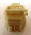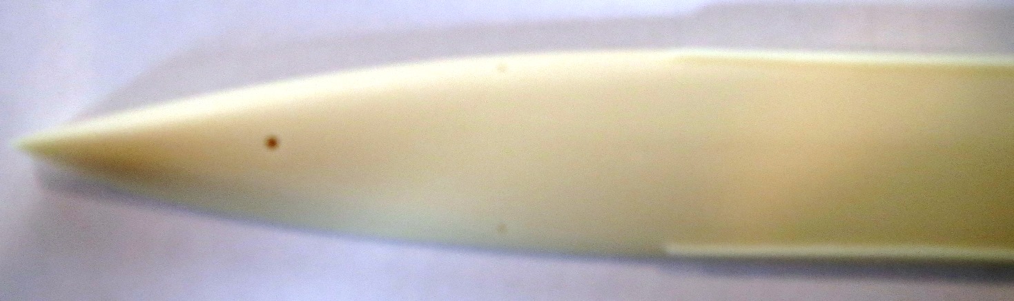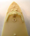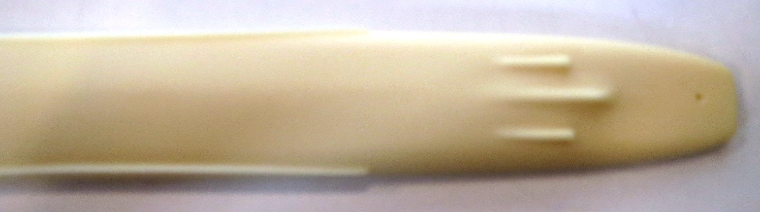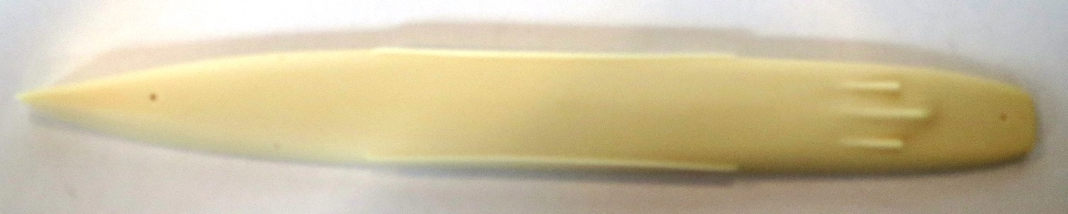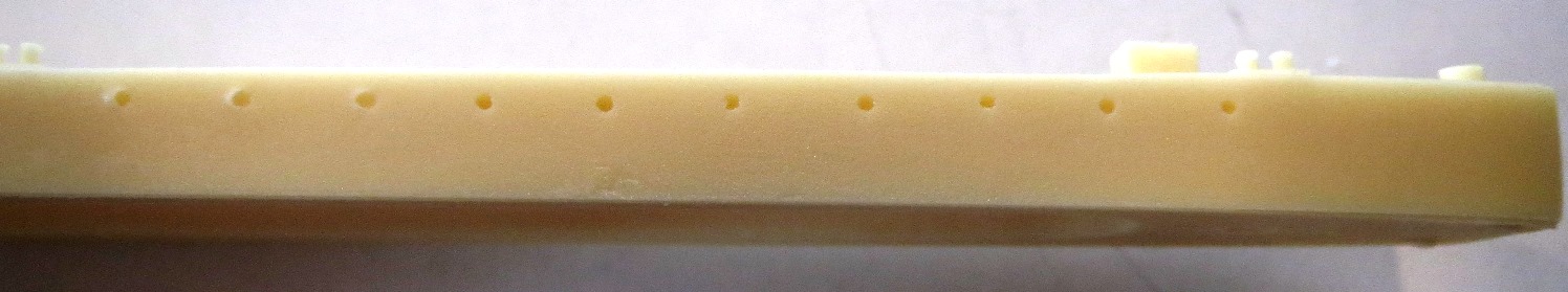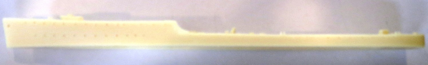 If you plan to build a full-hull model you will see corresponding pins and holes at the bow and stern and midway on the lower hull you will see tabs to help align the upper and lower hulls when gluing the two parts together. Before joining the two halves you will have to sand down several bumps which appear to be the resin equivalent injector pin marks. Some putty will probably be required to fill in the joint. With an overall length 279 ft and 10 inches, in 1:350 that would measure out to about 9.6 inches. The kit hull length measures spot on as well as in the beam. |