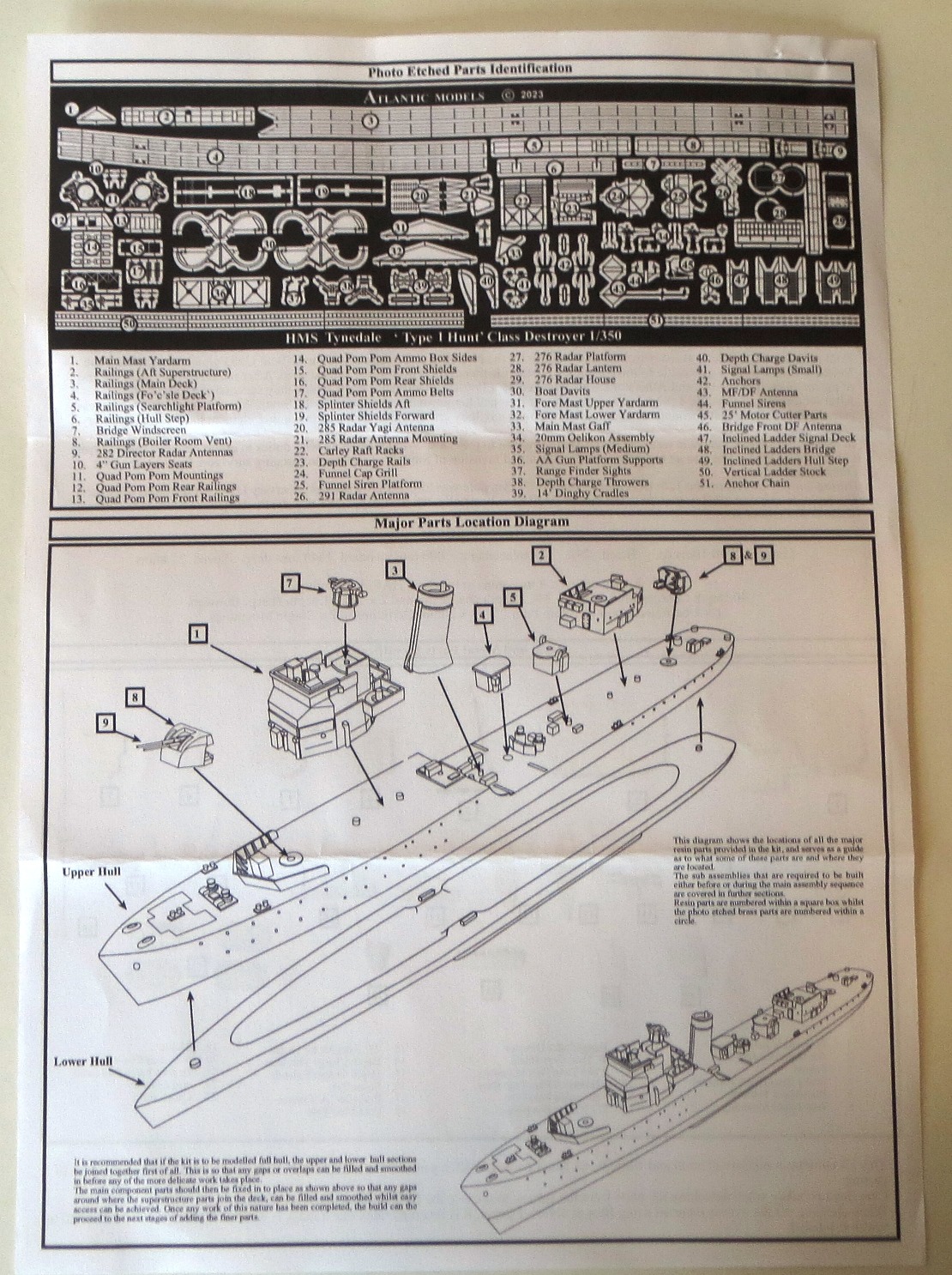 | The HMS Tynedale kit is another excellent release from Atlantic Models that will build into an excellent model of a Hunt Type I ship. It is a worthy follow up to the HMS Badsworth kit that was released prior. With additional research and references will be needed to build a different Type I Hunt, but the necessary parts are provided to realize that. This kit is available from Atlantic Models directly for £77.95 or approximately $104.00 US at the exchange rate at the time of this review. This kit is highly recommended, especially for Royal Navy enthusiasts. | |||||||||||||||