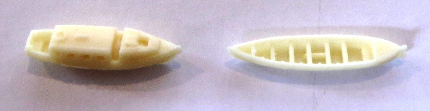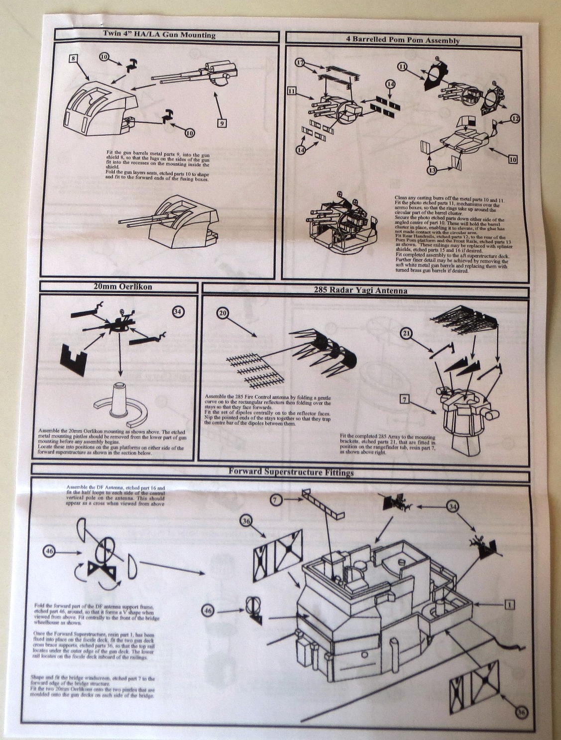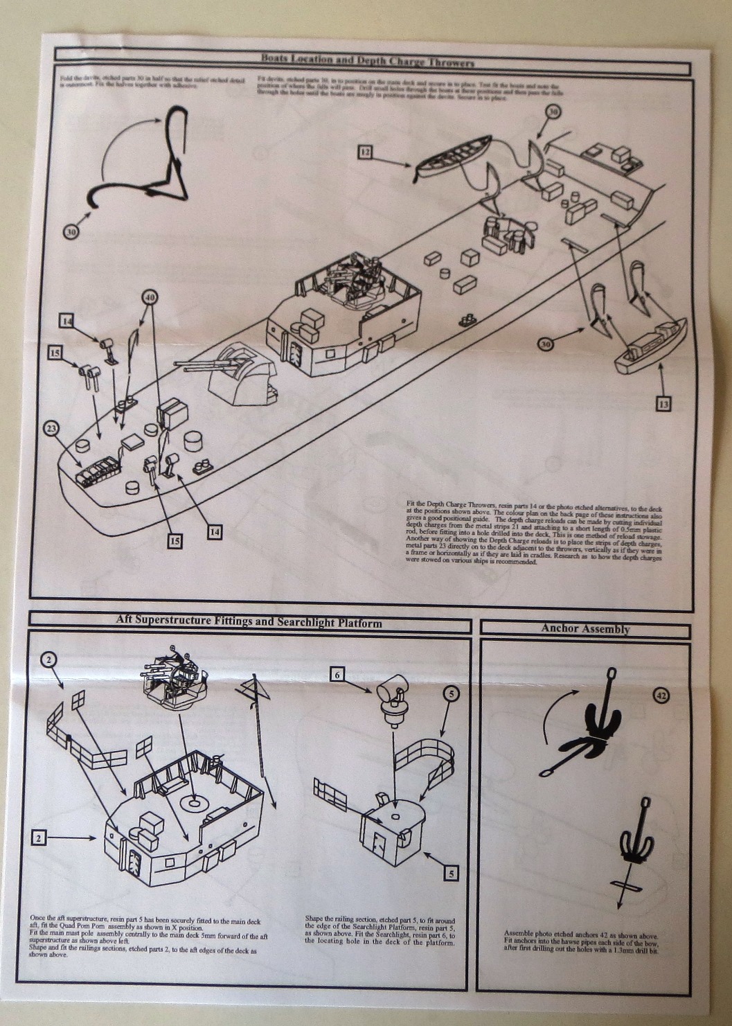 The smaller resin parts include the 4-inch gun shields, searchlight, rangefinder director, 4-barreled Pom Pom base, 27’ whaler, 25’ Admiral motor cutter and depth charge throwers. The casting is very good with some minor cleanup of excess resin in some spots. |