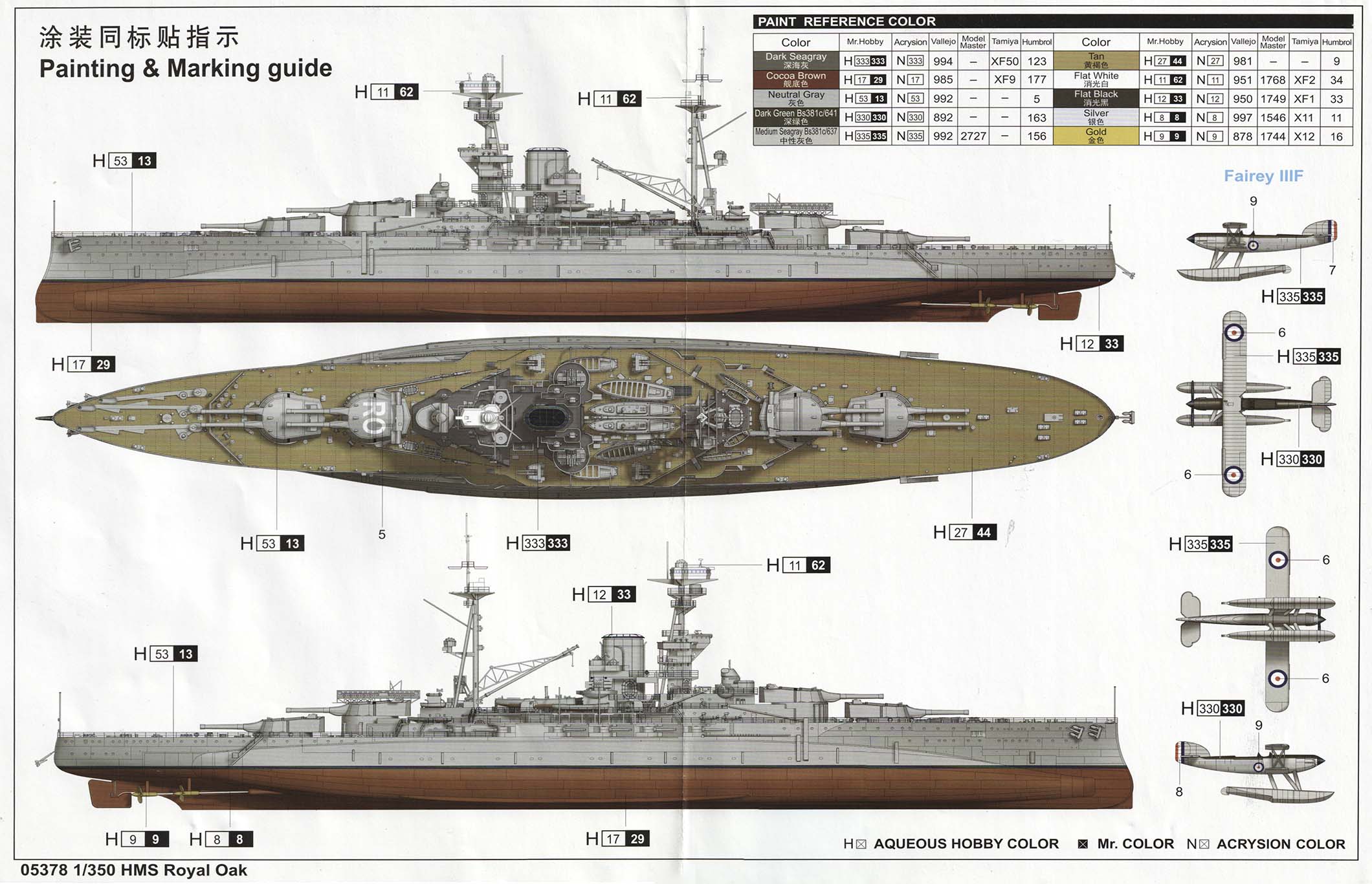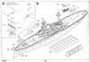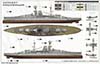 A 20-page instructions booklet is included that should be immediately familiar to anyone who has built a Trumpeter kit before. Exploded view line drawings walk the builder through a 40-step build process. Order of assembly is largely OK - largely sub assemblies are built up in a manner that will help minimize the possibility of damage, but there are a few cases where the order could have been changed for better protection of fragile parts (for example, putting the propellers, shafts and struts on after the main deck pieces instead of before). There is a color profile of the ship included as well, with color call outs for matching paints from a variety of modern manufacturers, including Mr. Hobby, Vallejo, Tamiya and Humbrol, but no data for actual Royal Navy paint is present. Paint at the time of loss was APC507B above the waterline with metal decks either covered in corticine or APC507A (and wood, of course). Royal Oak's anti-fouling was Gray as per Richard Dennis and not the "cocoa brown" called out for by the color sheet. |