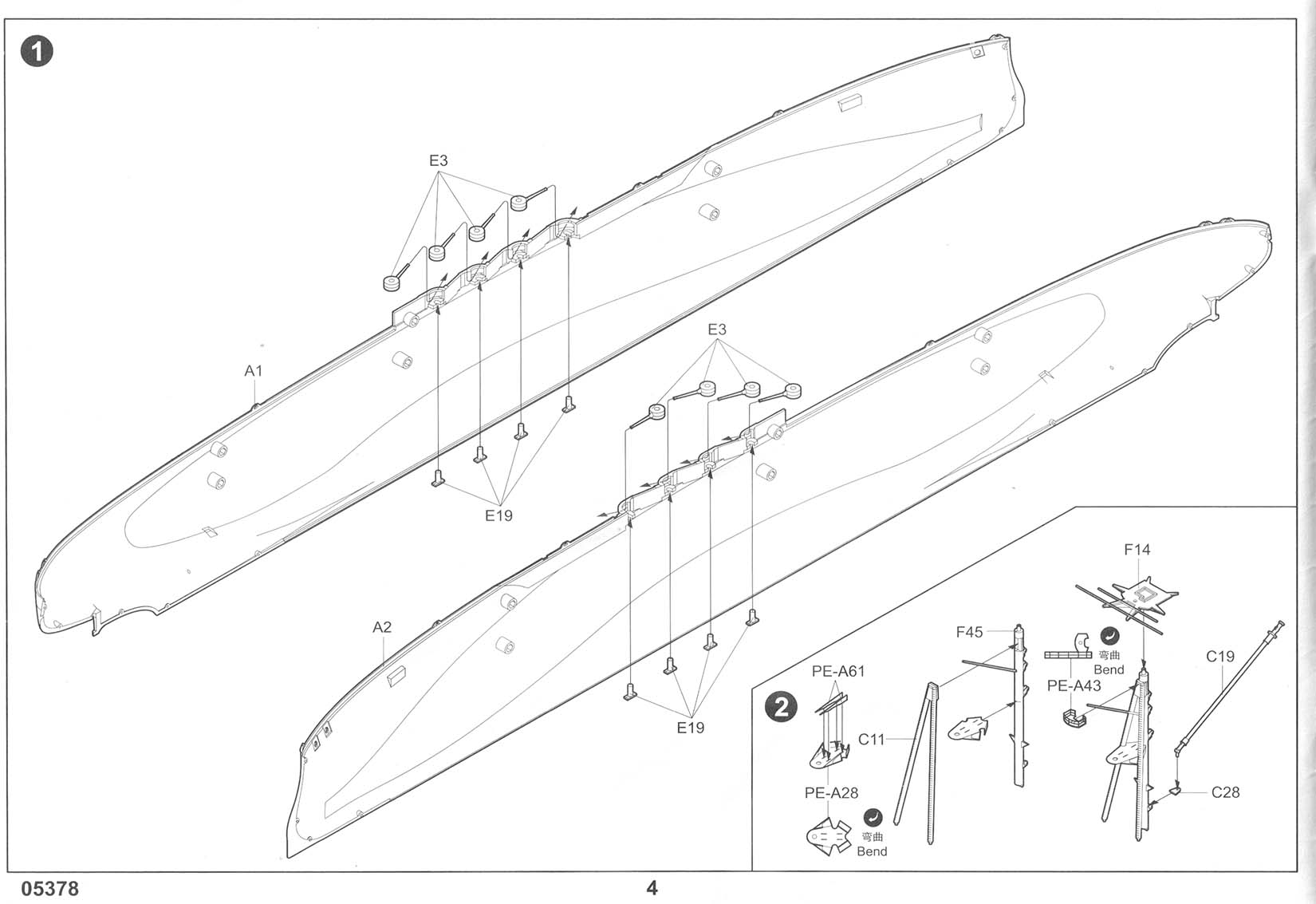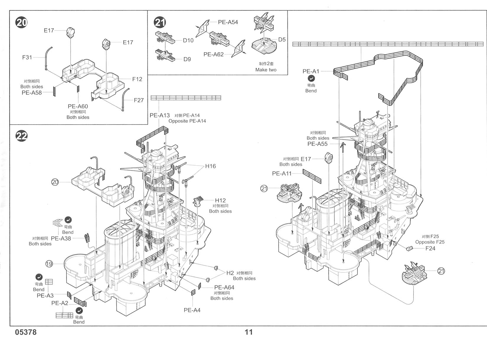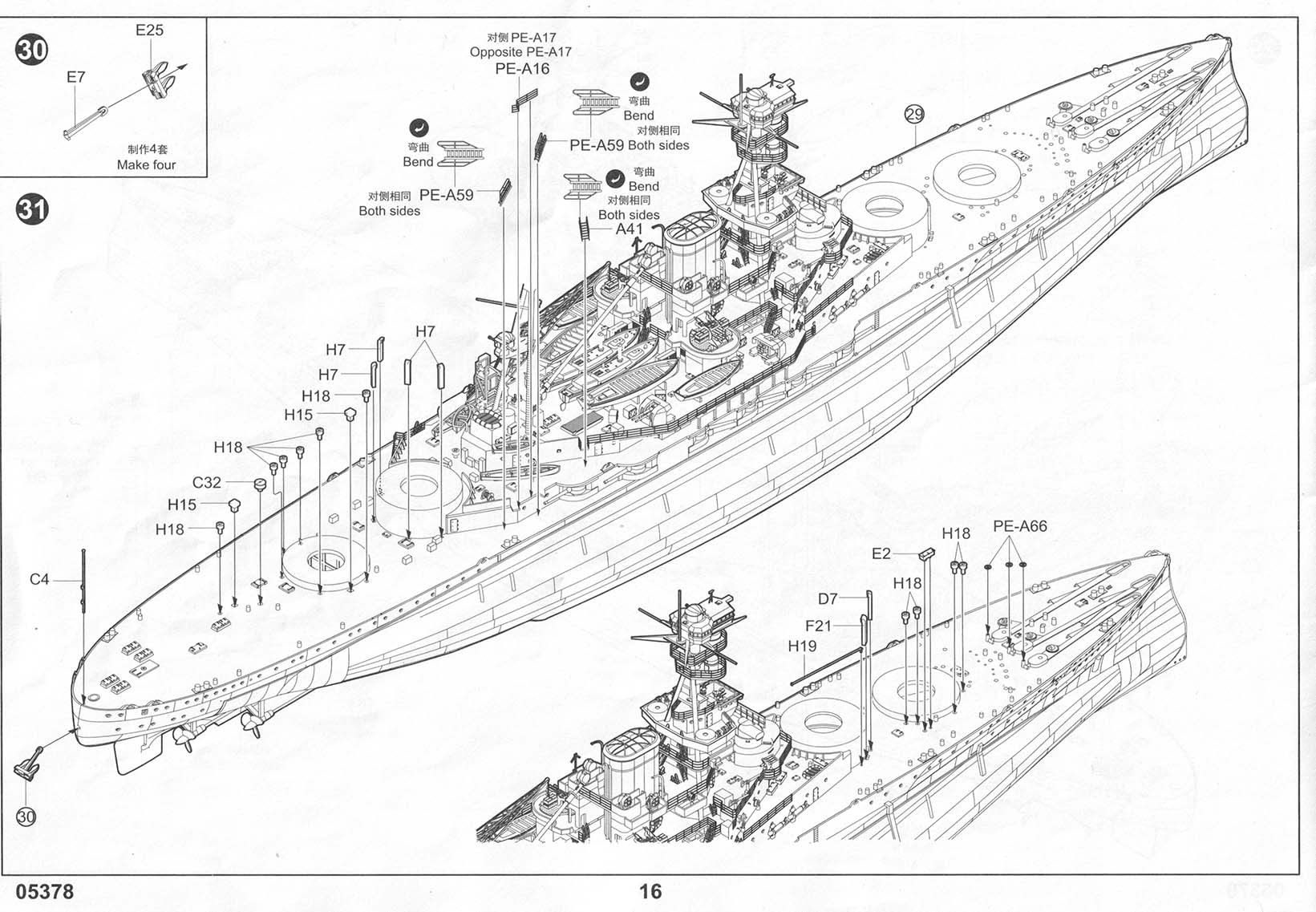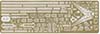 There are three photo-etch frets included in the kit, providing all of the deck-edge stanchion required. PE-A has individualized pieces, such as the inclined ladders, crane truss, and pre-sized pieces for certain platforms. PE-B has eight lengths of a standard three-bar railing as well as one section of shorter three-bar railing marked as "PE-B2" that I can find no reference to in the instructions. It's possible that this is meant for the boat deck area on the shelter deck level, but I am not sure. Regardless, there should be sections of two-bar railings for the conning tower level (including the separate pom-pom platforms), the two director platforms on the forward mast, and the incinerator house on the shelter deck immediately aft of the funnel (in between the Pom-Pom platforms but a level down, more or less). This is an OK basic set but leaves room for third parties to step in with more complete sets. |