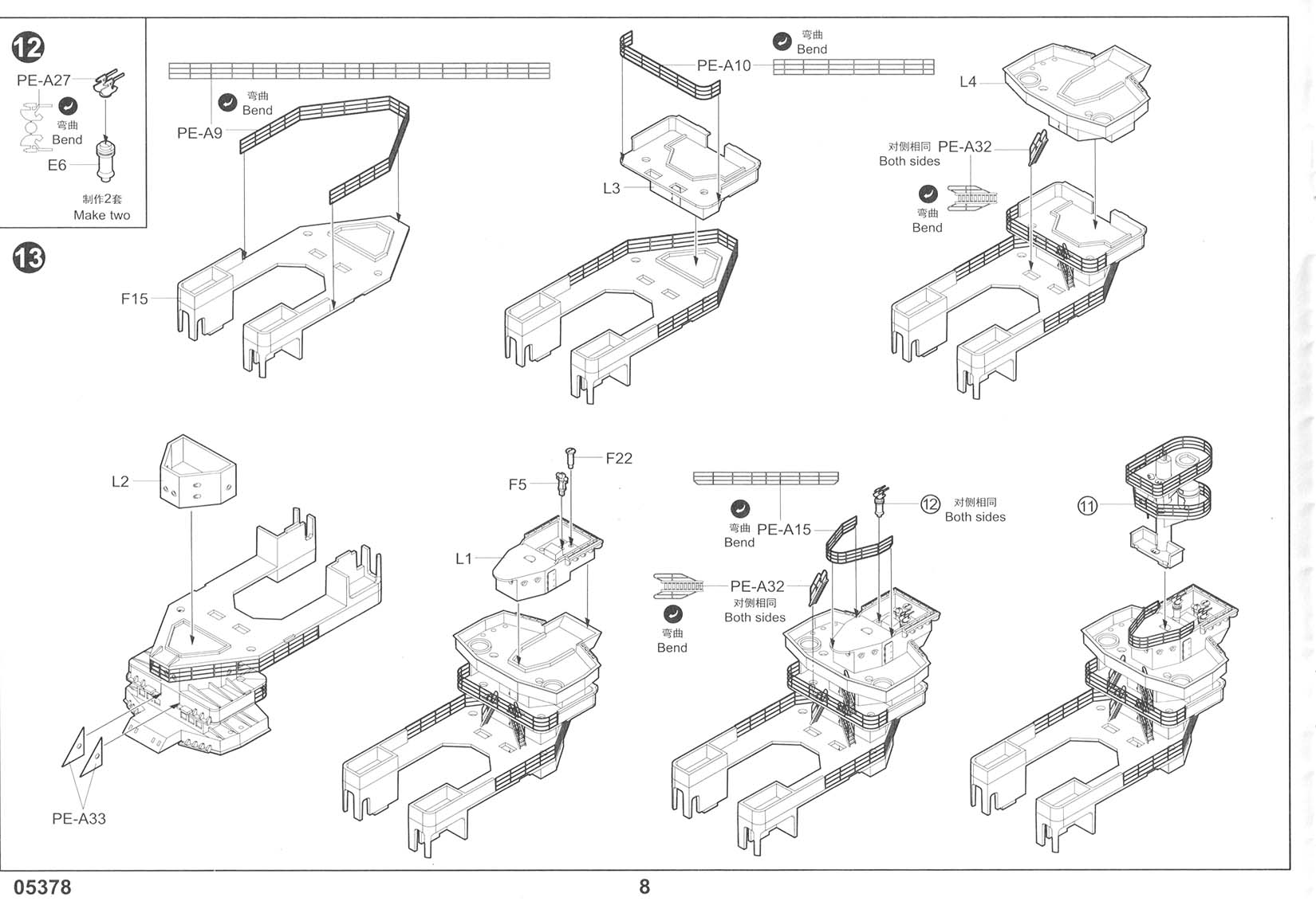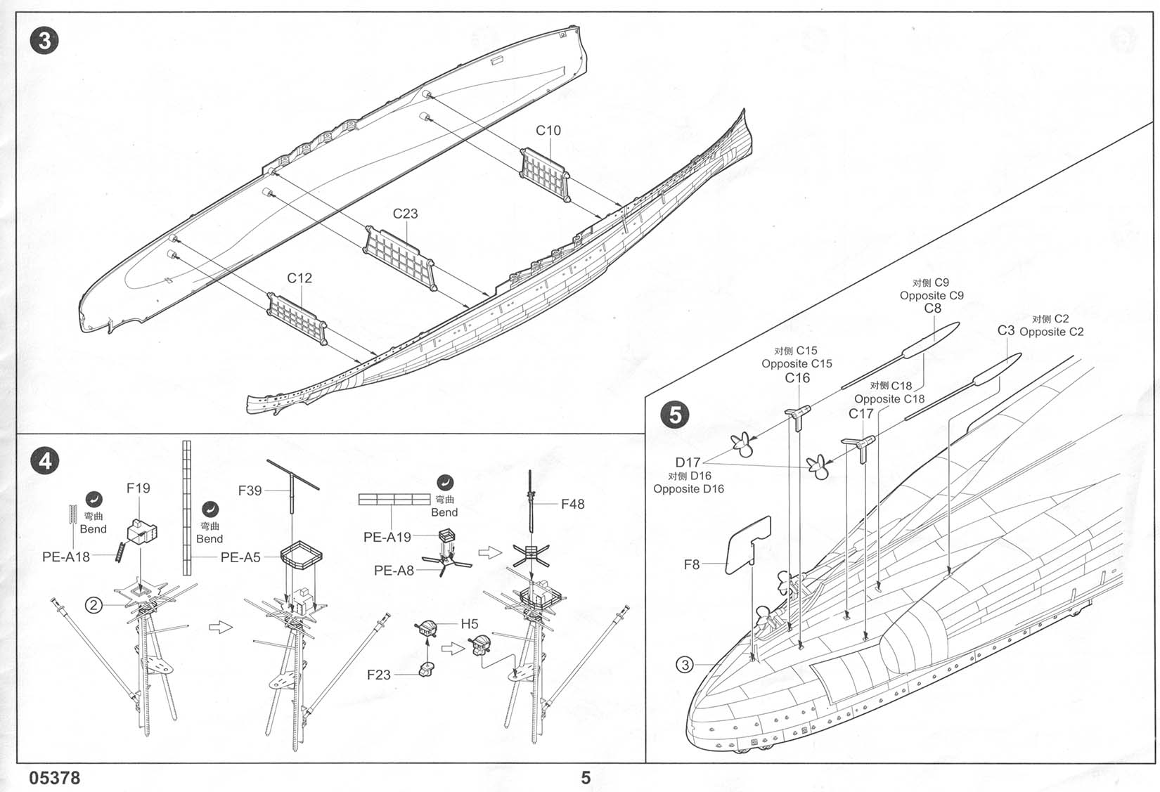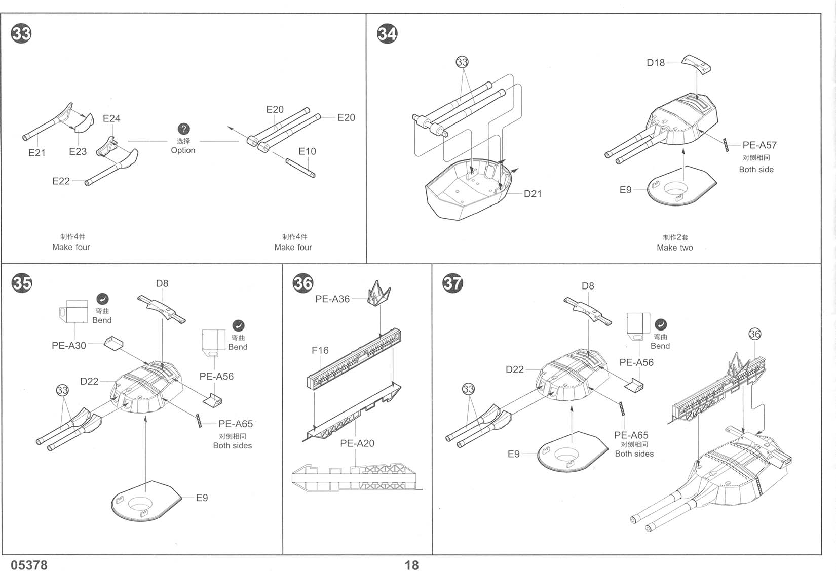There are three photo-etch frets included in the kit, providing all of the deck-edge stanchion required. PE-A has individualized pieces, such as the inclined ladders, crane truss, and pre-sized pieces for certain platforms. PE-B has eight lengths of a standard three-bar railing as well as one section of shorter three-bar railing marked as "PE-B2" that I can find no reference to in the instructions. It's possible that this is meant for the boat deck area on the shelter deck level, but I am not sure. Regardless, there should be sections of two-bar railings for the conning tower level (including the separate pom-pom platforms), the two director platforms on the forward mast, and the incinerator house on the shelter deck immediately aft of the funnel (in between the Pom-Pom platforms but a level down, more or less). This is an OK basic set but leaves room for third parties to step in with more complete sets. |