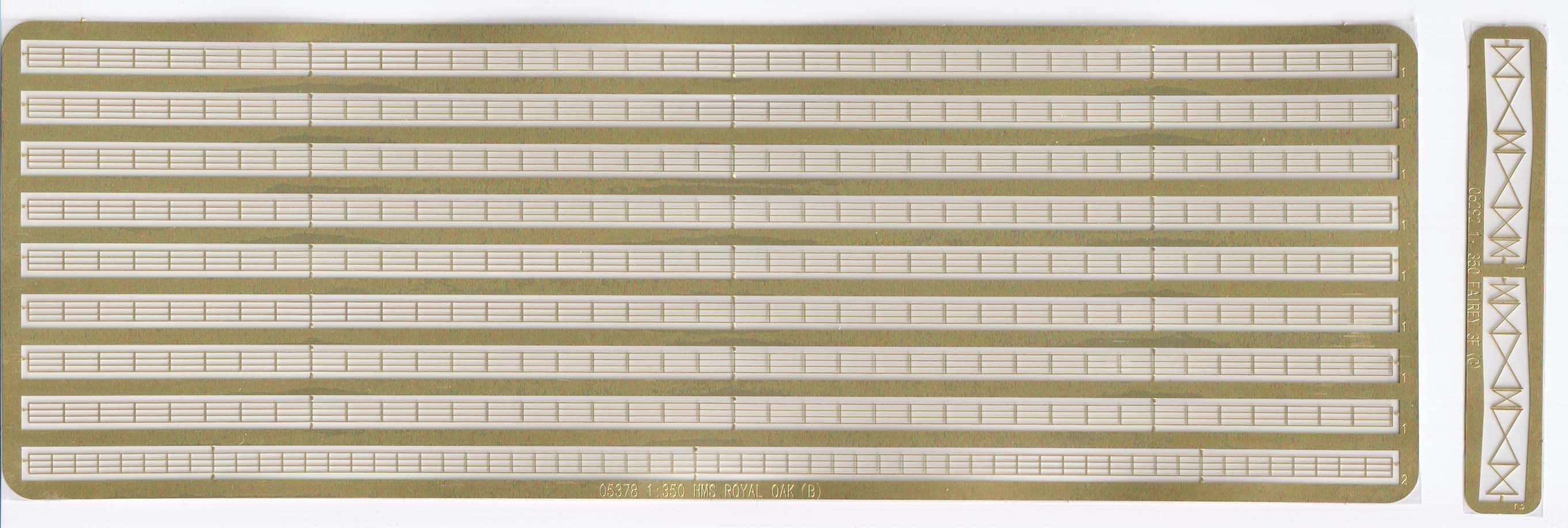 Trumpeter's 1/350th Royal Oak Kit 05378 The Trumpeter 1/350 HMS Royal Oak comes in the typical sturdy Trumpeter cardboard box with the usual painting of the ship on the top. There are over 500 parts on nineteen sprues (thirteen unique), three photo-etch frets, a separate black base, a booklet of instructions, a small decal sheet, and a small length of copper chain. No parts were damaged or had fallen off of the sprue trees when I opened the box. Royal Oak and her sisters were modernized throughout the 1930's and the kit represents Royal Oak after her final refit before the start of the war. This was early in the notion of defense from aerial attacks and this build should be more enjoyable for people who dislike building many anti-aircraft guns (there are a total of four, plus four 3-Pdr Hotchkiss guns). The photo-etch pieces are both a compliment (railings) and integral without plastic alternatives (crane, platform supports, and pieces of the Octuple Pom-Poms), so those without the desire or dexterity to handle photo-etch should take note. Plastic parts breakdown holds no surprises for those who have built a Trumpeter kit before.