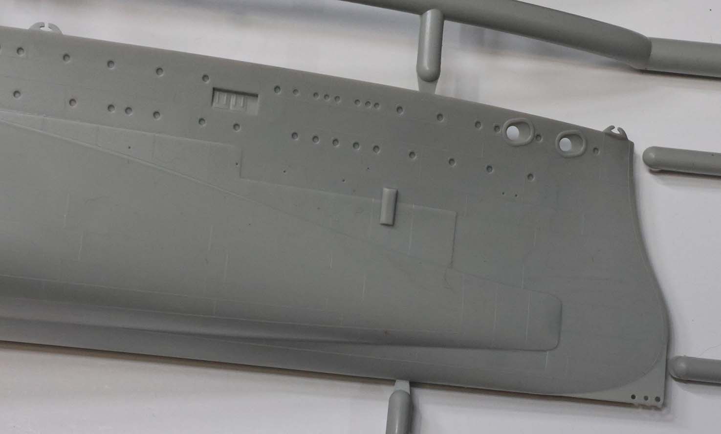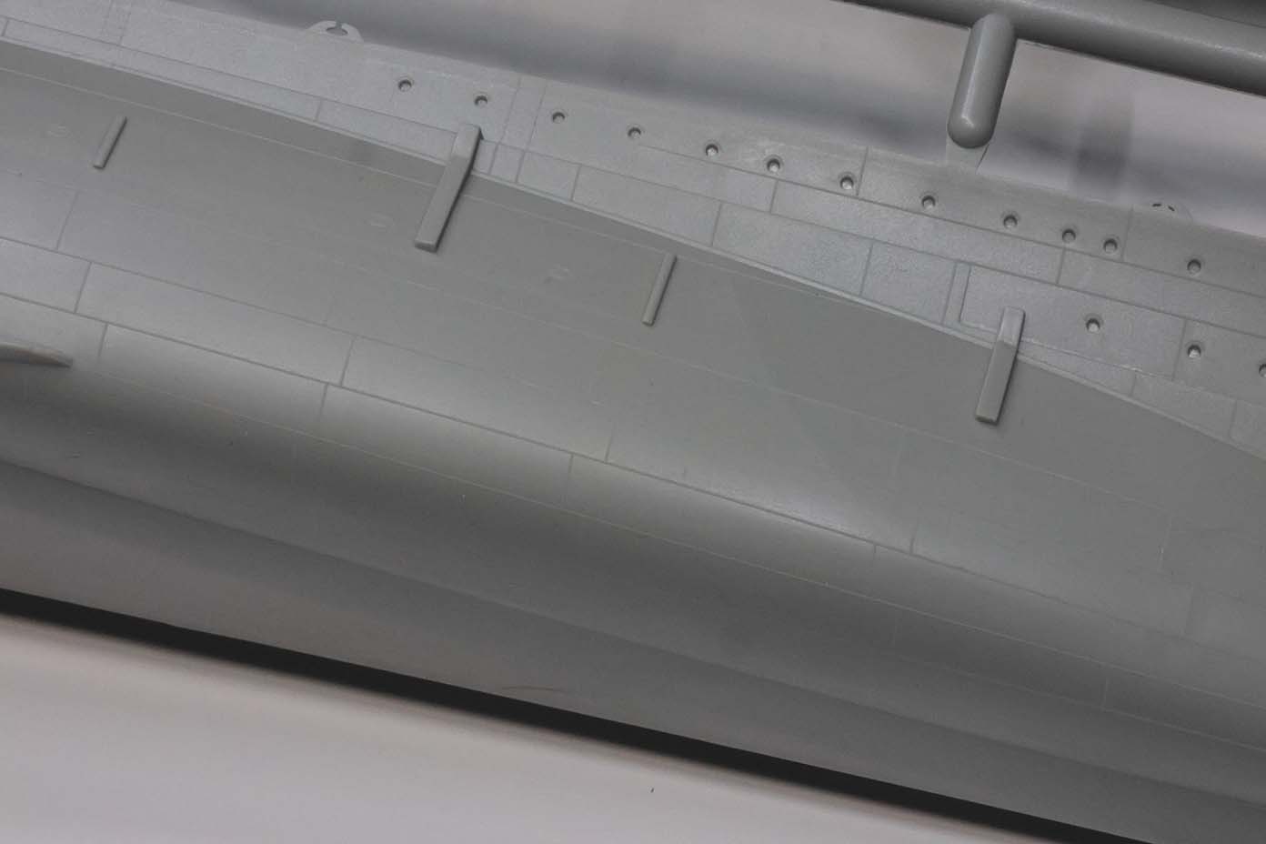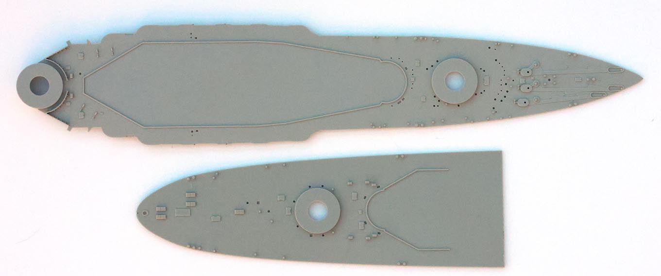 "A" tree has two pieces to make a full-hull rendition of the ship. There are no interior guides molded in to aid in cutting away the portion below the boot topping to create a waterline option. Three stiffening bulkheads are included on the "C" tree (oddly there is no "B" tree) that are probably unnecessary in most cases but may aid in lining up the main deck pieces for some. The attachment points along the deck edge are molded to negate clean up in the deck edge groove whereas the gates on the bottom and stern of the hull are up against the mating surface to protect (non-existent) surface detail. A nice and thoughtful effort largely for nought. Deck edge chocks are thin and hollow and better than earlier releases, but could still benefit from some of the new 3D printed resin offerings. The forefoot paravane skeg has three holes whereas photos of the wreck clearly show two (some independently drawn plans such as Kagero's and the Profile Morskie set show three but the wreck and Royal Navy official plans show two), but this should be trivial to fill in and sand. Portholes are appropriately sized and appear to match the layout of the ship, although I do not have authoritative plans for the port side and did not measure each one. There is a slight oval component to portholes at the very stern, but all told they are crisply molded and look good. The porthole eyebrows are incredibly fine and barely visible in some instances. There is raised hull plating detail molded on the hull; however it is rendered in fairly fine raised lines and not actual raised plates that would be a serious amount of work to remove as in earlier releases (such as the CV-5 / CV-6 kits in 1/350th) for those who choose to do so. Application of these hull plating lines is inconsistent - it is present on the original section of the hull and refitted torpedo blister below the waterline, but not above the blister's waterline. There is no real evidence of multi-part "slide" molding in use on the hull, and the fine lines taper into a total lack of detail on the bottom of the hull a bit after the turn of the bilge. There are no docking keels, sea water intake or exhaust detail on the undersides or hull sides. Likewise, the bilge keels are a bit thick and angle incorrectly (too shallow) and the bottom of the torpedo blisters are a bit simplified, but these are largely in an area that one would want to slap away those getting close enough to actually be able to see this detail. I lack the plans to give a firm review on the shape of the hull, but see enough differences in shape between the kit hull shape and some sectional drawings from the National Maritime Museum of Greenwich that I hope someone comes along with more plans and can give us a more in-depth review. I suspect that there are very few at this point that could point out shape discrepancies, if they exist, and will end with "it certainly looks like Royal Oak's hull based on the photos I have seen." |