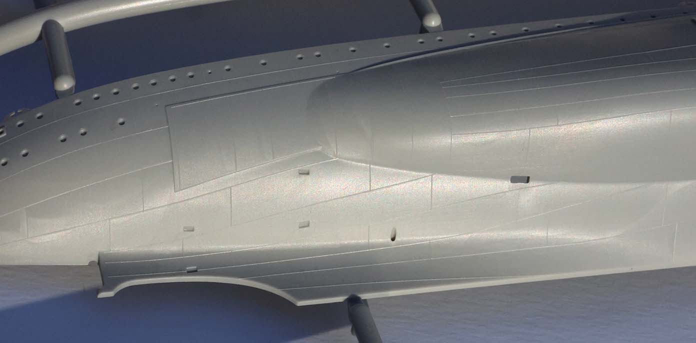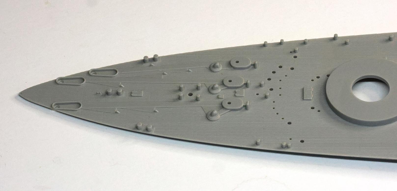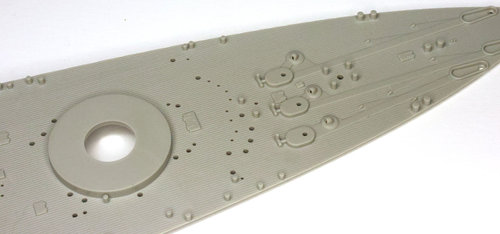 "A" tree has two pieces to make a full-hull rendition of the ship. There are no interior guides molded in to aid in cutting away the portion below the boot topping to create a waterline option. Three stiffening bulkheads are included on the "C" tree (oddly there is no "B" tree) that are probably unnecessary in most cases but may aid in lining up the main deck pieces for some. The attachment points along the deck edge are molded to negate clean up in the deck edge groove whereas the gates on the bottom and stern of the hull are up against the mating surface to protect (non-existent) surface detail. A nice and thoughtful effort largely for nought. Deck edge chocks are thin and hollow and better than earlier releases, but could still benefit from some of the new 3D printed resin offerings. The forefoot paravane skeg has three holes whereas photos of the wreck clearly show two (some independently drawn plans such as Kagero's and the Profile Morskie set show three but the wreck and Royal Navy official plans show two), but this should be trivial to fill in and sand. Portholes are appropriately sized and appear to match the layout of the ship, although I do not have authoritative plans for the port side and did not measure each one. There is a slight oval component to portholes at the very stern, but all told they are crisply molded and look good. The porthole eyebrows are incredibly fine and barely visible in some instances. There is raised hull plating detail molded on the hull; however it is rendered in fairly fine raised lines and not actual raised plates that would be a serious amount of work to remove as in earlier releases (such as the CV-5 / CV-6 kits in 1/350th) for those who choose to do so. Application of these hull plating lines is inconsistent - it is present on the original section of the hull and refitted torpedo blister below the waterline, but not above the blister's waterline. There is no real evidence of multi-part "slide" molding in use on the hull, and the fine lines taper into a total lack of detail on the bottom of the hull a bit after the turn of the bilge. There are no docking keels, sea water intake or exhaust detail on the undersides or hull sides. Likewise, the bilge keels are a bit thick and angle incorrectly (too shallow) and the bottom of the torpedo blisters are a bit simplified, but these are largely in an area that one would want to slap away those getting close enough to actually be able to see this detail. I lack the plans to give a firm review on the shape of the hull, but see enough differences in shape between the kit hull shape and some sectional drawings from the National Maritime Museum of Greenwich that I hope someone comes along with more plans and can give us a more in-depth review. I suspect that there are very few at this point that could point out shape discrepancies, if they exist, and will end with "it certainly looks like Royal Oak's hull based on the photos I have seen." |