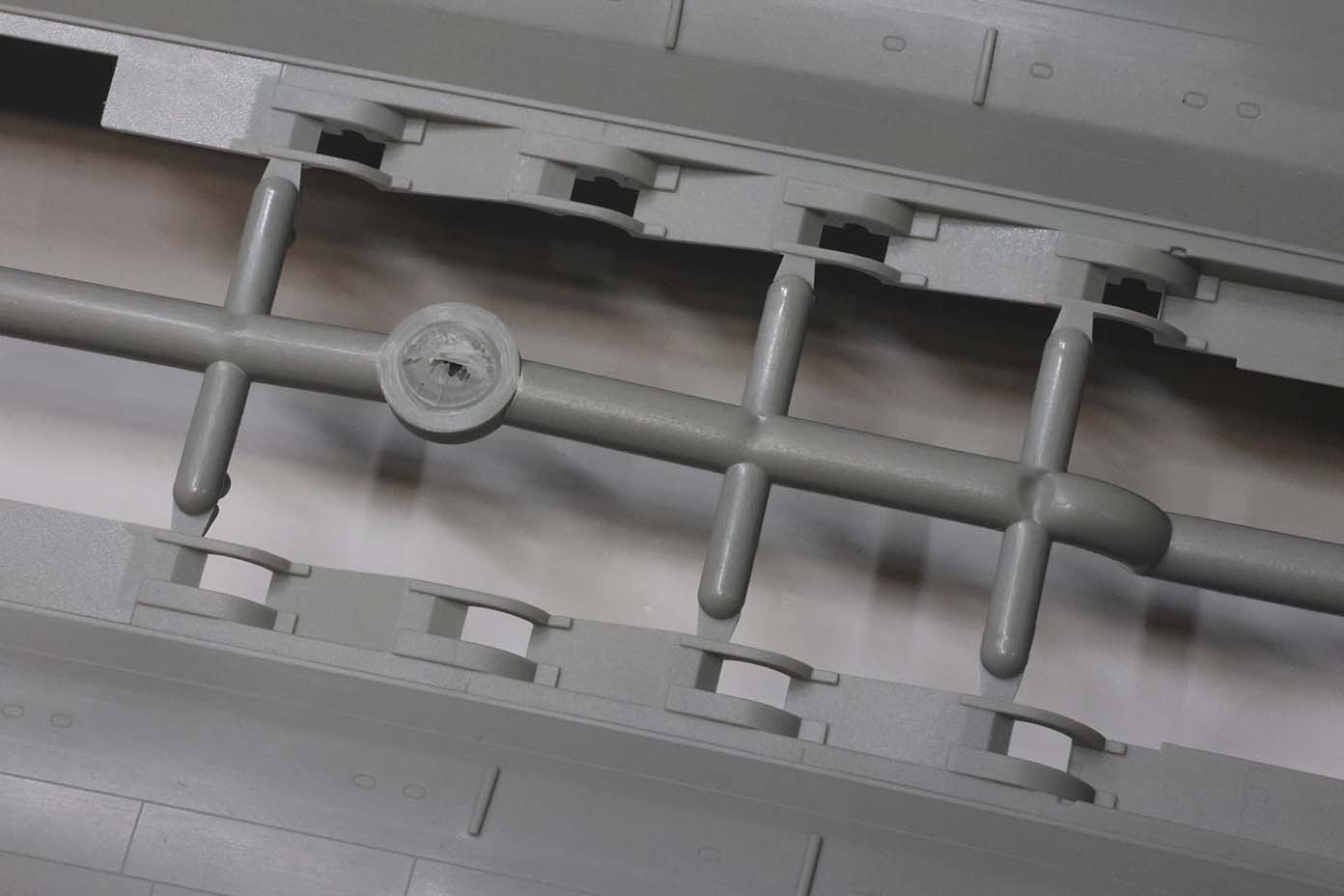 | SPRUE C Transverse interior supports, prop shafts and struts, funnel, armored conning tower, and some ship's boats |