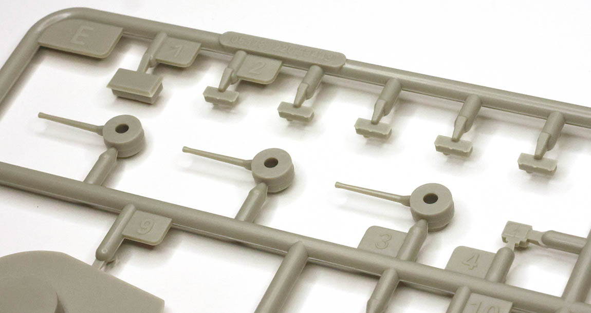 The four "E" trees complete the main armament details and contain most of the secondary armament and some miscellaneous details. There are pieces provided for the 15" barrels both with bloomers and without. The barrels are at one edge of the tree, allowing them to be slide molded so that the 15" muzzle is hollow and does not need to be drilled by the builder. The versions without the bloomers (also known as "blast bags") are positionable whereas the option with has the barrels fixed and close to a 0 degree elevation. The 6" secondary battery are molded on a horizontal ring allowing the builder to position them how they wish in train but are not slide molded for the open muzzle (however at .8 mm it will be hard to tell). The twin QF 4-Inch mount is comprised of five pieces - the base, two carriage columns, the twin 4" gun barrels as a single piece, and the mount shield. The mount is a touch basic, with the fuse setting equipment at the corner of each platform missing, but the builder can add a reasonable facsimile with some thin sheet or strip styrene or replace the guns with 3D printed resin offerings. An interesting feature is that the anchor is in two pieces, with the shank separate from the crown and flukes. This will presumably make it a bit easier to fit the shank through the hawse pipes in the hull pieces to the openings in the main deck piece. Four are provided due to the nature of four sprues and three are used on the bow - however a fourth was also carried on the shelter deck between and underneath the two 50' Steam Pinnaces and is not referenced in the instructions. The builder can either keep a spare or add an extra detail that few will see unless doing a waterline version with boats over the side. There are five horizontal deck lockers (E2) on each tree with fine detail for the latches - however each is anchored to the tree with a large sprue gate attachment that will require careful clean up to preserve detail. The provided paravanes look decent, however the searchlights are a bit thin, short, and have a slight depression on the face that may make treatment with a wash a bit harder to look as desired. |