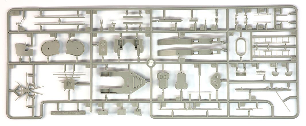 Tree F arrives completely wrapped in protective foam inside its plastic sleeve. There are a lot of masts and platforms with yardarms and other thin detail pieces on this tree. There is slight flash on some pieces in my kit, but nothing egregious. There are a couple of superstructure decks and bulkheads as well and by and large Trumpeter arranged them to leave any the knocking pin marks on the bottoms of the platforms out of sight. The searchlight platform (F12) has decently thin splinter shields, however it is flipped from the other platforms and has a few minor knocking pin marks on the deck that may be noticeable enough for some to want to fix. Two of the platforms have angled support pieces molded on the underside in plastic and two have alignment lines molded in to aid with the placement of photo-etch supports. There are some nice, subtle hatches on the top of the spotting top and 15" and 6" gun director platforms. Parts F6 and F7 are garbage chutes for the hull and look like they should fit over something, however there are instead very subtle lines on the sides of the hull that should guide placement (the instructions are a wee bit vague). |