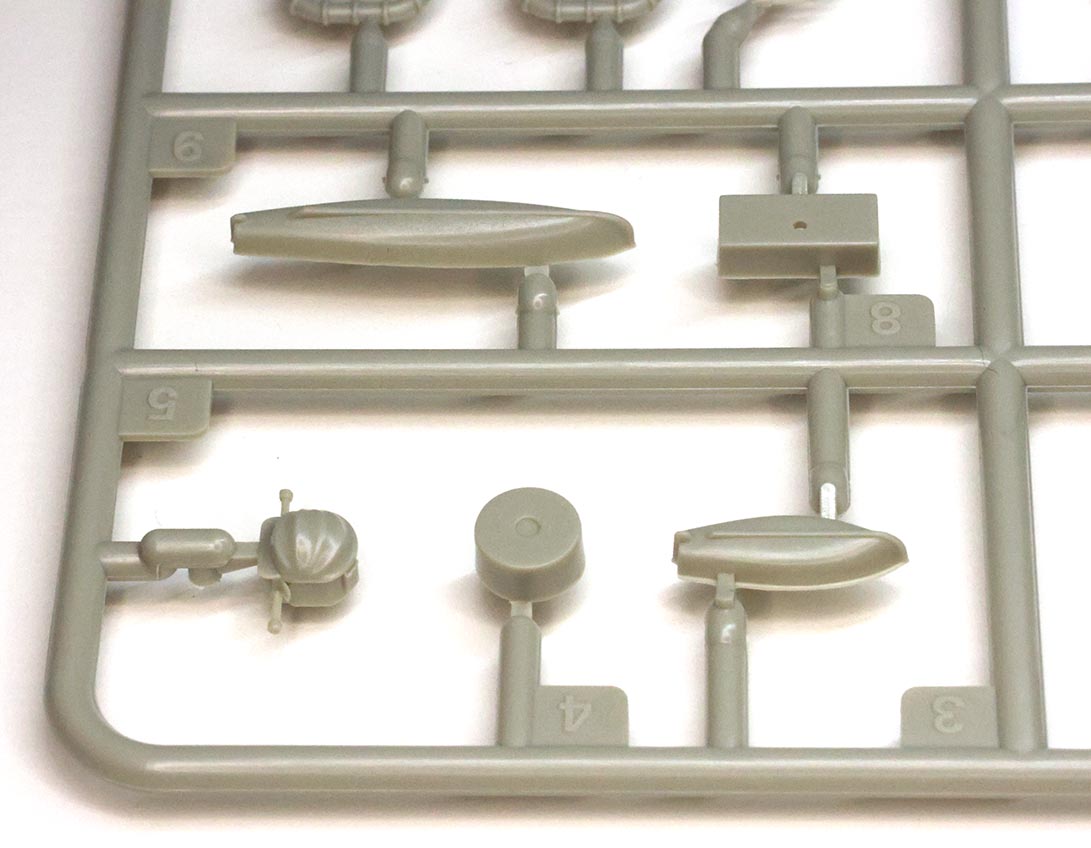 | The two "H" trees are similar to the two "D" trees in that they are together in a protective bag and partially, but not completely, wrapped in protective foam. There are a number of small details on each; such as vents, hawser reels, and booms as well as a HACS Mk III director, Hotchkiss 3-pdr and quad Vickers .50 cal machine guns. The detail on the 30' gig, 16' dinghy's, and carley floats is good, although there is a slight knocking pin mark inside near the stern on the 30' gig that might become more pronounced if one uses a wash to pick out the internal details. 4" ammo lockers for the QF guns are provided on this tree and there are knocking pin marks on the back - most of the lockers are positioned on deck such that this won't be an issue but there are few that will be visible. I think it would be easiest to use some Mr. Surfacer to fill the depressions and sand the backs while still on the parts tree before removing them given the size of the parts and size of the connection gate. | |||||||||||||||||||||||||