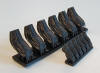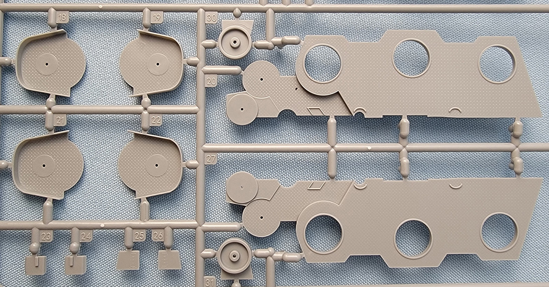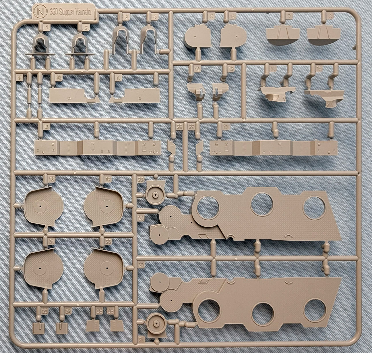 | This sprue carries structures to replace those on sprue E. Comprised of the bulkheads and decks that serve as the base for the enclosed twin 10cm turrets surrounding the central superstructure, along with individual bases for the open twin 10cm mounts and enclosed twin 40mm mounts that are mounted higher in the central superstructure. Parts are sharply molded with lots of treading on the deck areas. | ||||||||||||||||||||||||||||