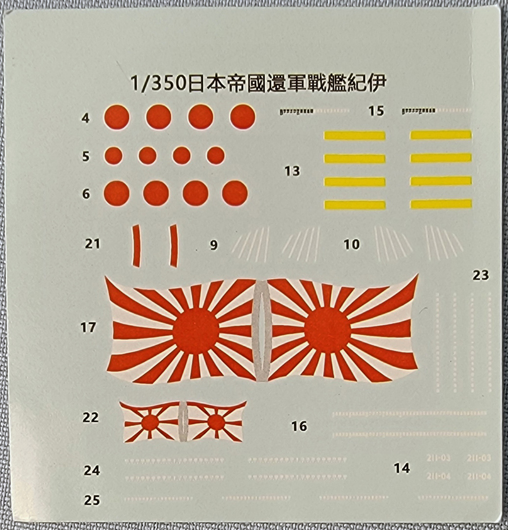 At first glance, the decal sheet appears to be the same as those included with the Veryfire Yamato and Musashi kits, but there are differences, particularly the aircraft tail codes. |