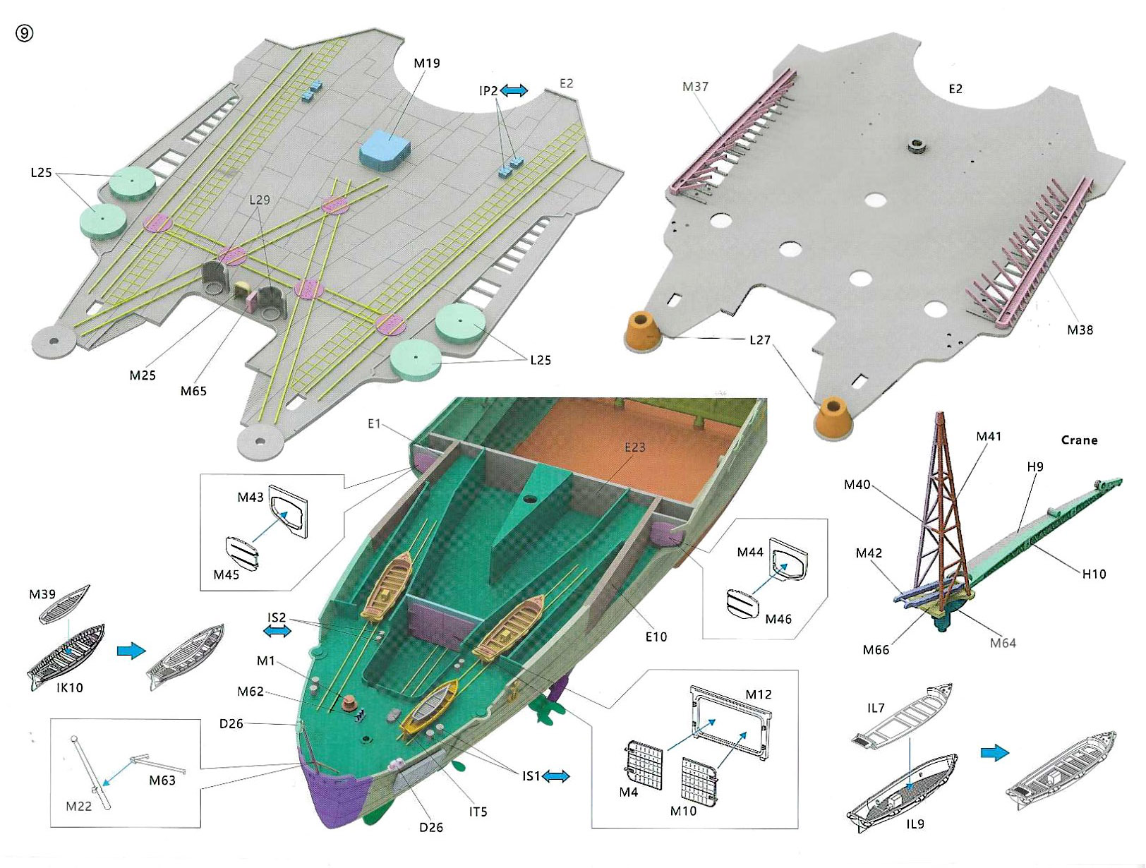 superstructure railings, crane boom, trestles and supports, small masts,
