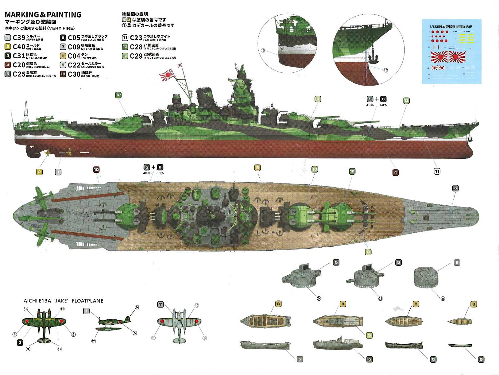 The color plate page shows Kii in an imaginary two tone green plus gray camouflage scheme that’s vaguely reminiscent of the immobilized Takao and Myoko at Singapore in 1945. It appears to be very similar to the scheme worn by this design in the World of Warships online game. Color schemes for the ship’s boats and aircraft occupy the bottom of the page. Colors are keyed to an unidentified paint line which is likely Gunze Sangyo; the color callouts seem correct. The decals are coded by number and laid out accordingly on the illustrations in a straightforward manner. |
